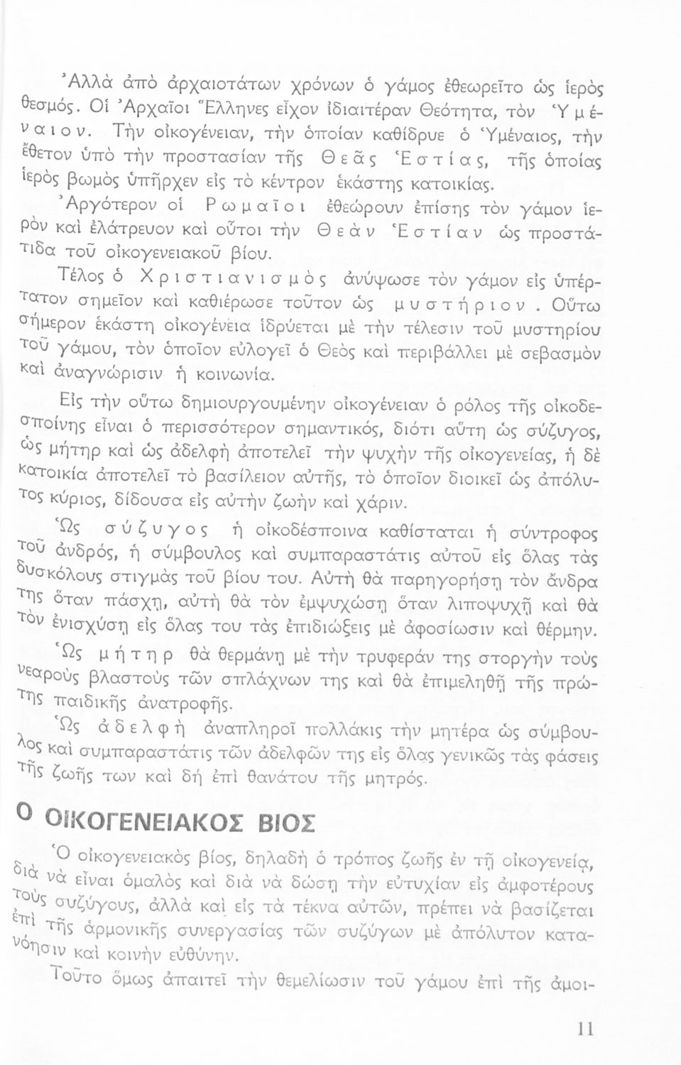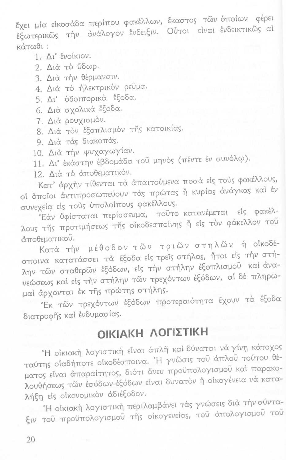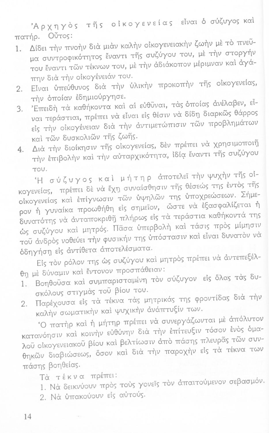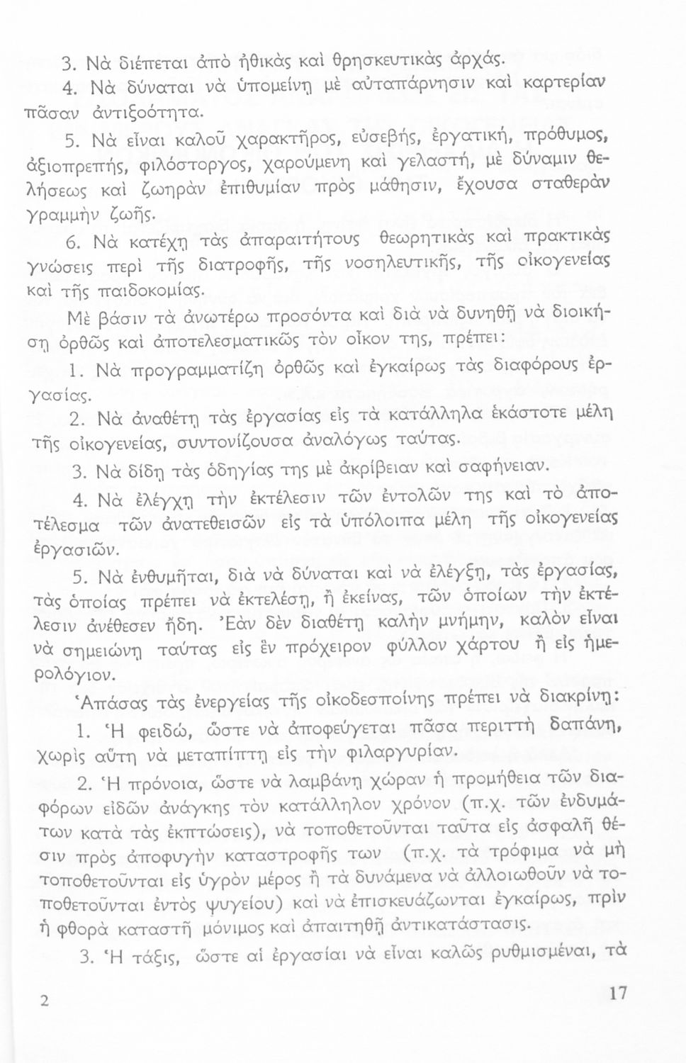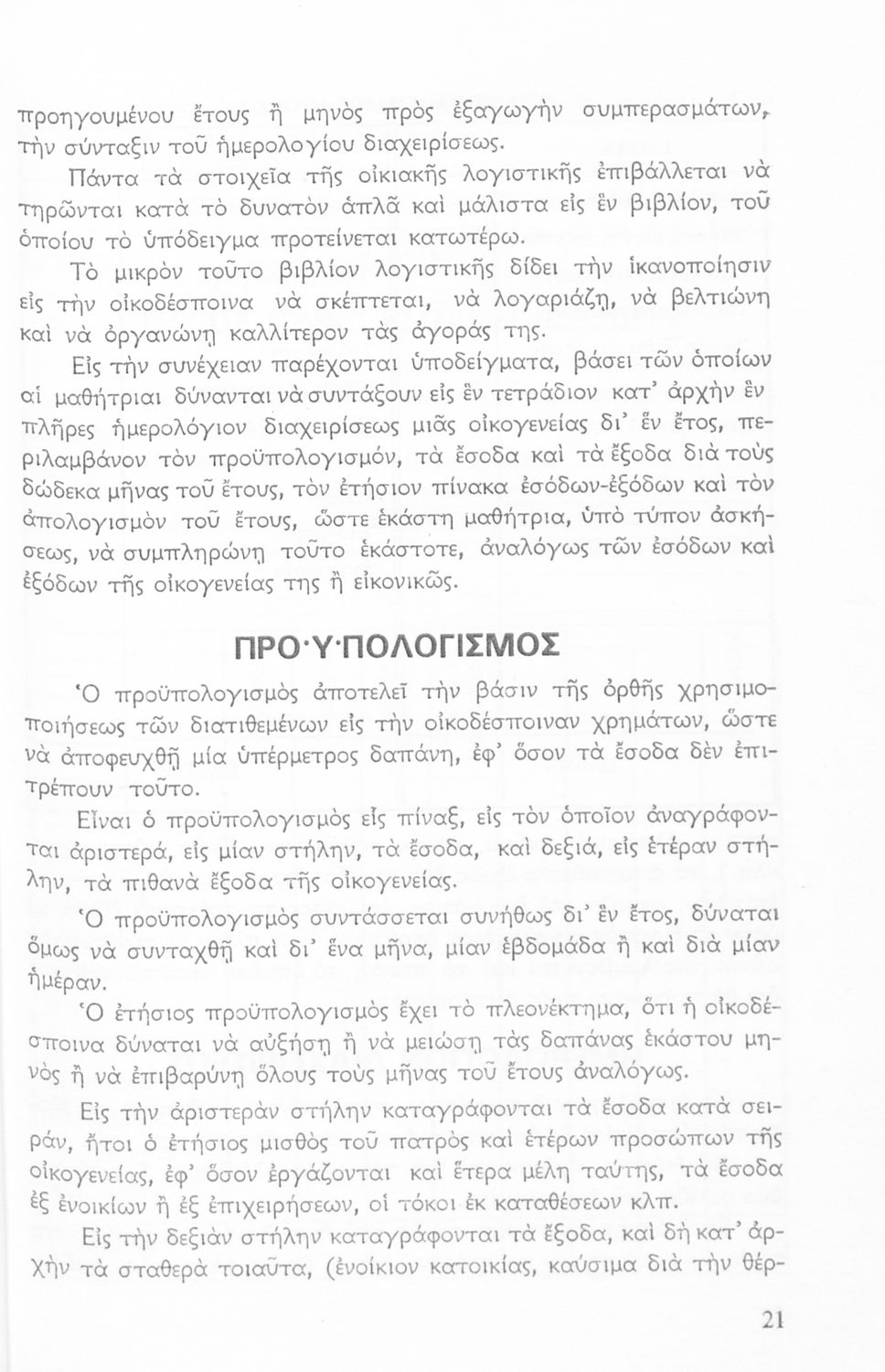 Σχολικό εγχειρίδιο της Ε΄ Τάξης του Γυμνασίου Θηλέων για το μάθημα των Οικοκυρικών. Αναφέρεται στο θεσμό της οικογένειας, τους ρόλους και τις αρμοδιότητες κάθε μέλους της. Συνεχίζει με την παιδοκομία, βρεφοκομία αναφέρεται από τον τοκετό, τη γέννηση και την ανατροφή του βρέφους, την ανάπτυξή του και τις παιδικές ασθένειες κ.α.