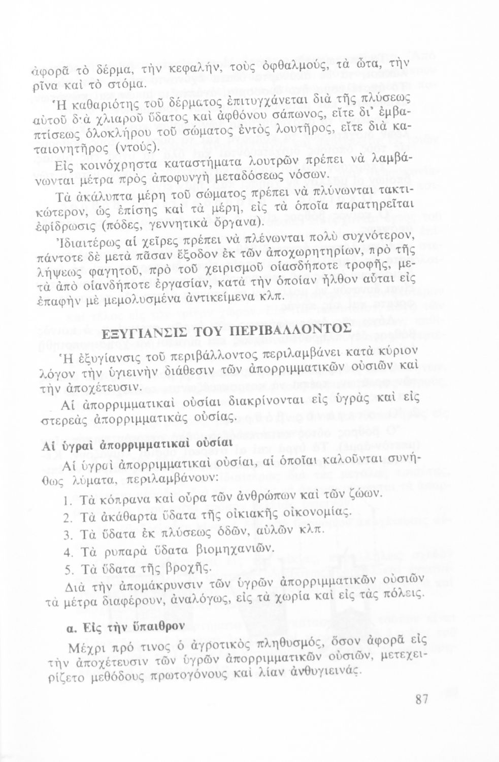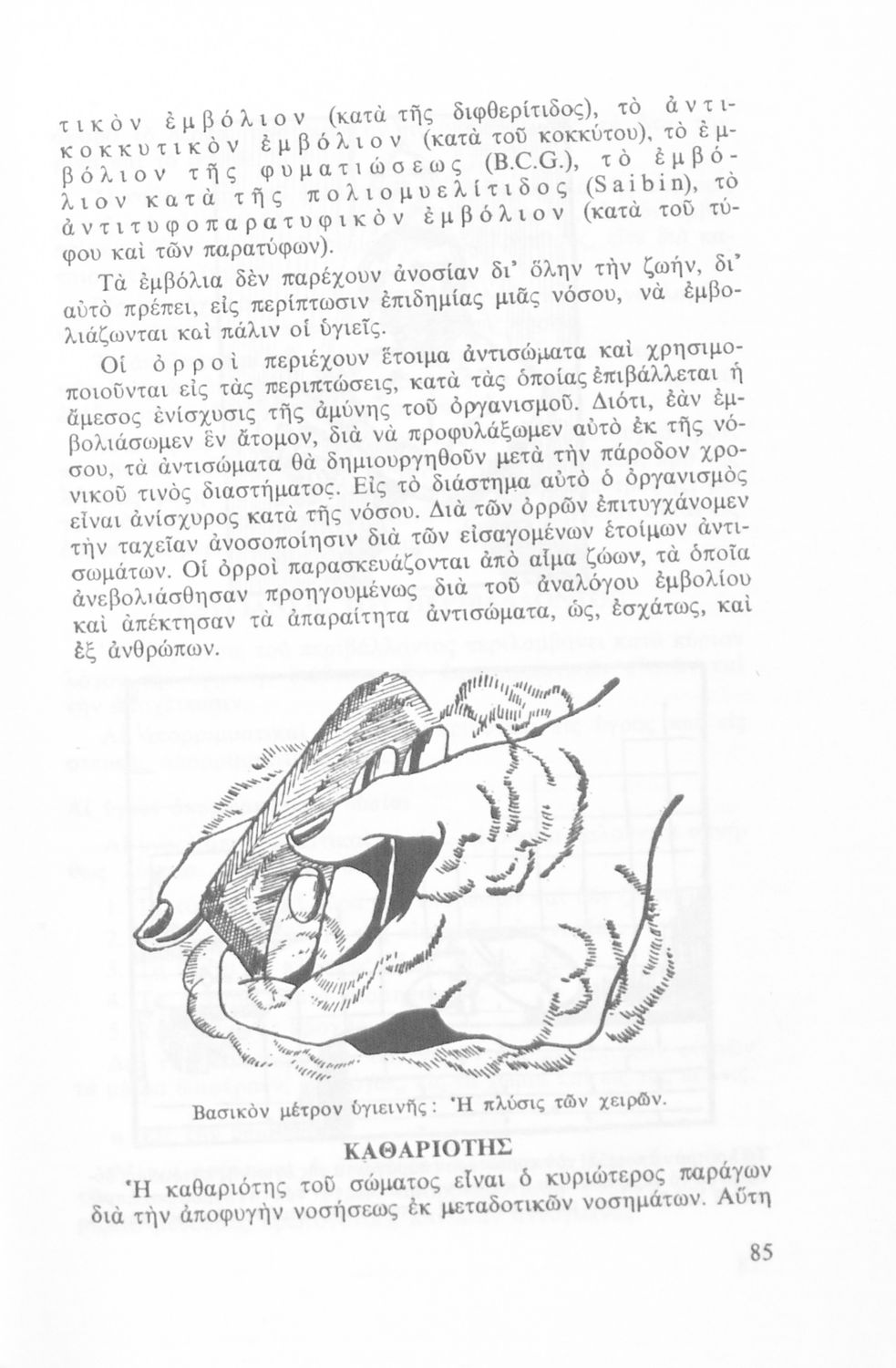Σχολικό εγχειρίδιο Υγιεινής για τους μαθητές της Β' τάξης του Γυμνασίου. Το βιβλίο αναφέρεται στις συνθήκες και τις αιτίες που επηρεάζουν την υγεία του ατόμου ή μιας ομάδας ατόμων και παρουσιάζει τα μέτρα που πρέπει να ληφθούν για την ανάκτηση και διατήρηση της υγιεινής των ανθρώπων. Πιο συγκεκριμένα αναφέρεται στην επίδραση της ατμόσφαιρας, του νερού, των λοιμωδών νοσημάτων αλλά και της κληρονομικότητας.