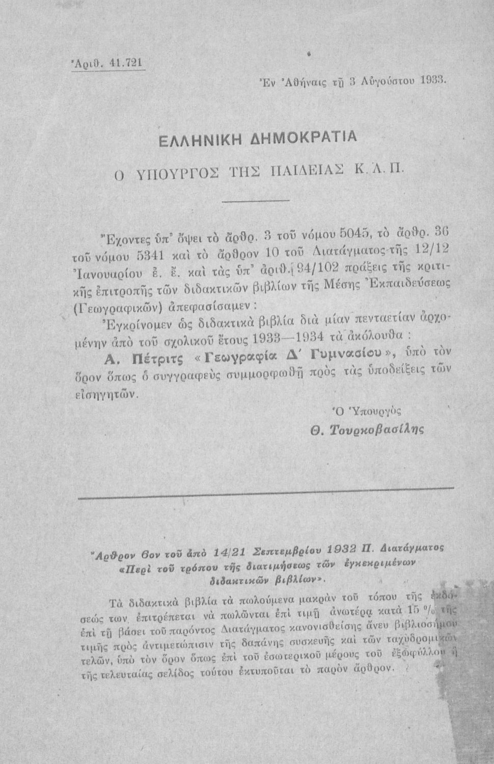 Υπουργική απόφαση / Σύμβαση: 41721/3-8-1933