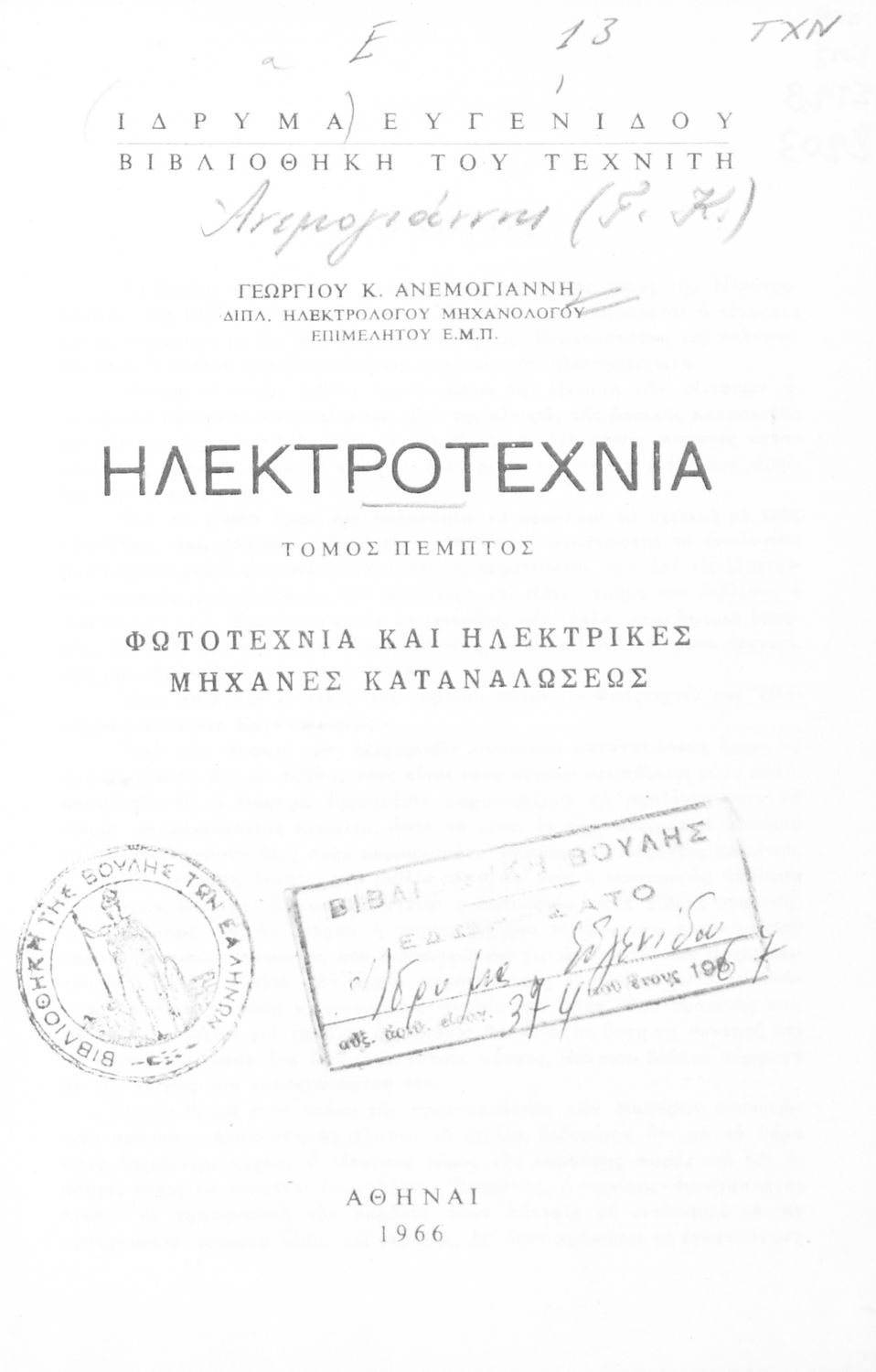 Τίτλος: Ηλεκτροτεχνία, Τόμος πέμπτος, Φωτοτεχνία και ηλεκτρικές μηχανές καταναλώσεως