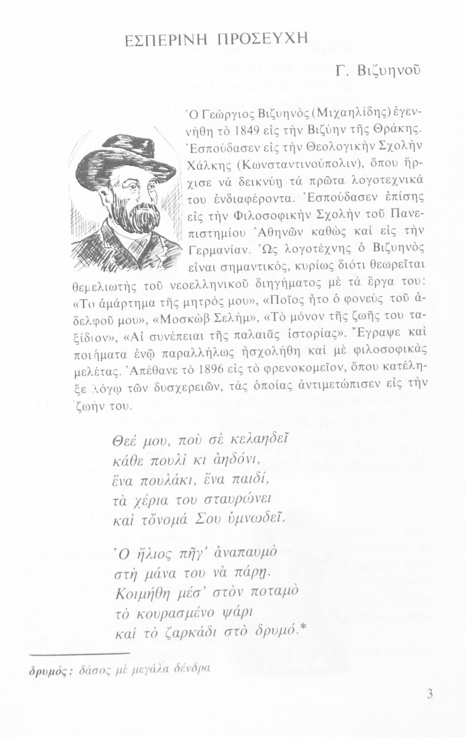 Σχολικό εγχειρίδιο Νέων Ελληνικών Γ΄ Γυμνασίου που περιλαμβάνει ποιήματα και πεζά Ελλήνων συγγραφέων και δημοτικά τραγούδια εμπνευσμένα από την ελληνική φύση και τη ζωή στην ύπαιθρο, την οικογενειακή και ...