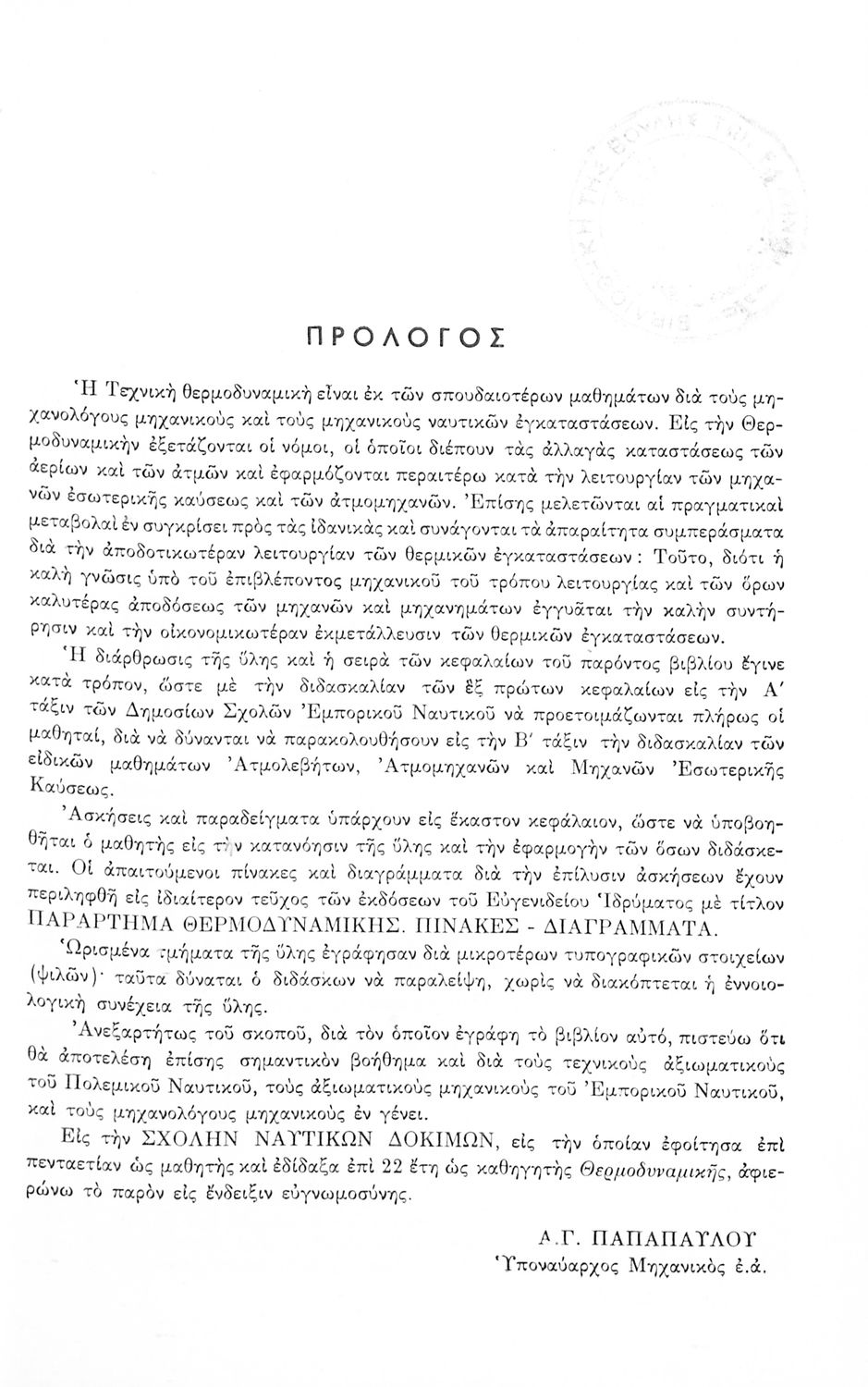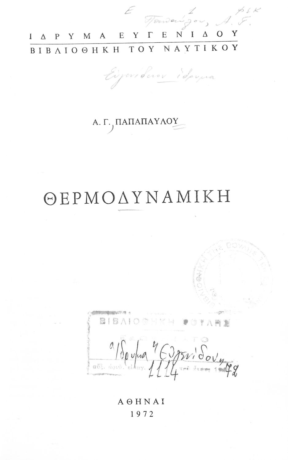 Σχολικό εγχειρίδιο Θερμοδυναμικής για τις Δημόσιες Σχολές του Υπουργείου Εμπορικής Ναυτιλίας που περιέχει ασκήσεις και θεωρία, πίνακες και διαγράμματα