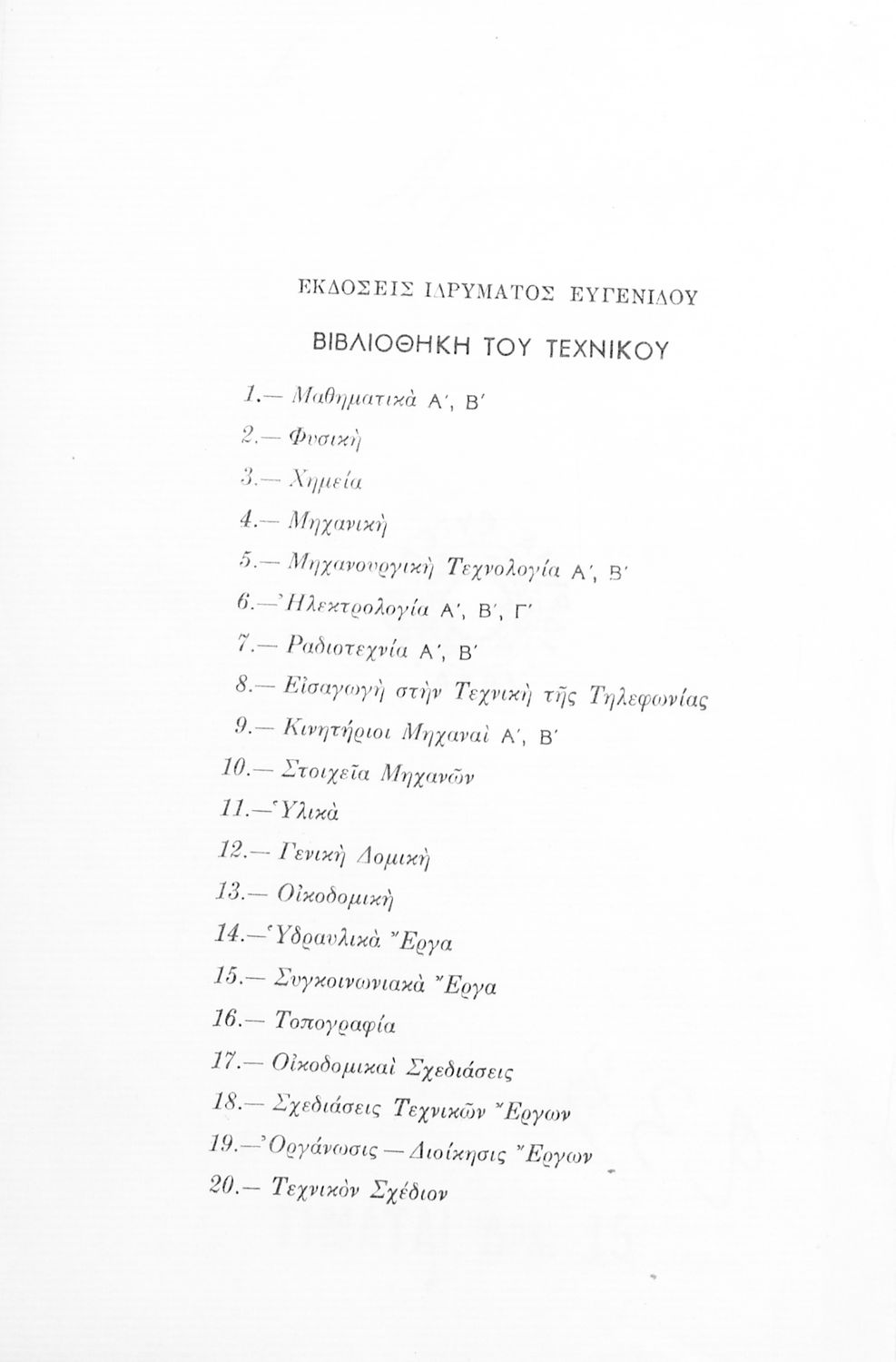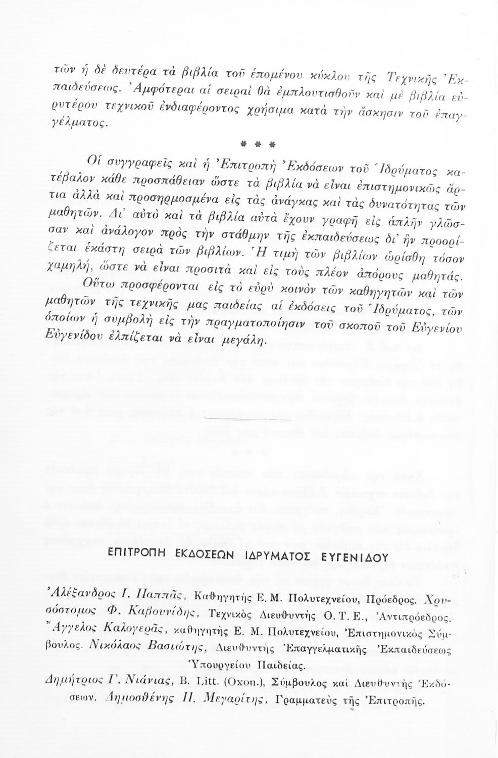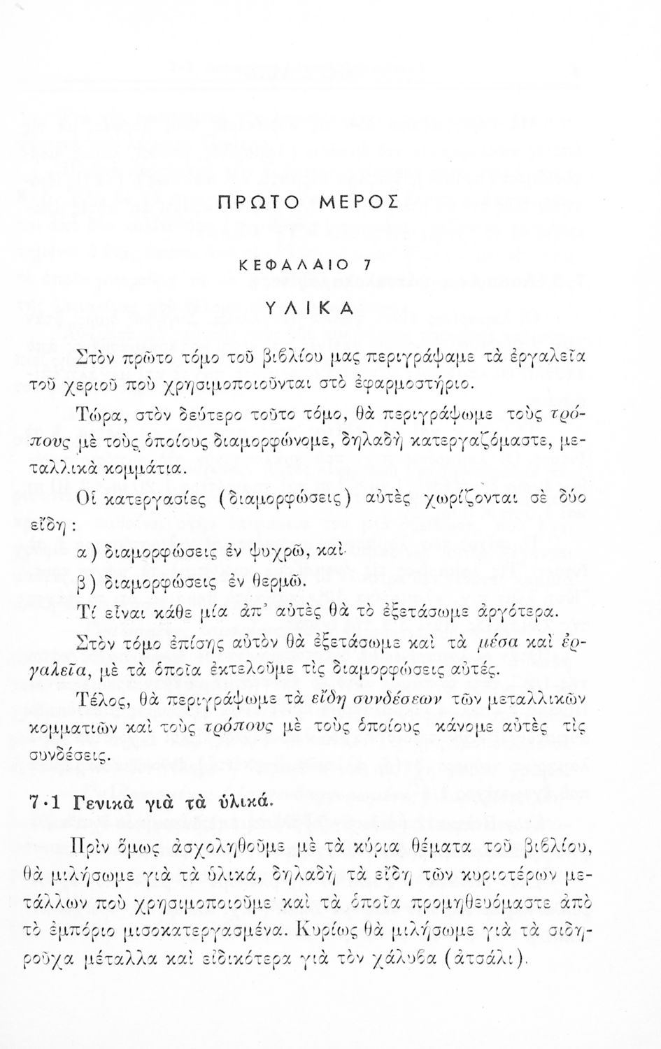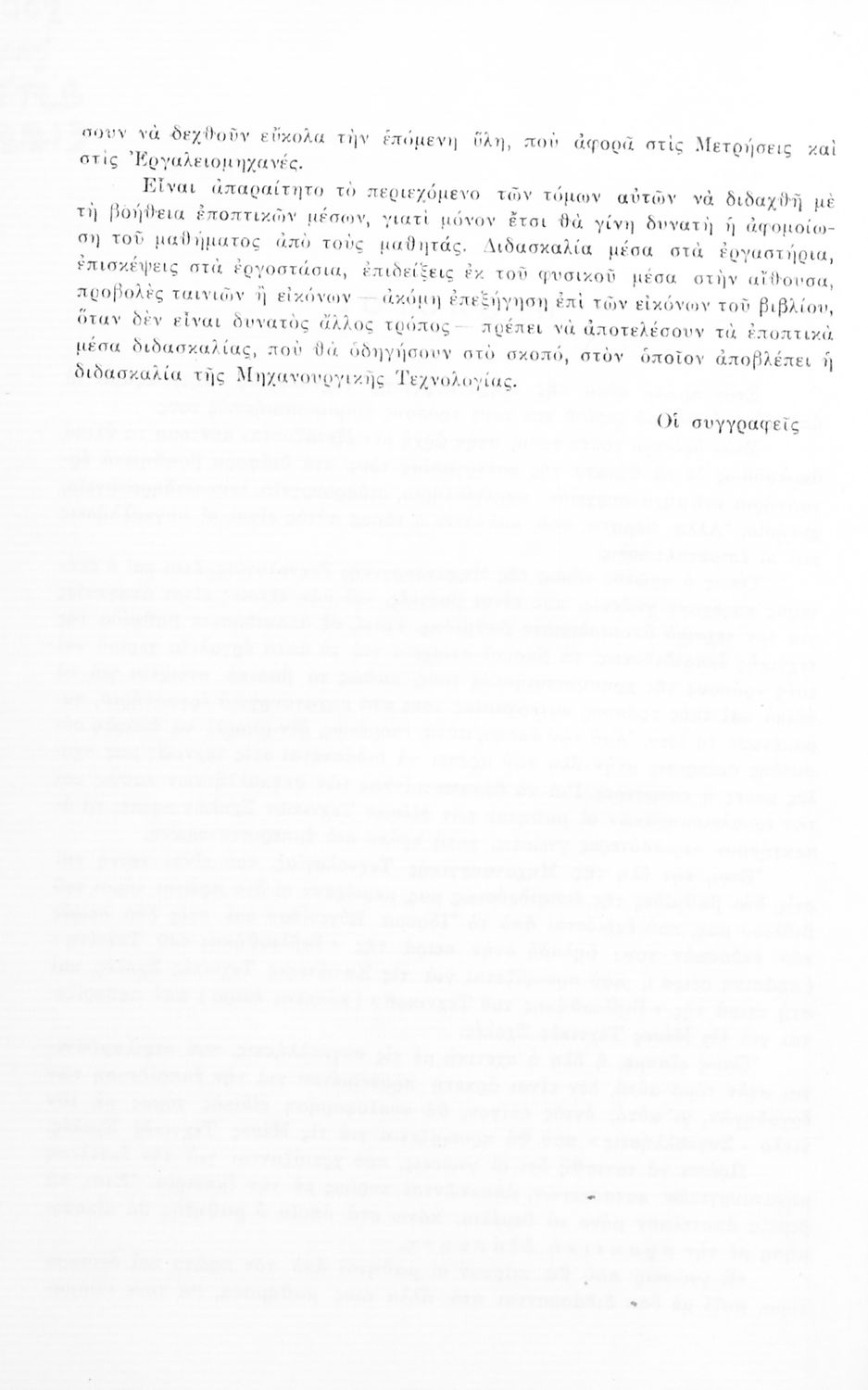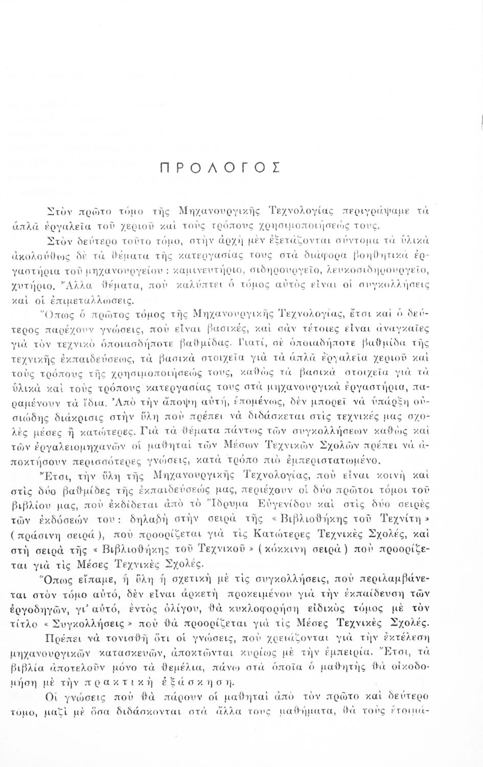 Σχολικό εγχειρίδιο Μηχανουργικής και Τεχνολογίας για τους μαθητές του Γυμνασίου. Εισάγει τους μαθητές στις βασικές αρχές μηχανικής. Είναι χωρισμένο σε 15 κεφάλαια. Αρχίζει με τα βασικά εργαλεία και τον τρόπο χρήσης τους και συνεχίζει παρουσιάζοντας βασικά υλικά όπως ο σίδηρος και το ξύλο και δείχνει τον τρόπο με τον οποίο χρησιμοποιούνται στα διάφορα εργαστήρια. Το βιβλίο απευθύνεται σε μαθητές τεχνικών σχολών ή για αυτούς οι οποίοι προορίζονται για τεχνικές σχολές.