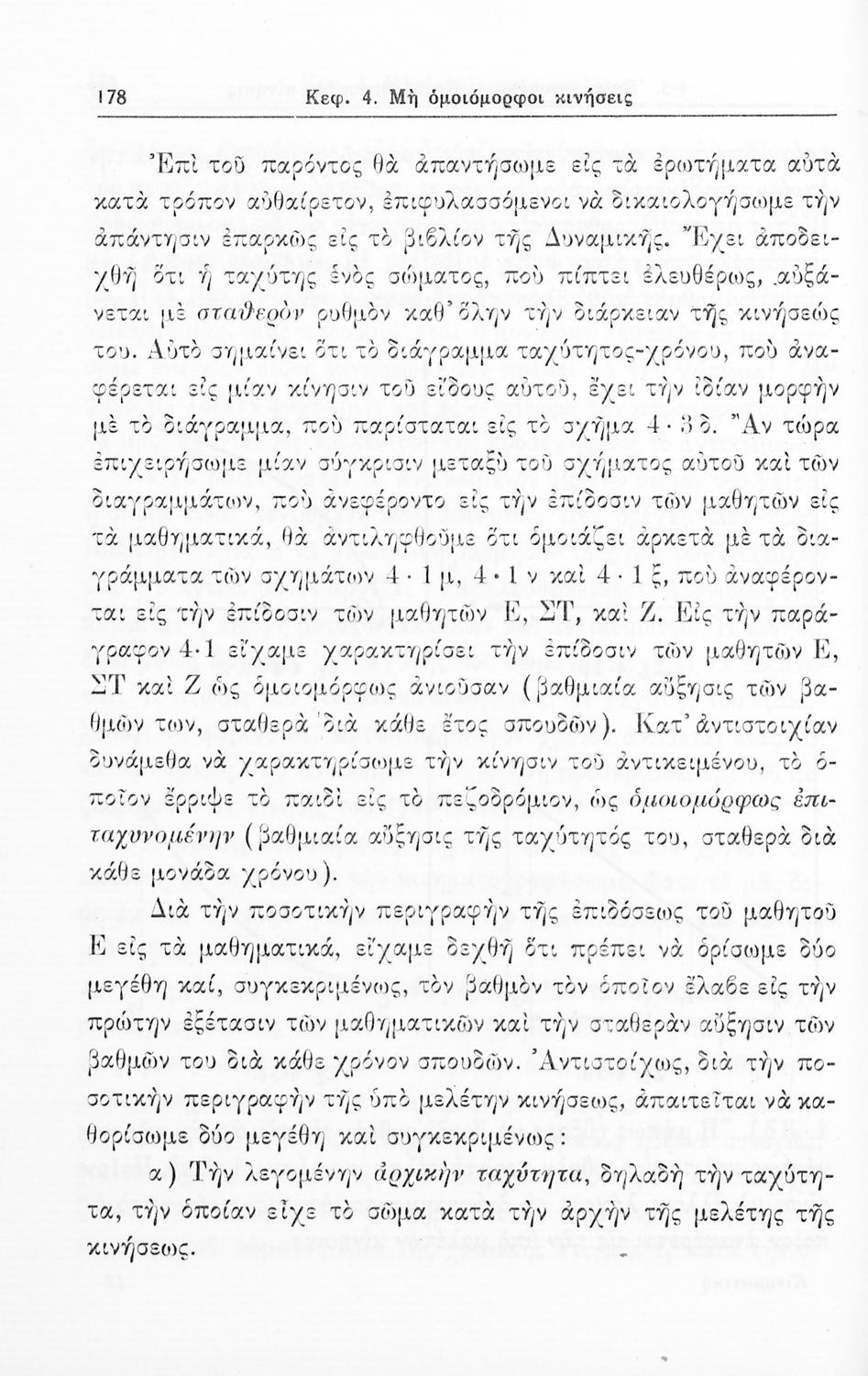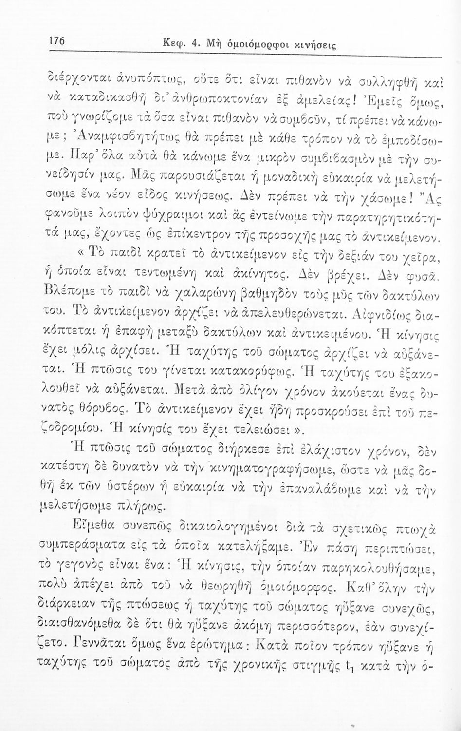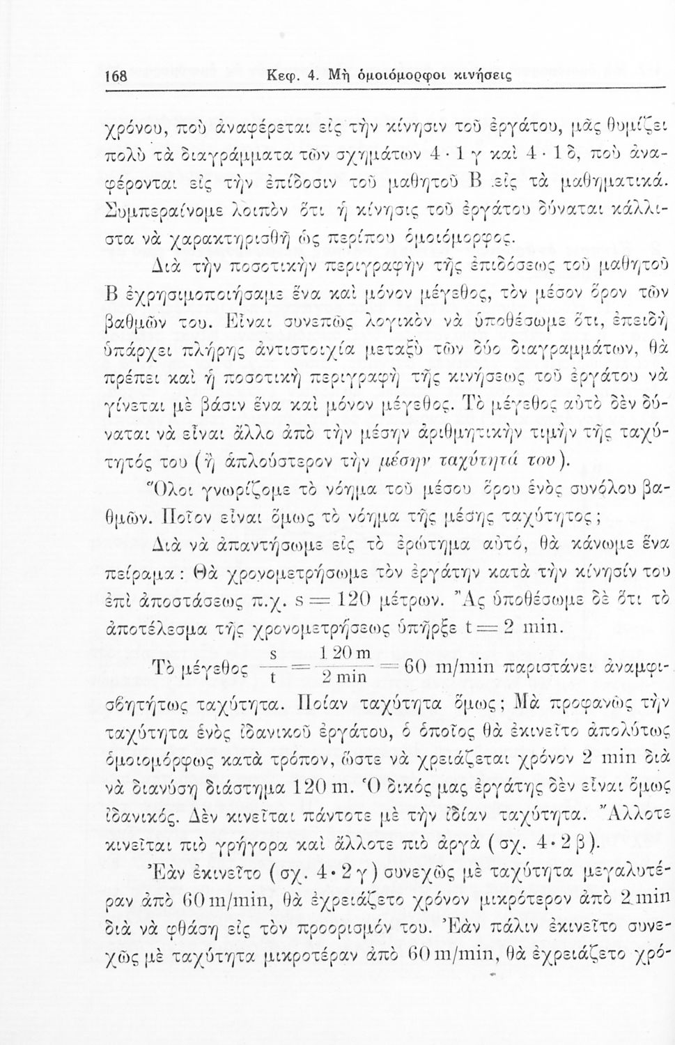 Σχολικό εγχειρίδιο Μηχανικής για τους μαθητές Γυμνασίου. Παρουσιάζει διάφορα είδη κινήσεων και δείχνει ζητήματα υπολογισμού όπως για παράδειγμα, ομοιόμορφες κινήσεις, επιταχυνόμενη-επιβραδυνόμενη κίνηση καθώς και σύνθετες κινήσεις οι οποίες συνδυάζουν τα παραπάνω χαρακτηριστικά. Επιπλέον, εξετάζει και κινήσεις διαφορετικών μηχανών όπως είναι οι κινήσεις τροχαλίας και ιμάντων, αλλά και κινήσεις ανθρώπων και αυτοκινήτων. Μελετά ζητήματα επιτάχυνσης και μεταβολής της κίνησης.
