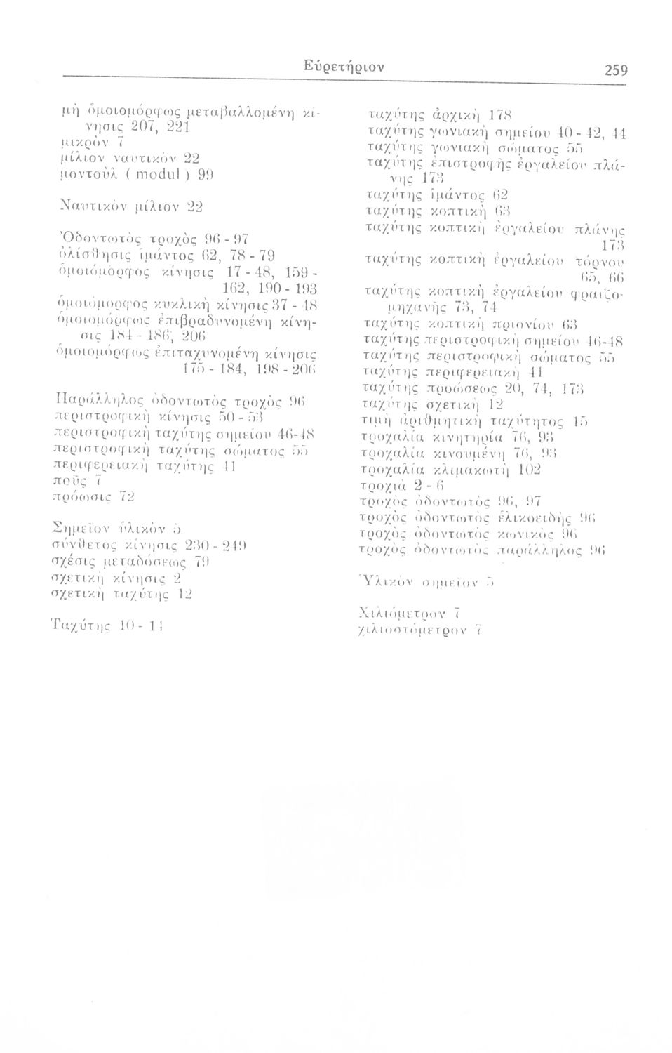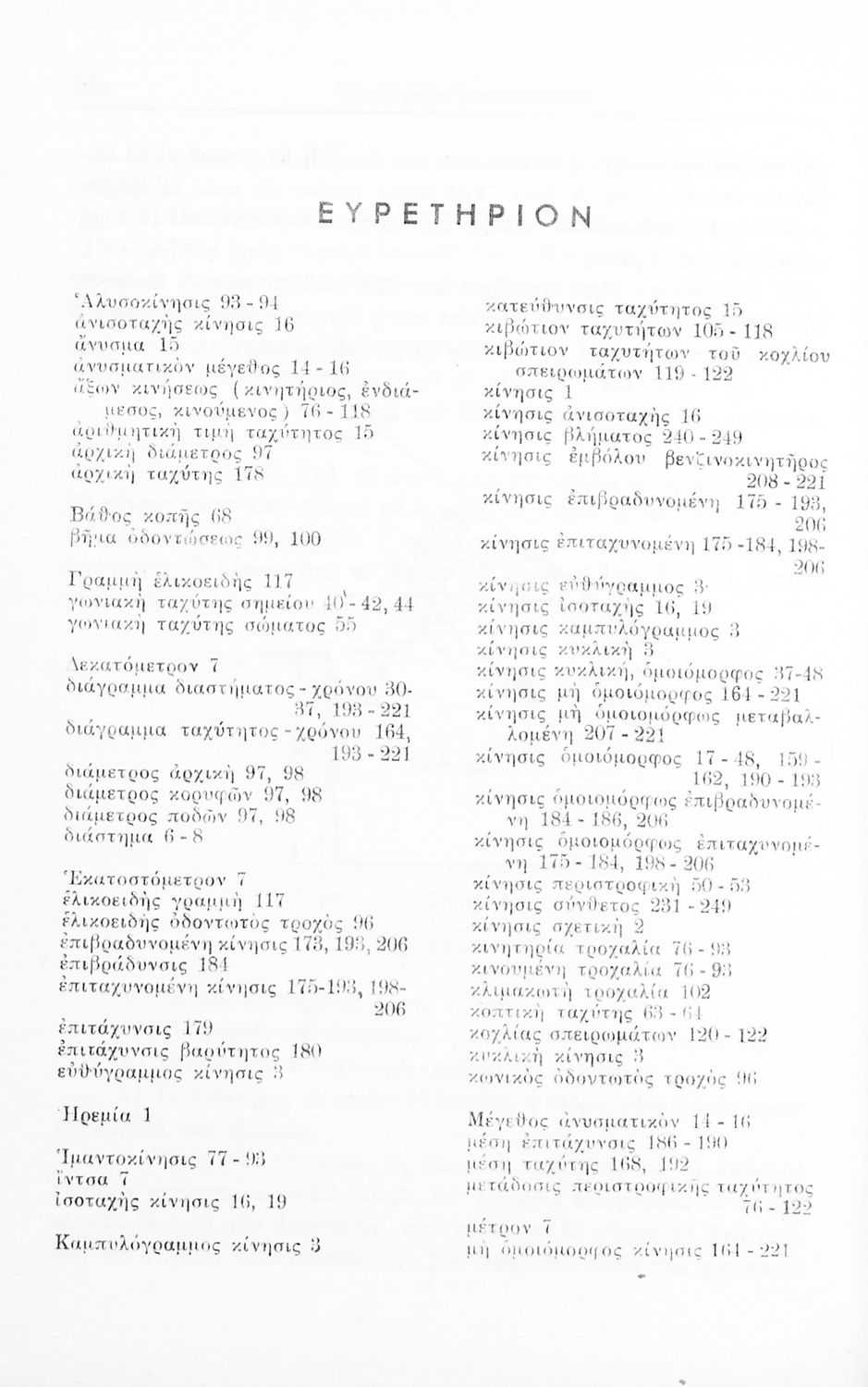 Σχολικό εγχειρίδιο Μηχανικής για τους μαθητές Γυμνασίου. Παρουσιάζει διάφορα είδη κινήσεων και δείχνει ζητήματα υπολογισμού όπως για παράδειγμα, ομοιόμορφες κινήσεις, επιταχυνόμενη-επιβραδυνόμενη κίνηση καθώς και σύνθετες κινήσεις οι οποίες συνδυάζουν τα παραπάνω χαρακτηριστικά. Επιπλέον, εξετάζει και κινήσεις διαφορετικών μηχανών όπως είναι οι κινήσεις τροχαλίας και ιμάντων, αλλά και κινήσεις ανθρώπων και αυτοκινήτων. Μελετά ζητήματα επιτάχυνσης και μεταβολής της κίνησης.