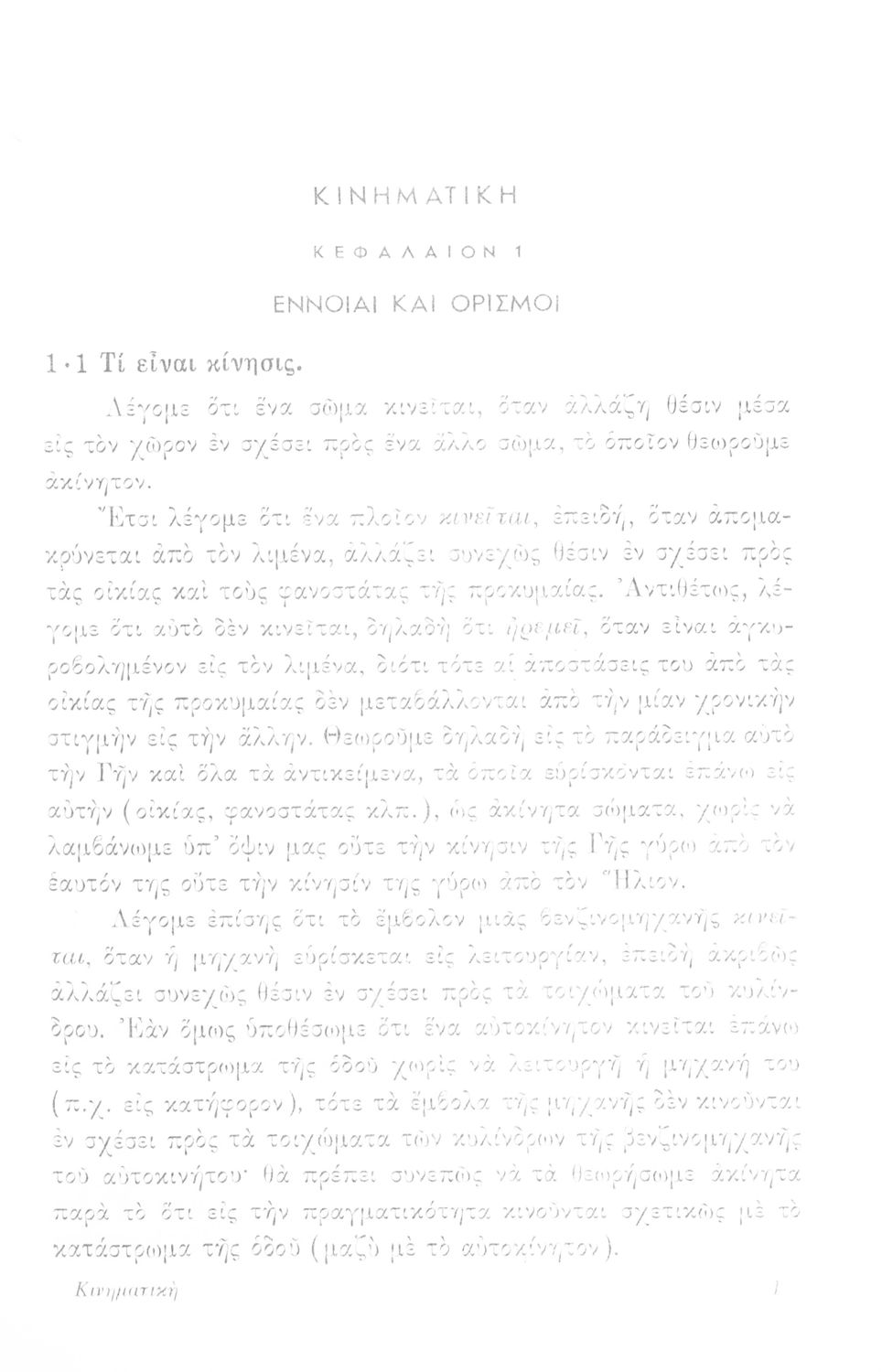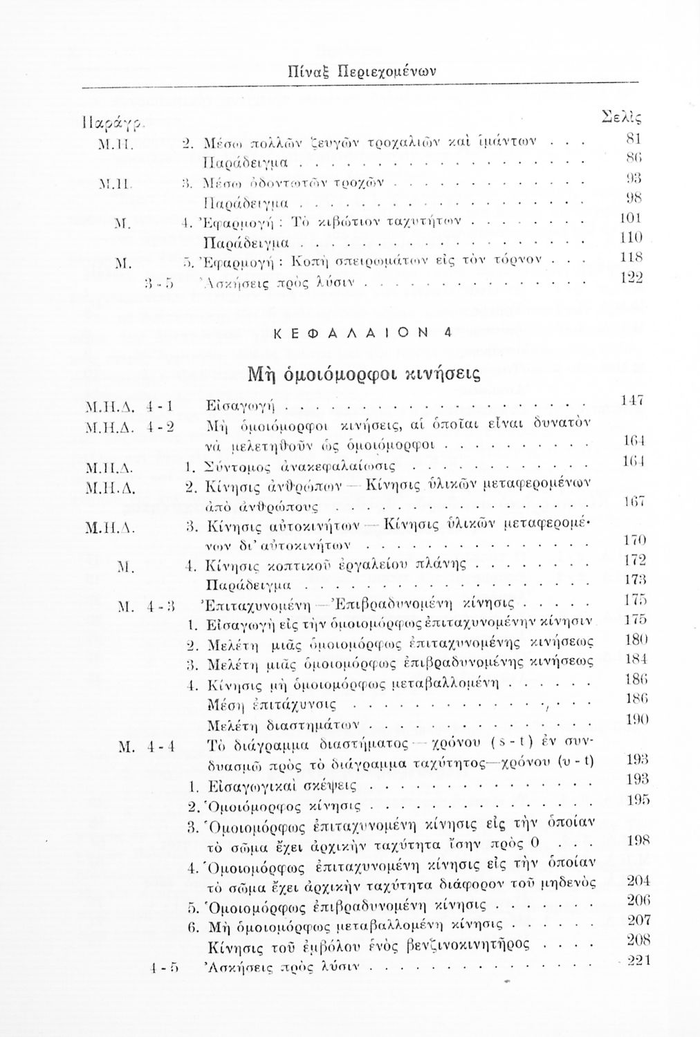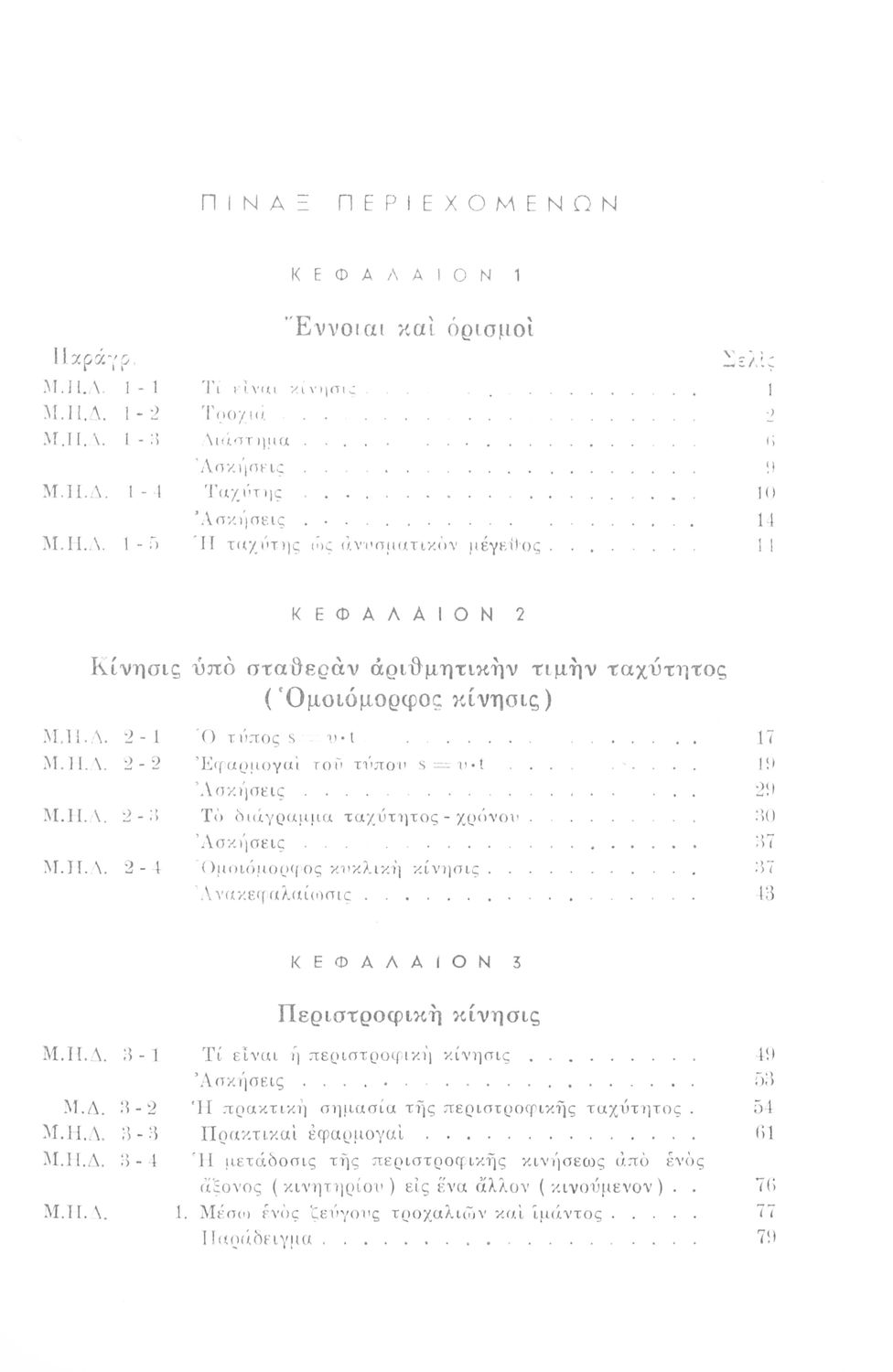 Σχολικό εγχειρίδιο Μηχανικής για τους μαθητές Γυμνασίου. Παρουσιάζει διάφορα είδη κινήσεων και δείχνει ζητήματα υπολογισμού όπως για παράδειγμα, ομοιόμορφες κινήσεις, επιταχυνόμενη-επιβραδυνόμενη κίνηση καθώς και σύνθετες κινήσεις οι οποίες συνδυάζουν τα παραπάνω χαρακτηριστικά. Επιπλέον, εξετάζει και κινήσεις διαφορετικών μηχανών όπως είναι οι κινήσεις τροχαλίας και ιμάντων, αλλά και κινήσεις ανθρώπων και αυτοκινήτων. Μελετά ζητήματα επιτάχυνσης και μεταβολής της κίνησης.