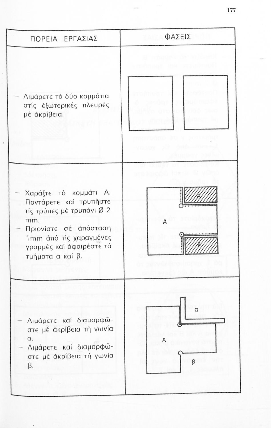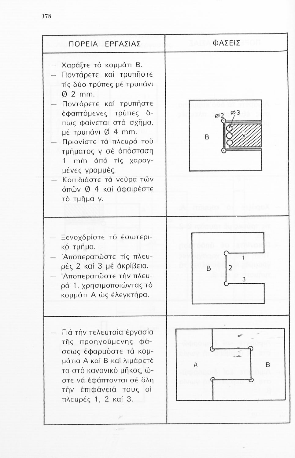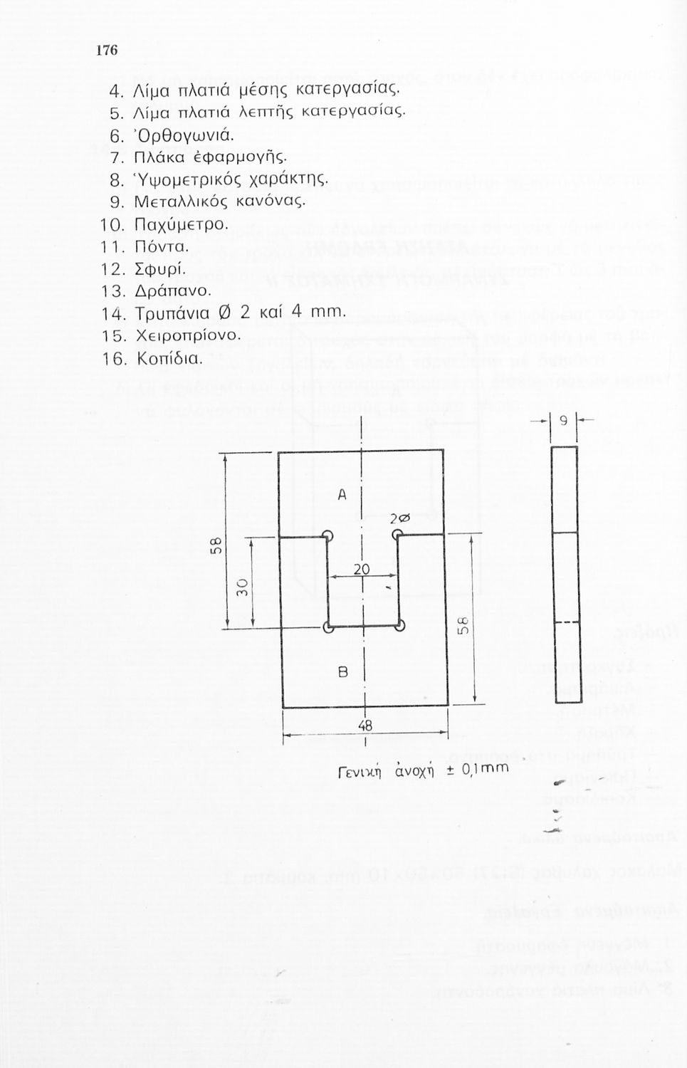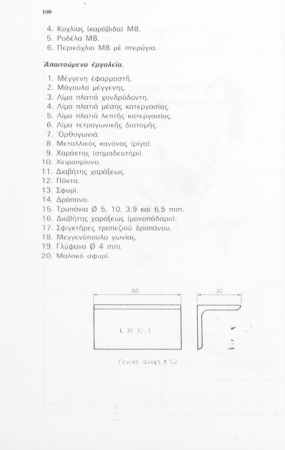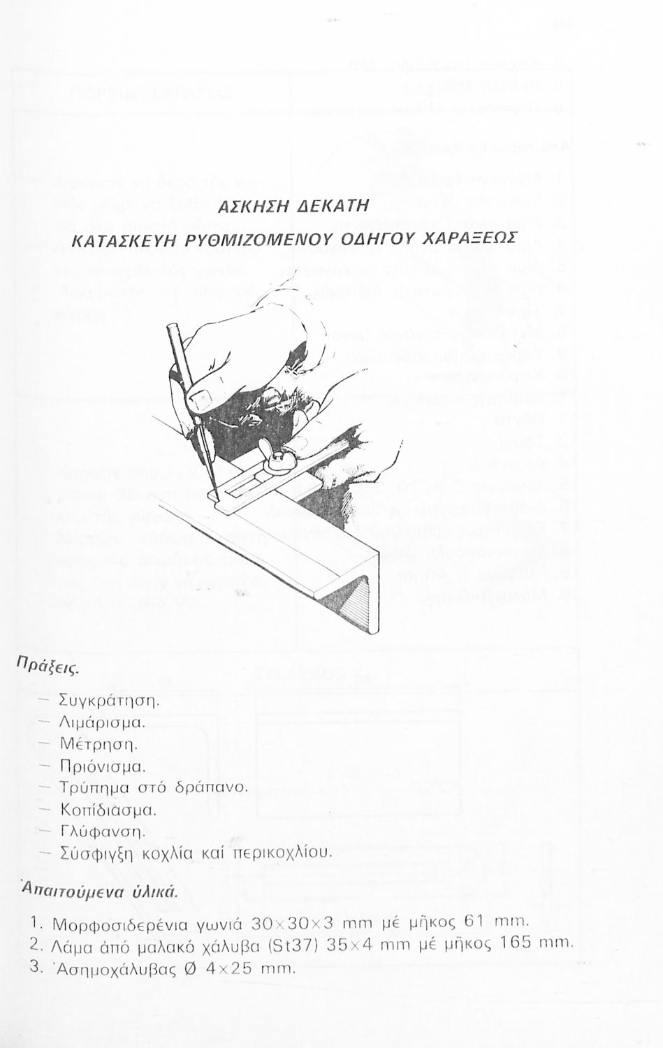 Σχολικό εγχειρίδιο για την Α' τάξη του Μηχανολογικού τμήματος των Τεχνικών Σχολών νέου τύπου. Το βιβλίο περιλαμβάνει δέκα εργαστηριακές ασκήσεις για τη μέτρηση διαστάσεων και τα εργαλεία που χρησιμοποιούνται για χάραξη, συγκράτηση, κρούση και κοπή, στο χώρο των μεταλλικών κατασκευών.