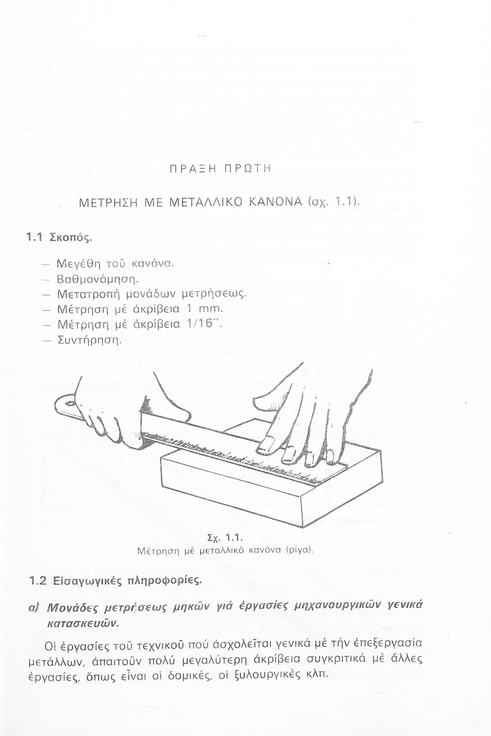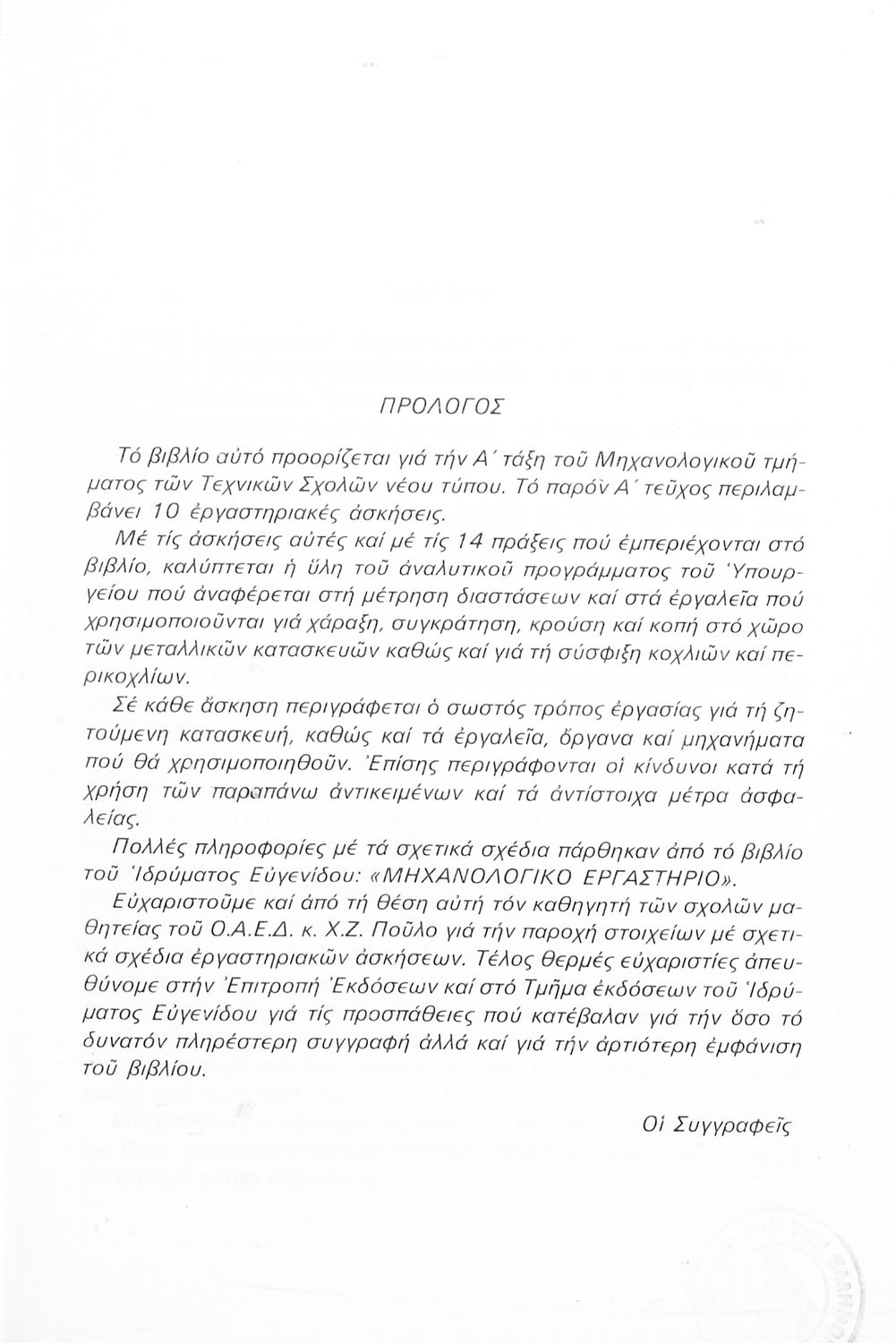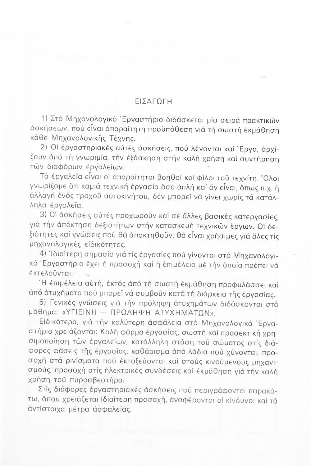 Βαθμίδα εκπαίδευσης: Δευτεροβάθμια Τάξη: Α' Μέσων Τεχνικών - Επαγγελματικών Σχολών Μάθημα: Μηχανολογία Γλώσσα: Δημοτική Παρουσίαση περιεχομένου: Σχολικό εγχειρίδιο για την Α' τάξη του Μηχανολογικού τμήματος των Τεχνικών Σχολών νέου τύπου. Το βιβλίο περιλαμβάνει δέκα εργαστηριακές ασκήσεις για τη μέτρηση διαστάσεων και τα εργαλεία που χρησιμοποιούνται για χάραξη, συγκράτηση, κρούση και κοπή, στο χώρο των μεταλλικών κατασκευών. |