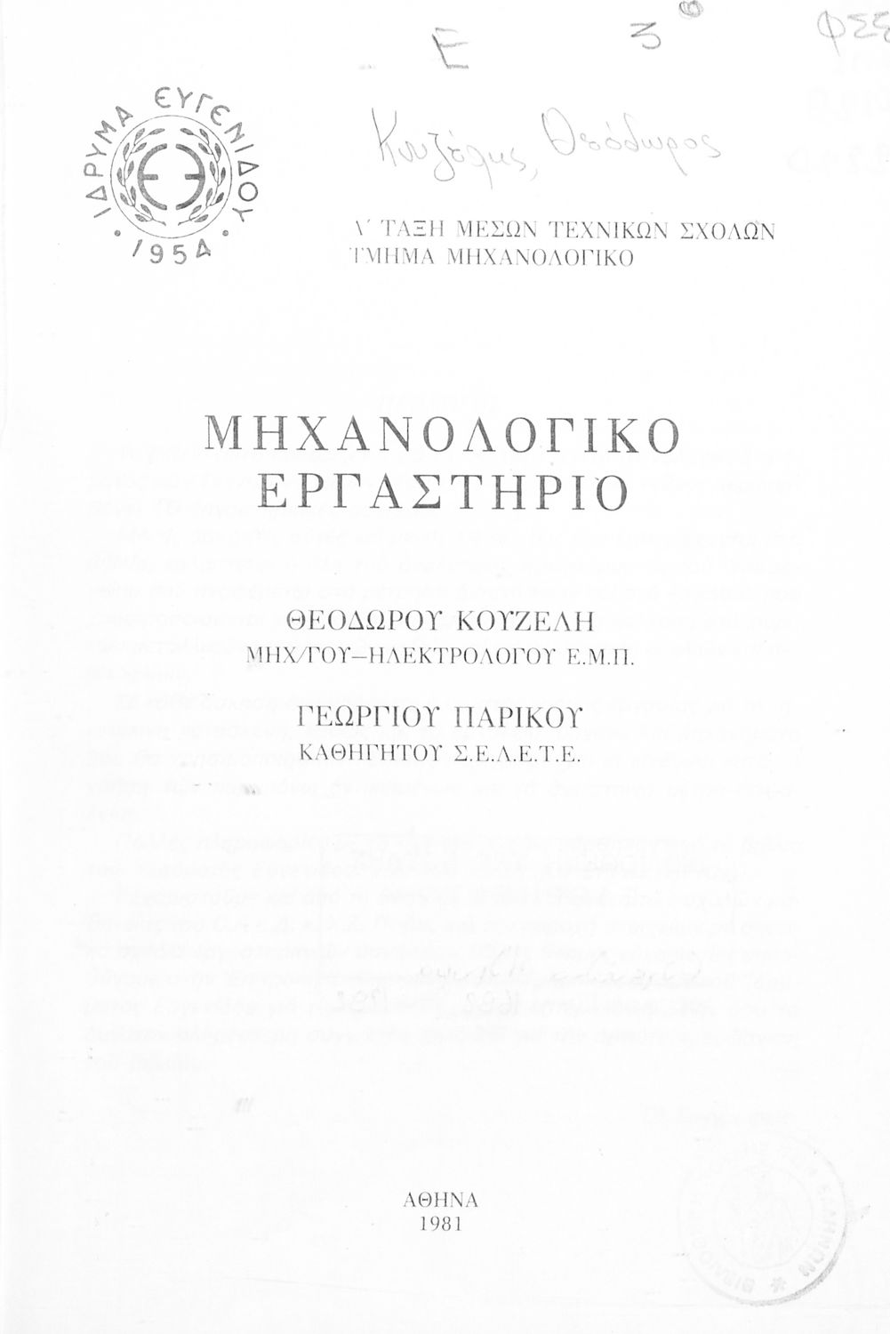 Κωδικός αναγνώρισης: 03-20560404 Τίτλος: Μηχανολογικό Εργαστήριο Α ́ τάξη Μέσων Τεχνικών Σχολών Τμήμα Μηχανολογικό Συγγραφέας: Θεόδωρος Κουζέλης, Γεώργιος Παρίκος Μέγεθος και υπόστρωμα: Σχολικό εγχειρίδιο, μαλακό εξώφυλλο, 208 σελίδες. |