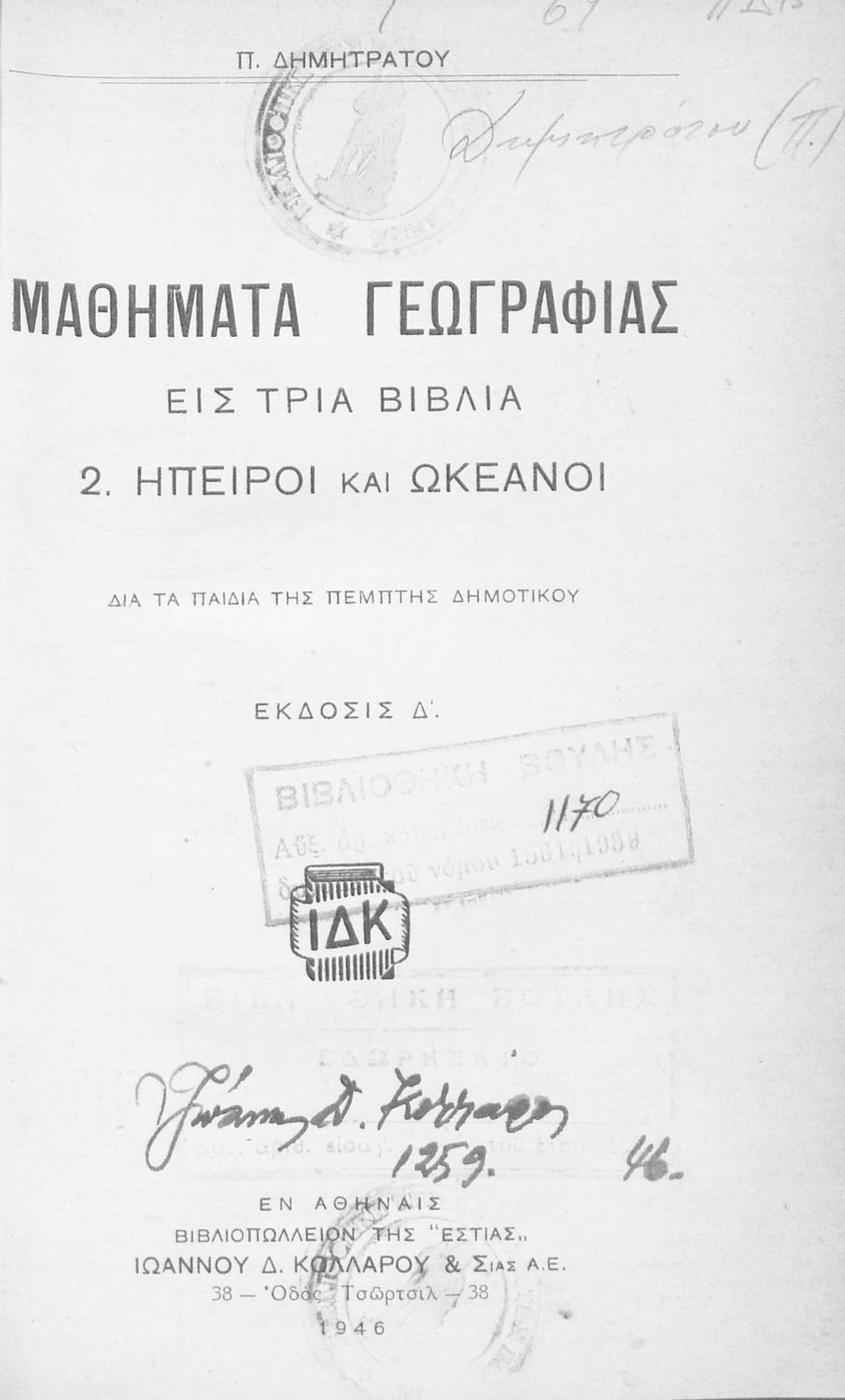 Τίτλος: Μαθήματα Γεωγραφίας εις τρία βιβλία. 2) Ήπειροι και Ωκεανοί, δια τα παιδιά της πέμπτης Δημοτικού