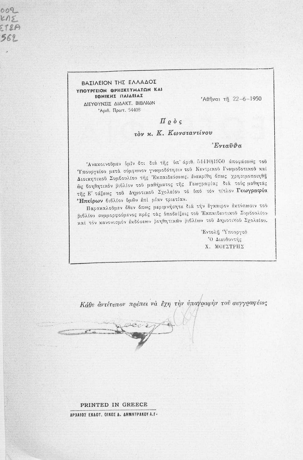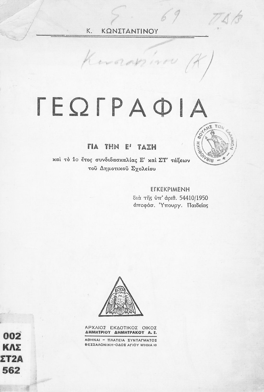 Εκδότης: Δημήτριος Δημητράκος Τόπος έκδοσης: Αθήνα Υπουργική απόφαση / Σύμβαση: 54410/1950 Έτος έγκρισης: 1950 |