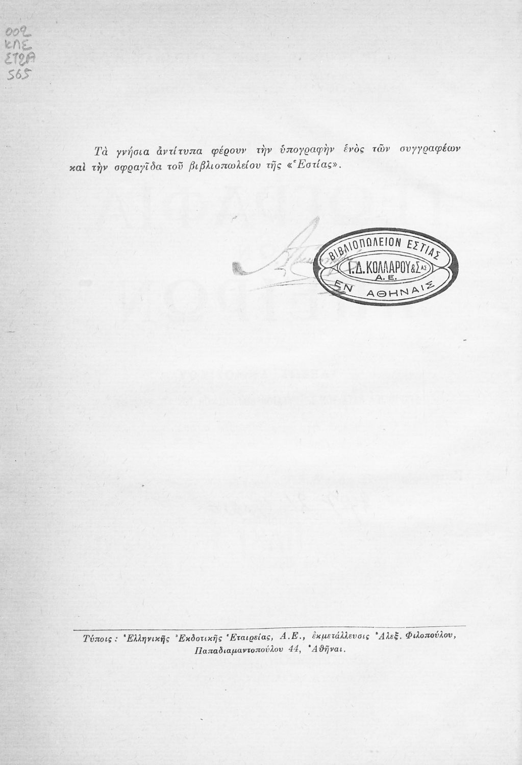Εκδότης: Ιωάννης Δ. Κολλάρος και ΣΙΑ, Βιβλιοπωλείο της "Εστίας"