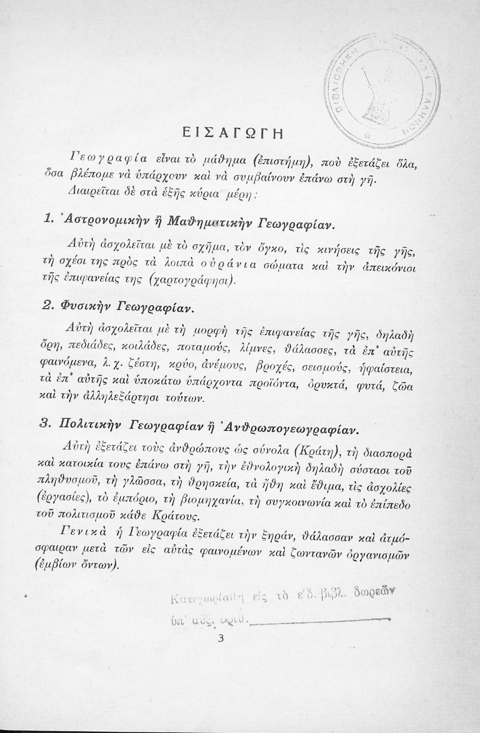 Πρόκειται για σχολικό εγχειρίδιο το οποίο μέσα από πλούσια εικονογράφηση προοριζόταν για τη διδασκαλία του μαθήματος της Γεωγραφίας στην Ε΄ και ΣΤ΄ Δημοτικού. Φέρει την υπογραφή του συγγραφέα και τη σφραγίδα ...