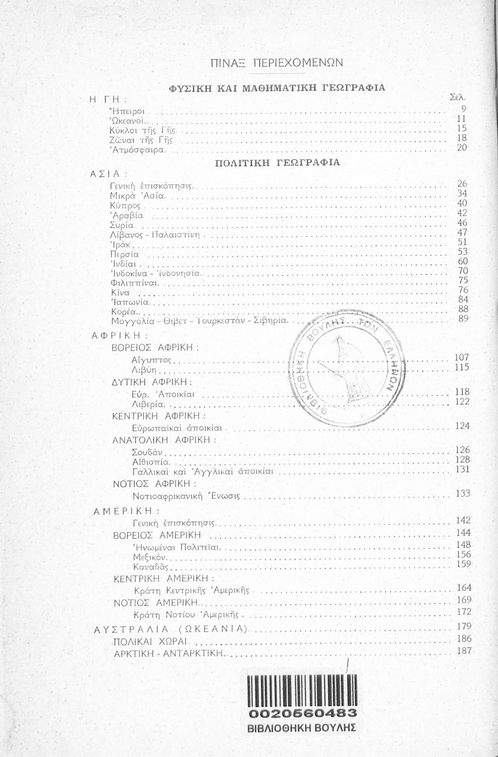 Σχολικό εγχειρίδιο Γεωγραφίας για τις Δ΄, Ε΄, ΣΤ΄, Ζ΄ Δημοτικού, Παρθεναγωγείων και Αστικών Σχολείων. Πρόκειται για βιβλίο φυσικής και πολιτικής γεωγραφίας της Ελλάδας και των Ηπείρων. Η Ελλάδα εξετάζεται με ...