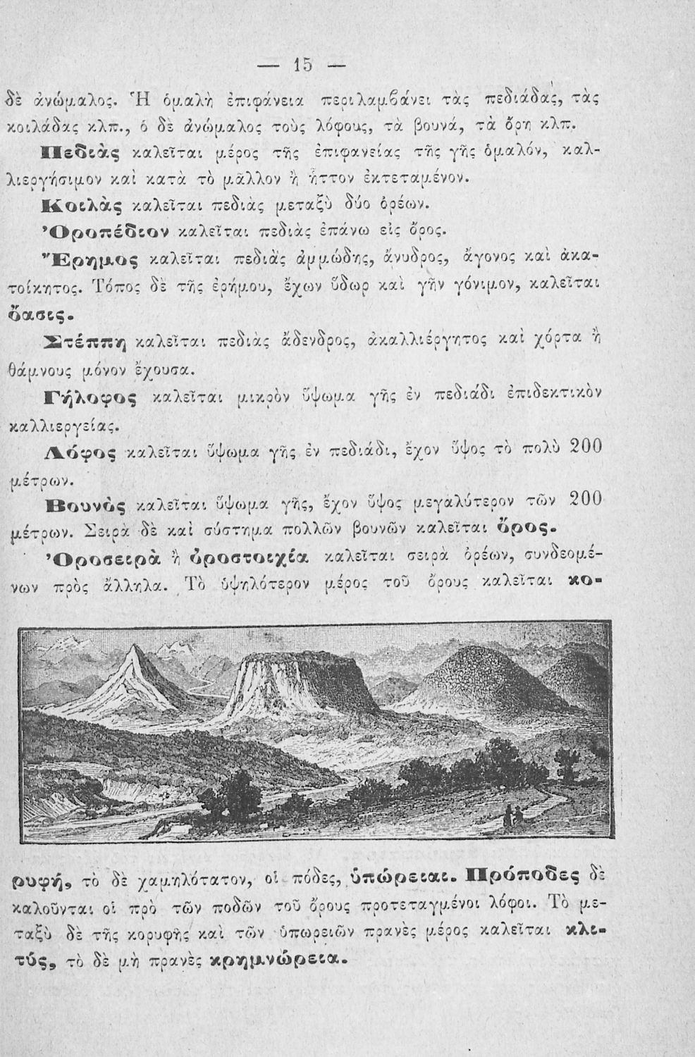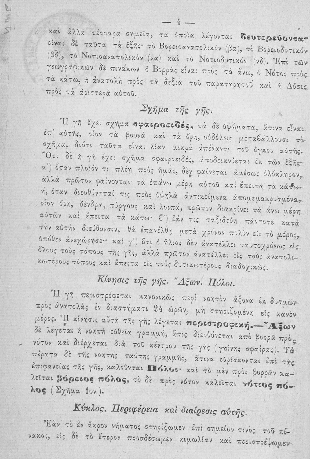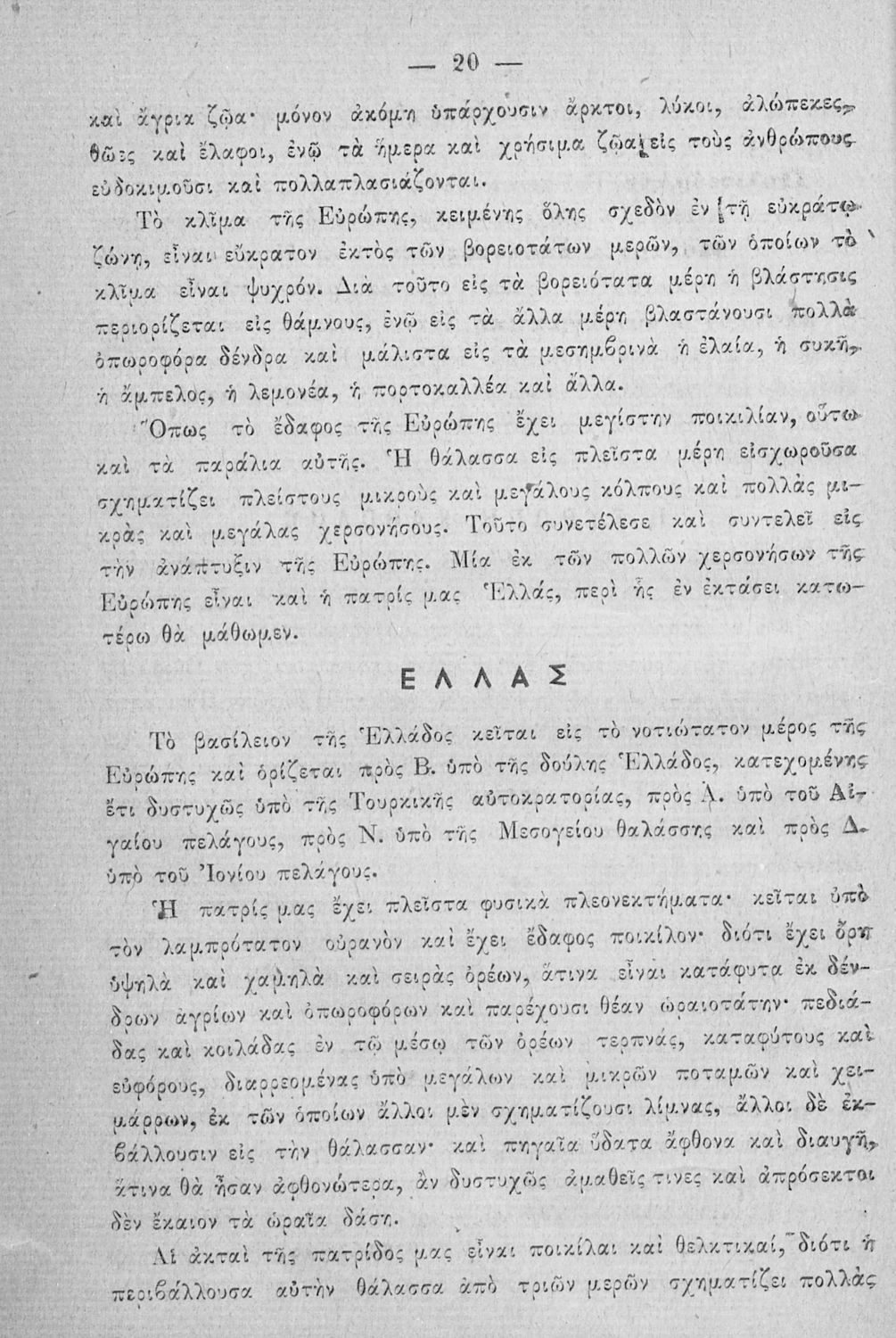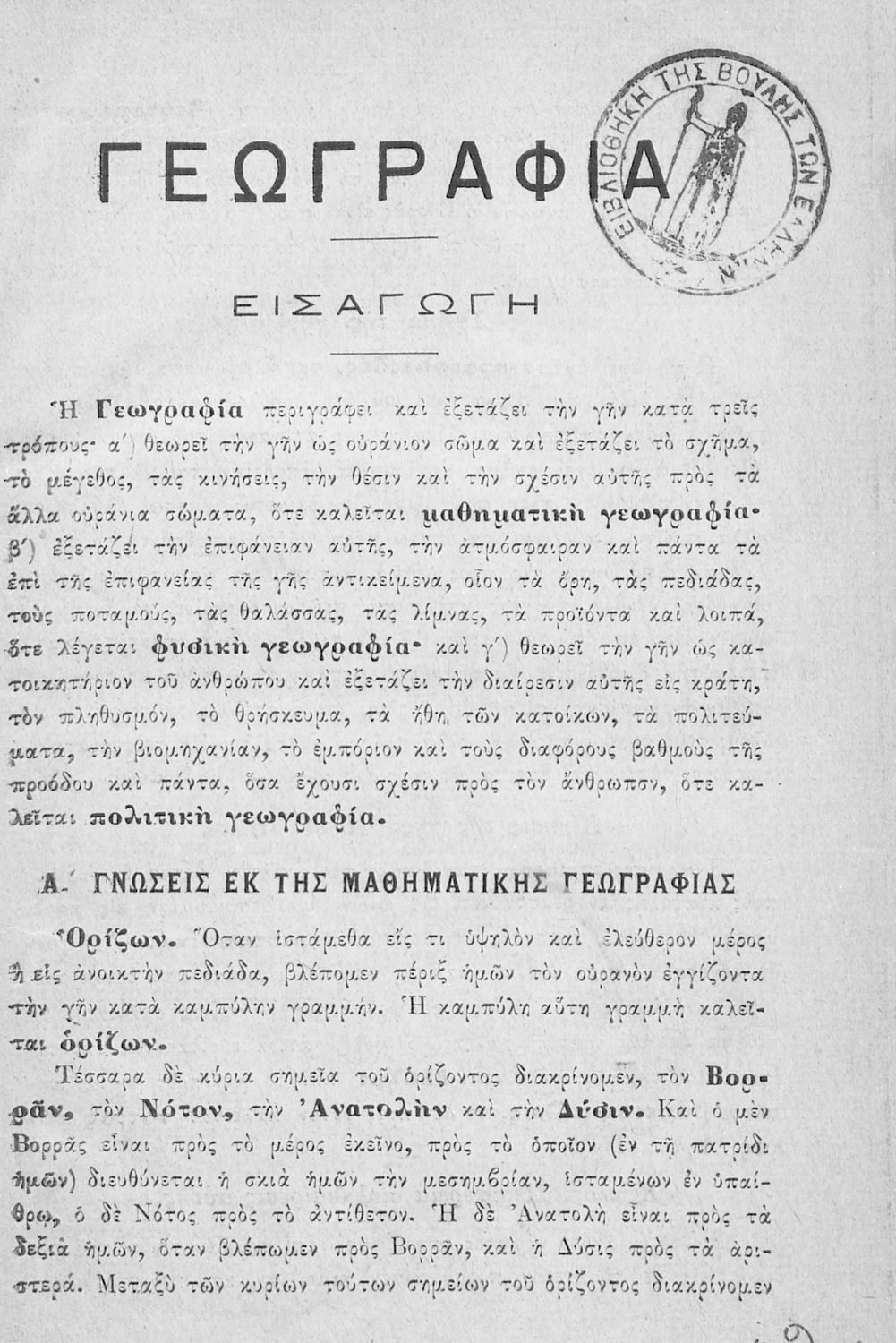 Βαθμίδα εκπαίδευσης: Πρωτοβάθμια Μάθημα: Γεωγραφία Γλώσσα: Απλή καθαρεύουσα Παρουσίαση περιεχομένου: Σχολικό εγχειρίδιο Γεωγραφίας Δημοτικού που περιλαμβάνει εισαγωγή στη μαθηματική, φυσική και πολιτική γεωγραφία και εξετάζει την Ελλάδα και ενδεικτικά κράτη και περιοχές από τις πέντε ηπείρους από γεωφυσική, πολιτική και οικονομική άποψη. |
