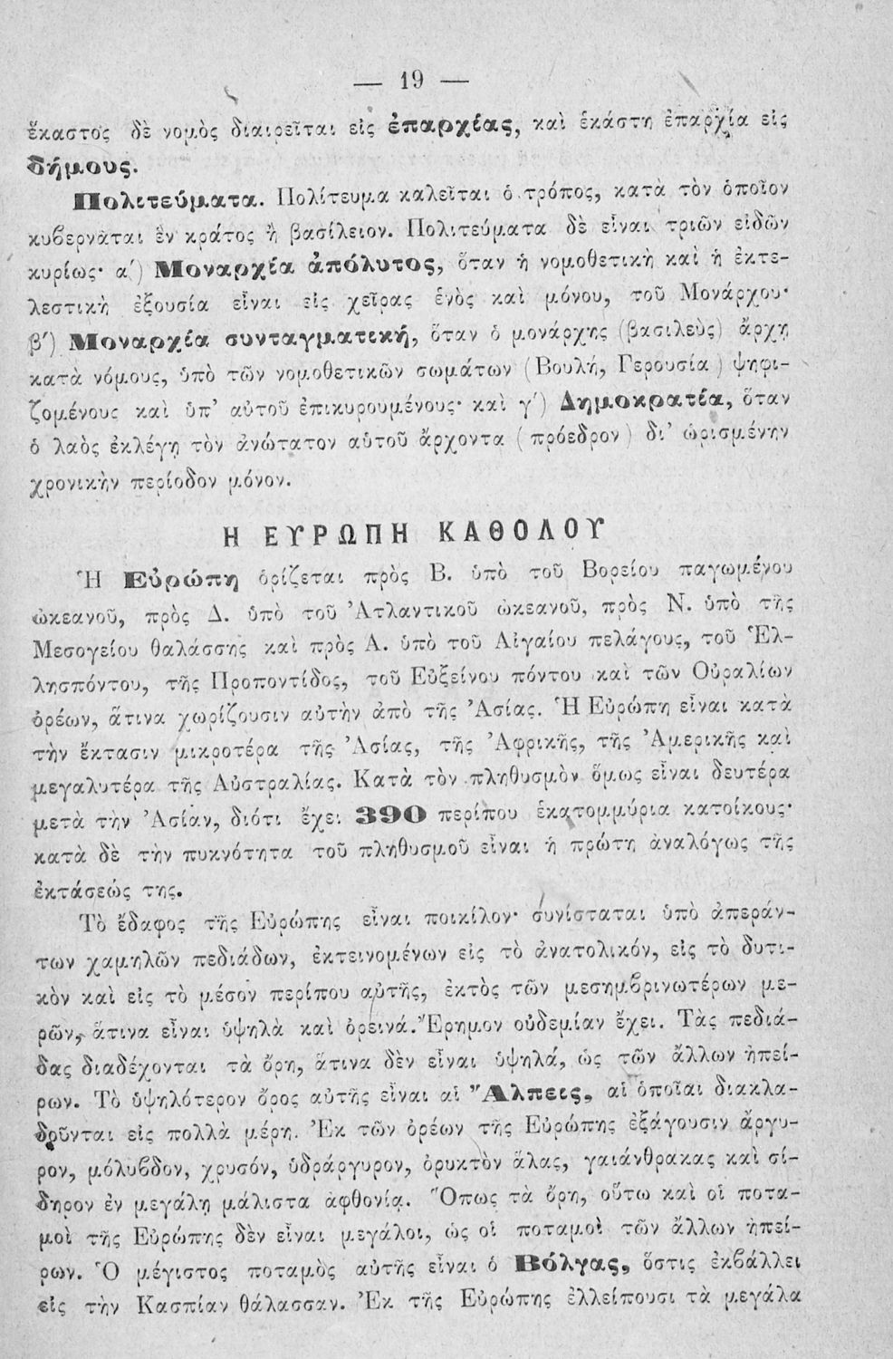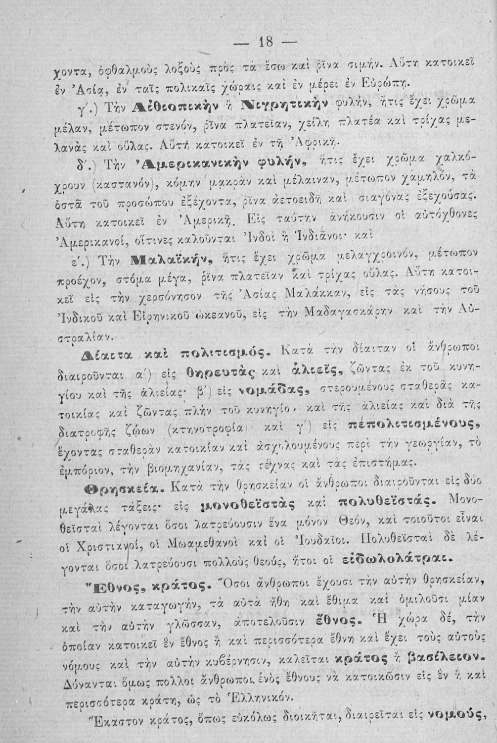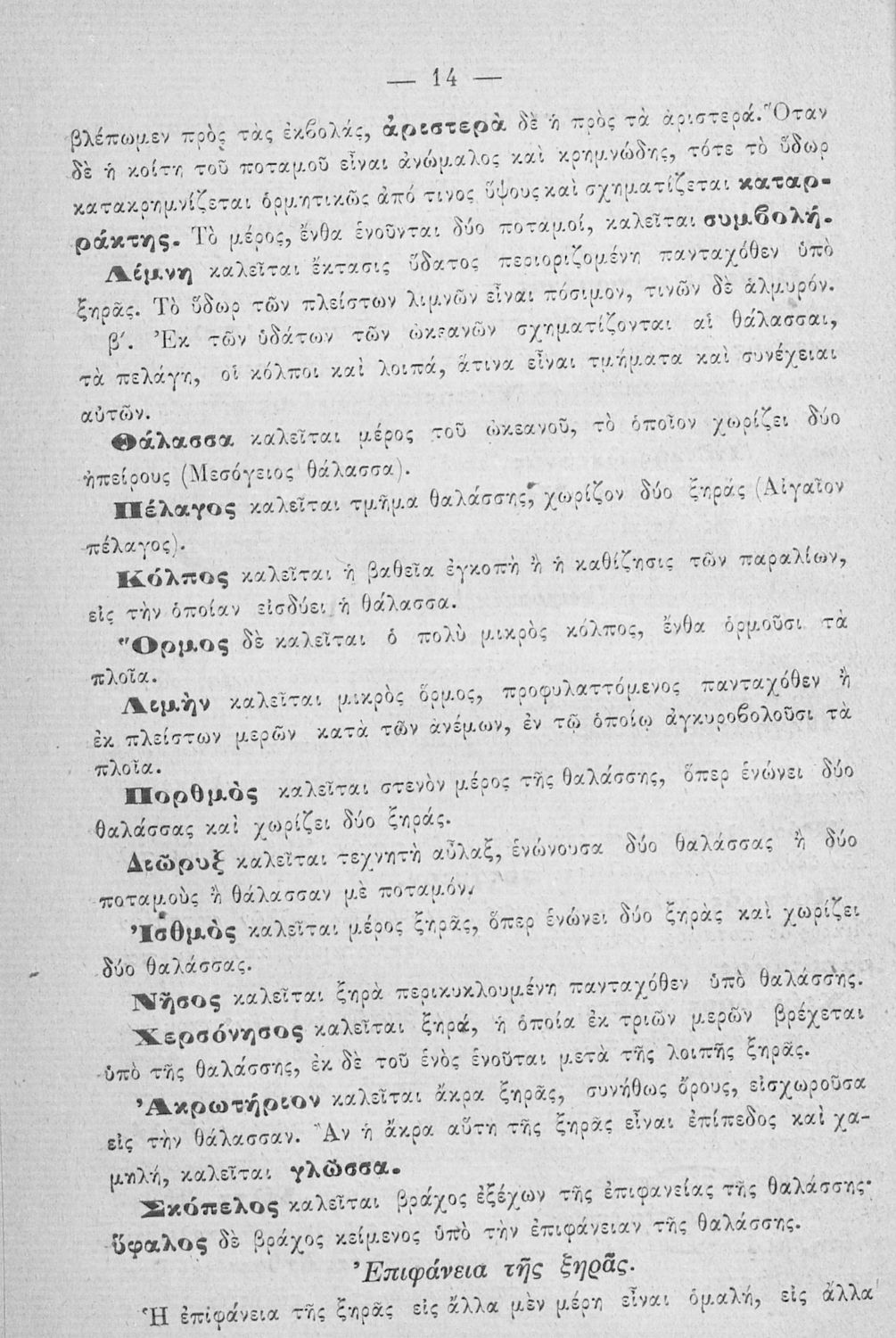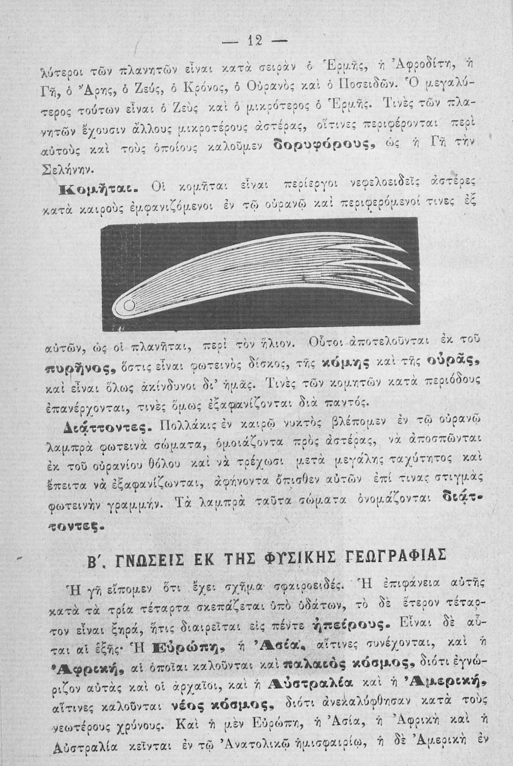 Βαθμίδα εκπαίδευσης: Πρωτοβάθμια Μάθημα: Γεωγραφία Γλώσσα: Απλή καθαρεύουσα Παρουσίαση περιεχομένου: Σχολικό εγχειρίδιο Γεωγραφίας Δημοτικού που περιλαμβάνει εισαγωγή στη μαθηματική, φυσική και πολιτική γεωγραφία και εξετάζει την Ελλάδα και ενδεικτικά κράτη και περιοχές από τις πέντε ηπείρους από γεωφυσική, πολιτική και οικονομική άποψη. |