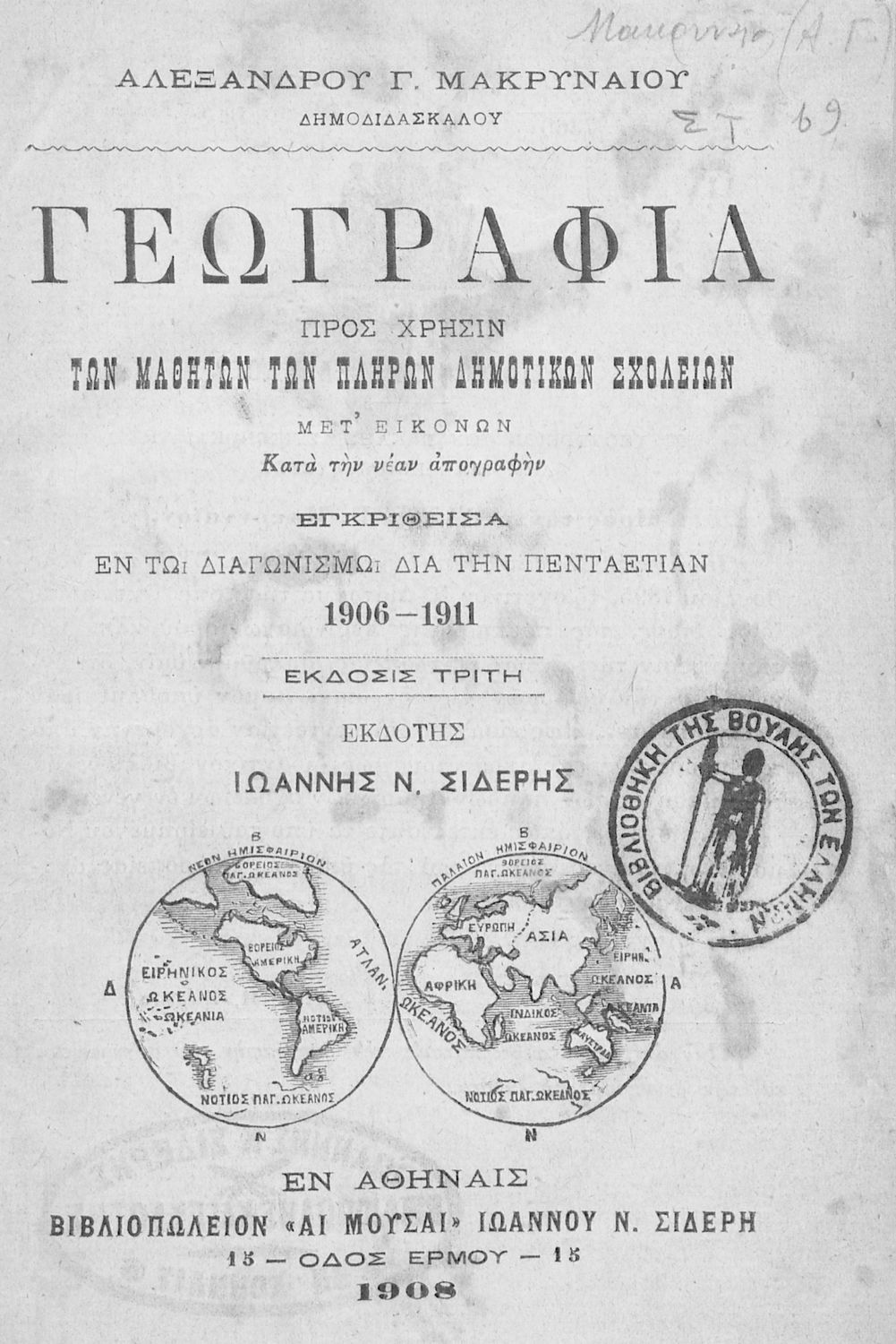 Εκδότης: Ιωάννης Ν. Σιδέρης Έτος έκδοσης: 1908 Τόπος έκδοσης: Αθήνα Έκδοση: 3η Υπουργική απόφαση / Σύμβαση: 7361/15-5-1906 Έτος έγκρισης: 1906 |