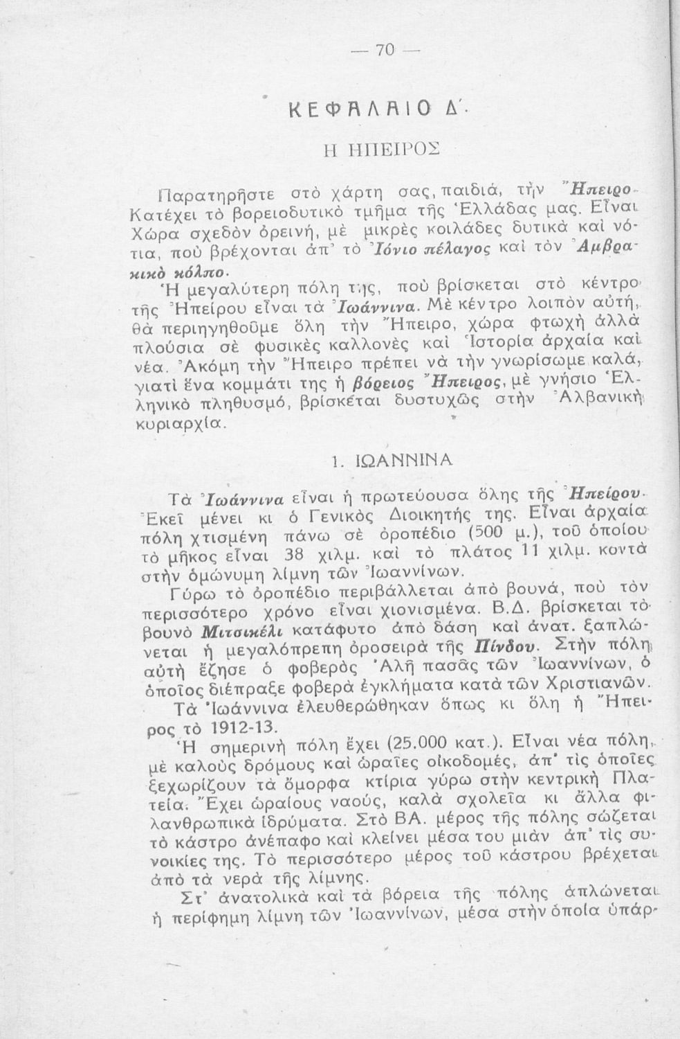 Βαθμίδα εκπαίδευσης: Πρωτοβάθμια Τάξη: Γ' Δημοτικού / Δ' Δημοτικού Μάθημα: Γεωγραφία Γλώσσα: Δημοτική Παρουσίαση περιεχομένου: Σχολικό εγχειρίδιο για την Γ΄ και Δ΄ Δημοτικού για το μάθημα της Γεωγραφίας. Το εγχειρίδιο αποτελείται από 3 κύρια μέρη. Το πρώτο μέρος περιλαμβάνει γεωγραφικά στοιχεία της ξηράς, της θάλασσας, την γεωμορφολογική σύσταση της Ελλάδας. Το δεύτερο μέρος περιλαμβάνει την ηπειρωτική Ελλάδα και το τρίτο ασχολείται με την νησιωτική Ελλάδα. |