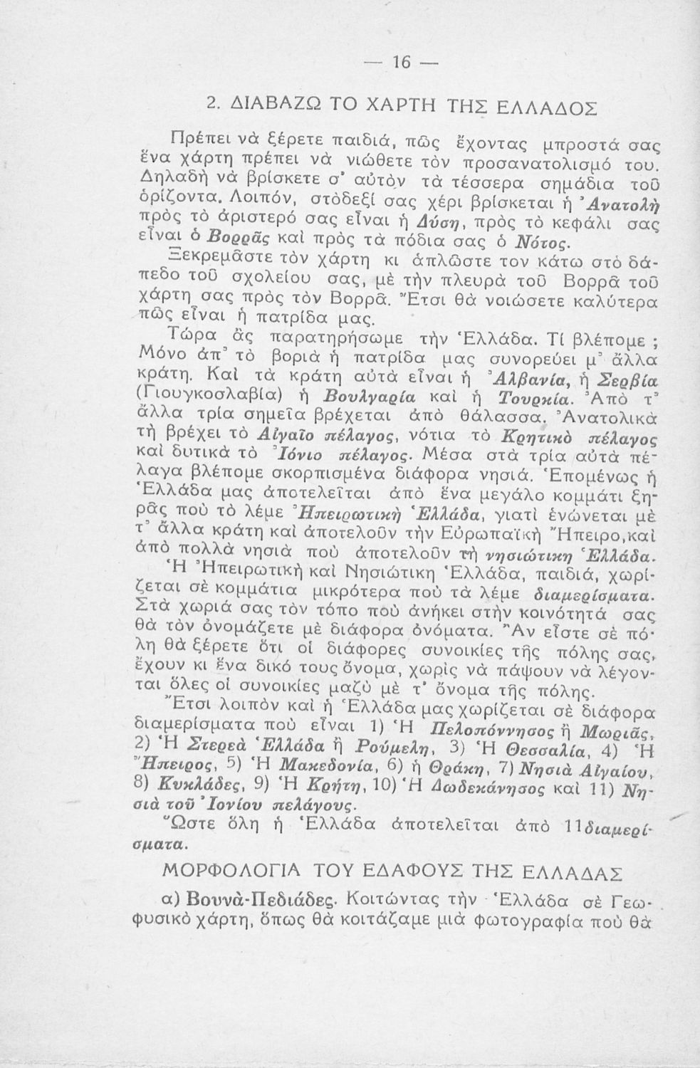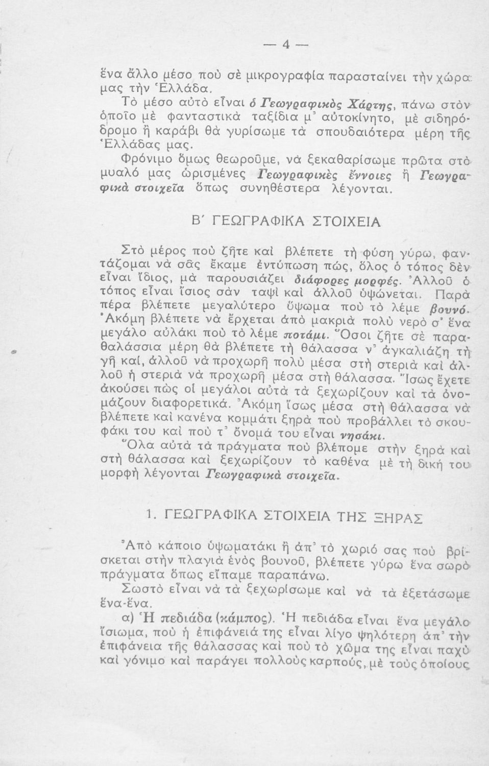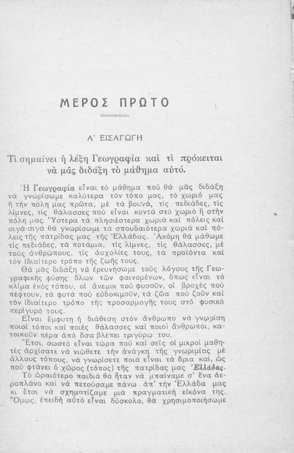 Σχολικό εγχειρίδιο για την Γ΄ και Δ΄ Δημοτικού για το μάθημα της Γεωγραφίας. Το εγχειρίδιο αποτελείται από 3 κύρια μέρη. Το πρώτο μέρος περιλαμβάνει γεωγραφικά στοιχεία της ξηράς, της θάλασσας, την γεωμορφολογική σύσταση της Ελλάδας. Το δεύτερο μέρος περιλαμβάνει την ηπειρωτική Ελλάδα και το τρίτο ασχολείται με την νησιωτική Ελλάδα.