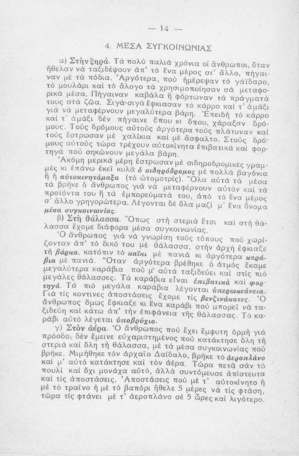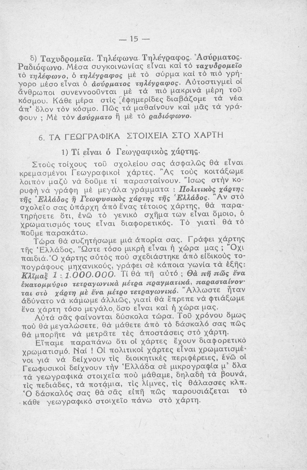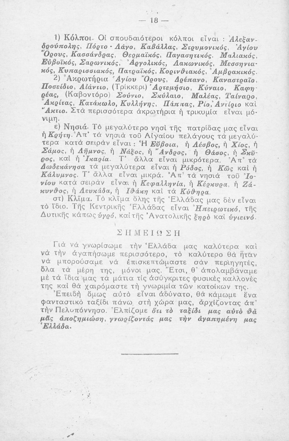 Βαθμίδα εκπαίδευσης: Πρωτοβάθμια Τάξη: Γ' Δημοτικού / Δ' Δημοτικού Μάθημα: Γεωγραφία Γλώσσα: Δημοτική Παρουσίαση περιεχομένου: Σχολικό εγχειρίδιο για την Γ΄ και Δ΄ Δημοτικού για το μάθημα της Γεωγραφίας. Το εγχειρίδιο αποτελείται από 3 κύρια μέρη. Το πρώτο μέρος περιλαμβάνει γεωγραφικά στοιχεία της ξηράς, της θάλασσας, την γεωμορφολογική σύσταση της Ελλάδας. Το δεύτερο μέρος περιλαμβάνει την ηπειρωτική Ελλάδα και το τρίτο ασχολείται με την νησιωτική Ελλάδα. |
