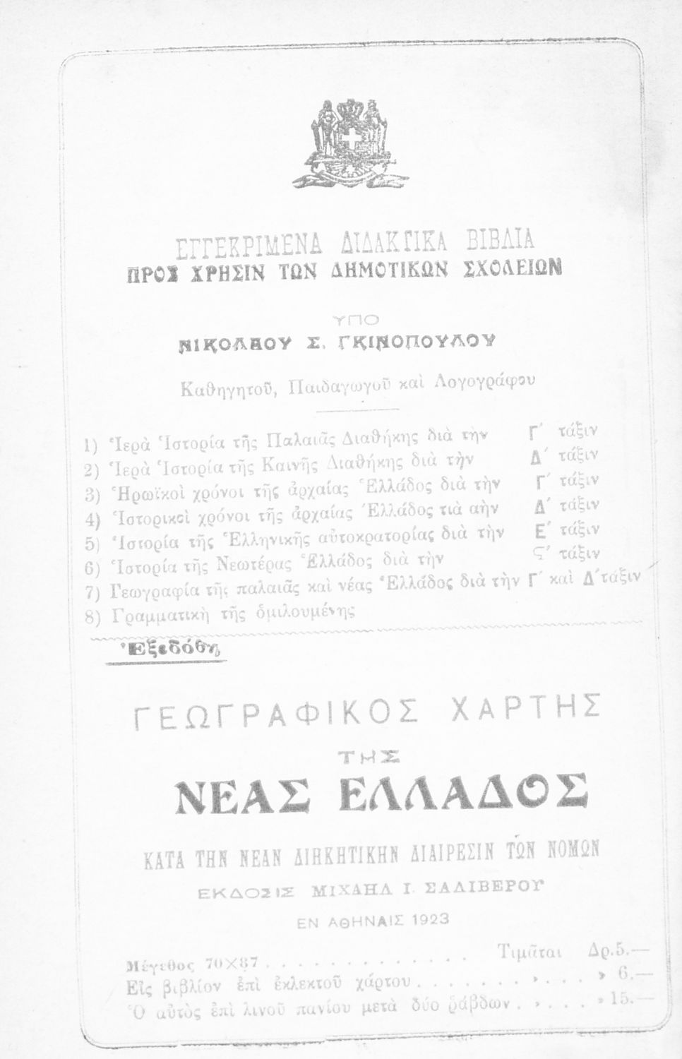 Εκδότης: Μιχαήλ Ι. Σαλίβερος Έτος έκδοσης: 1923 Τόπος έκδοσης: Αθήνα Έτος έγκρισης: 1923 |