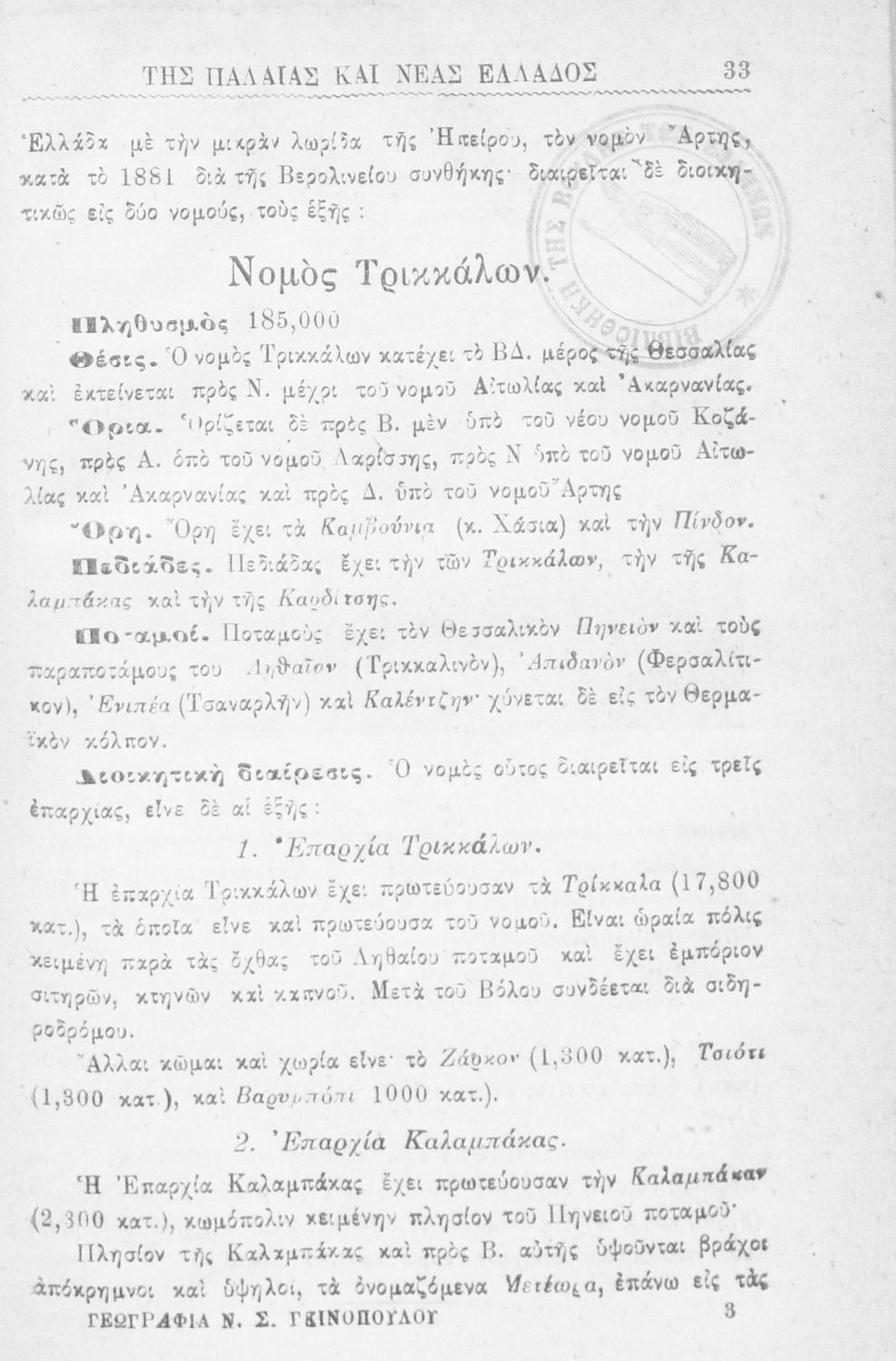 Γεωγραφία της Παλαιάς και Νέας Ελλάδος, προς χρήσιν των Δημοτικών Σχολείων. Συντεταγμένη κατά το νέον πρόγραμμα του Υπουργείου Παιδείας (1ης Σεπτεμβρίου 1913) και κατά την νέαν διοικητικήν διαίρεσιν