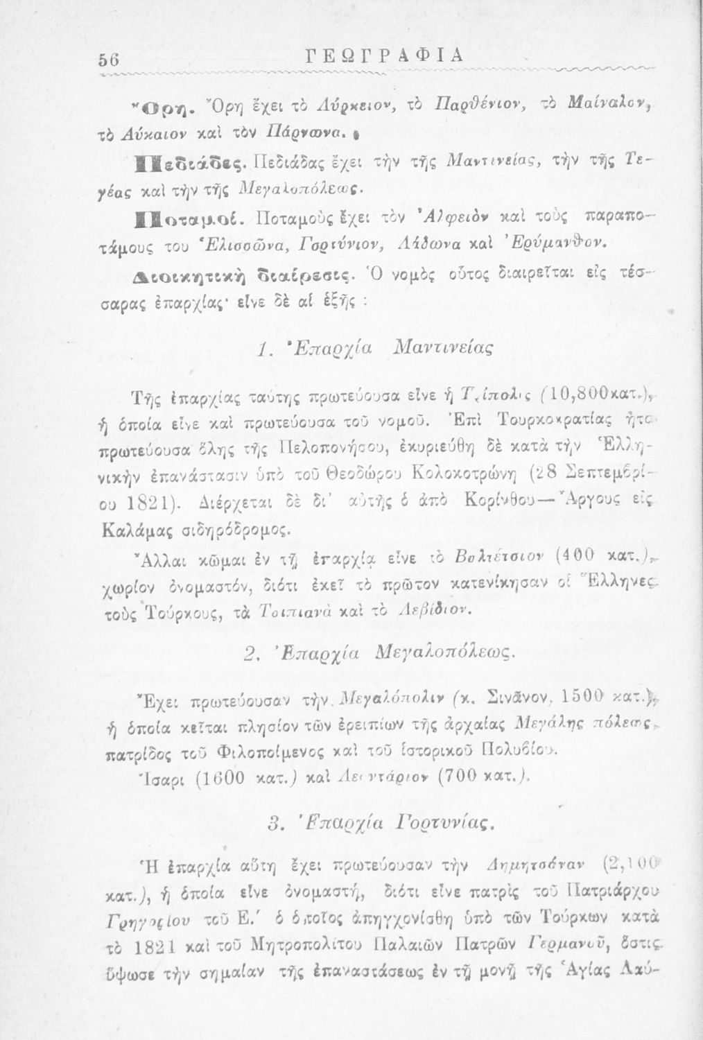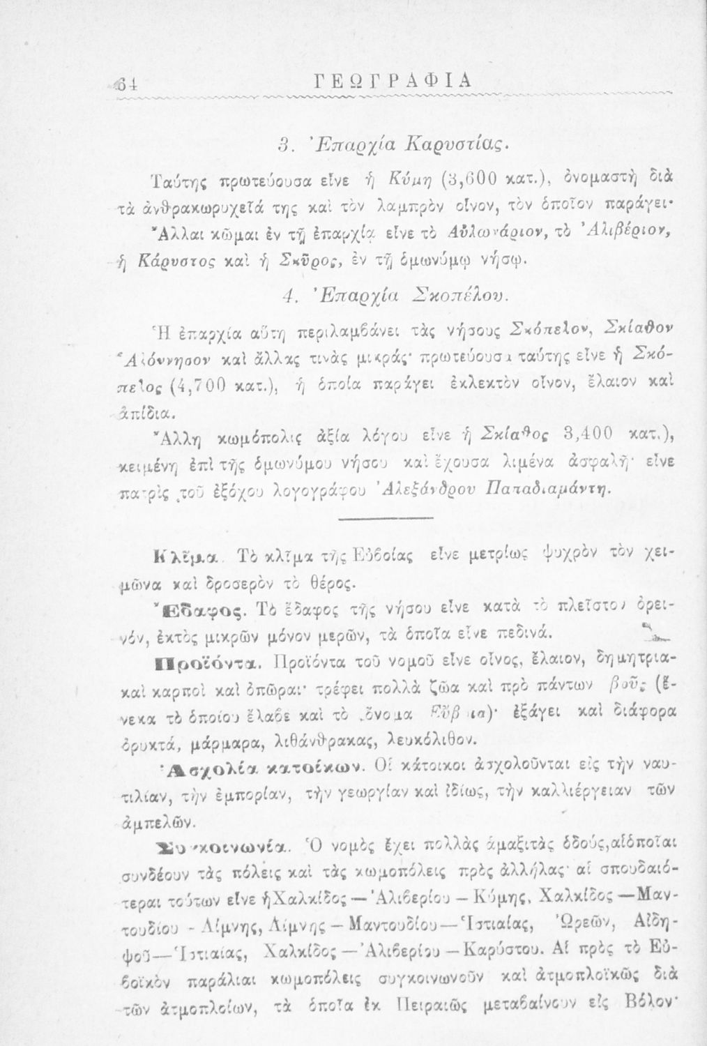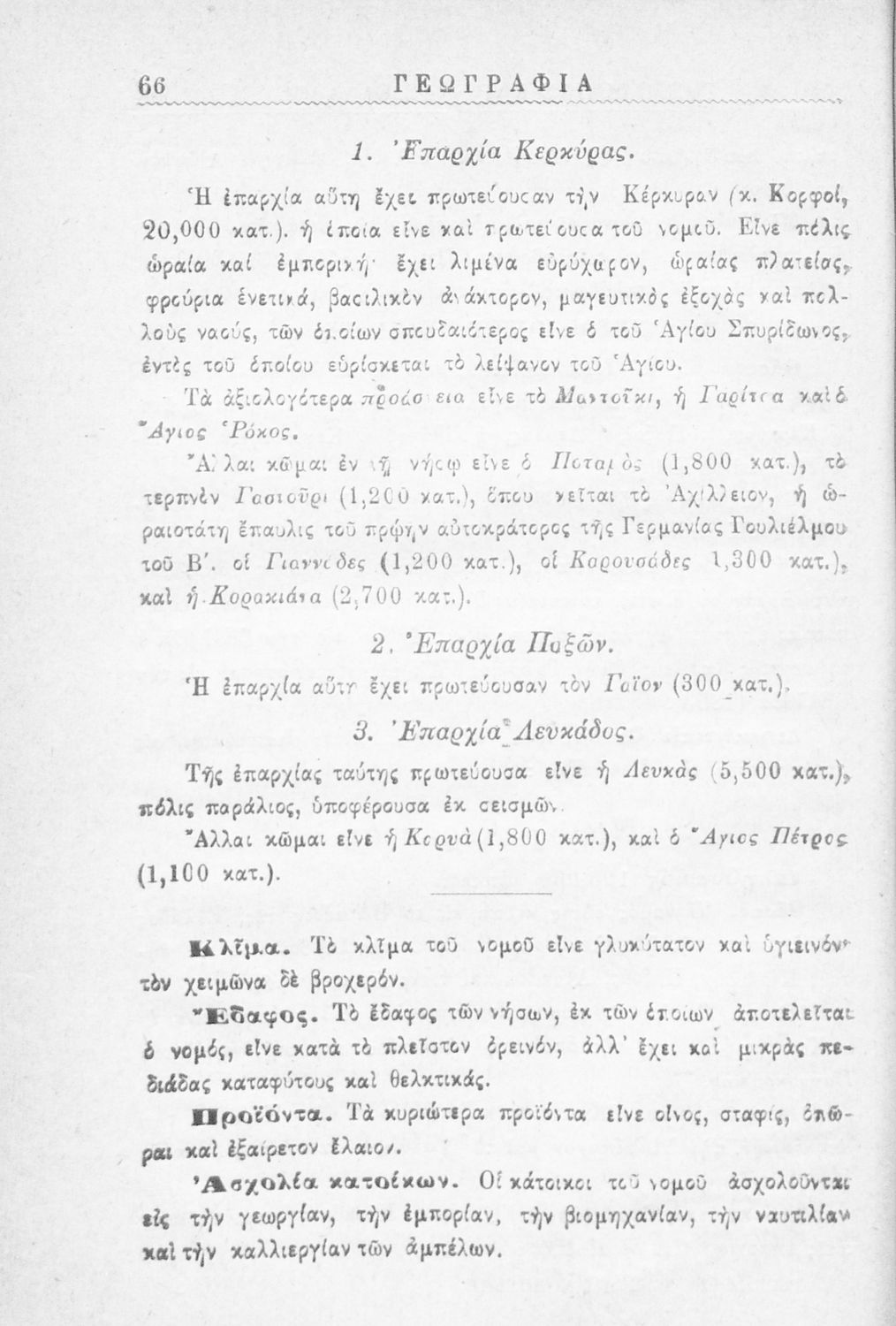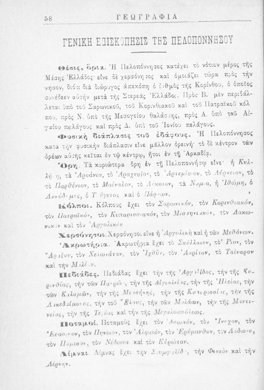 Σχολικό εγχειρίδιο Γεωγραφίας για τα Παρθεναγωγεία και τα Ελληνικά Σχολεία που περιλαμβάνει εισαγωγή στη φυσική, μαθηματική και πολιτική γεωγραφία και εξετάζει την Ελλάδα και ενδεικτικές χώρες και περιοχές από