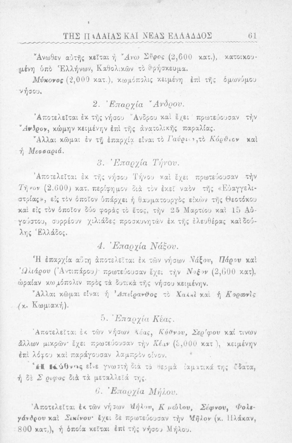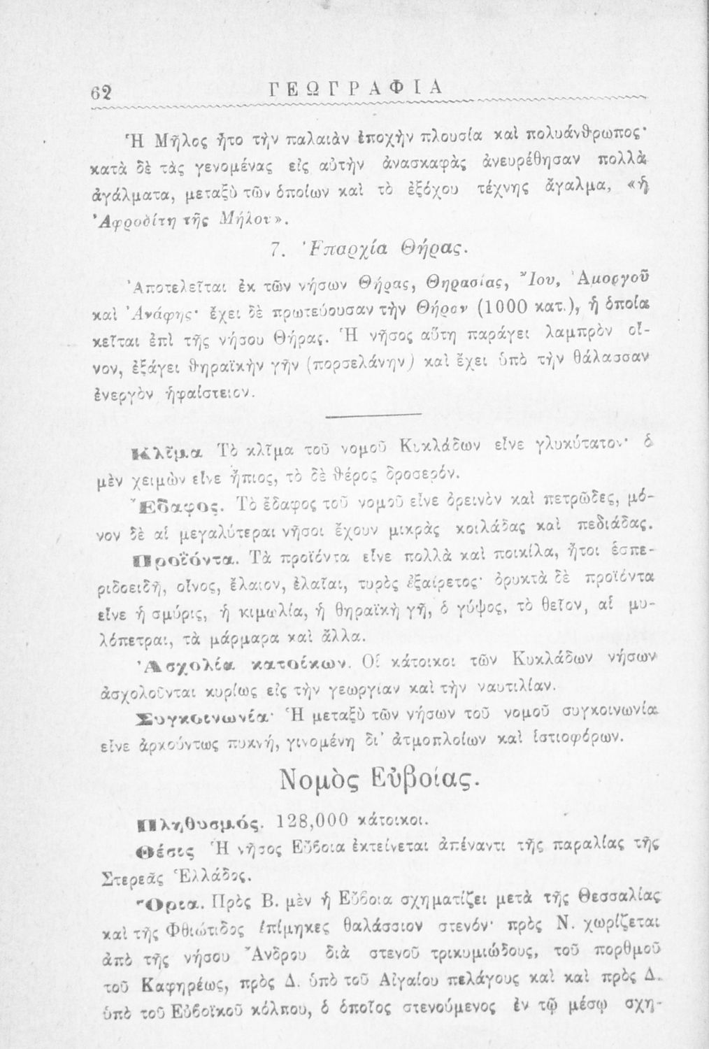 Σχολικό εγχειρίδιο Γεωγραφίας Δημοτικού που παρουσιάζει την φυσική, οικονομική και πολιτική γεωγραφία της Παλαιάς και Νέας Ελλάδας. Περιέχει και εκτενή αναφορά στις "αλύτρωτες ελληνικές χώρες και νησιά" στις οποίες περιλαμβάνει την Σερβική και Βουλγαρική Μακεδονία, τη Θράκη, τα Δωδεκάνησα και την Κύπρο.