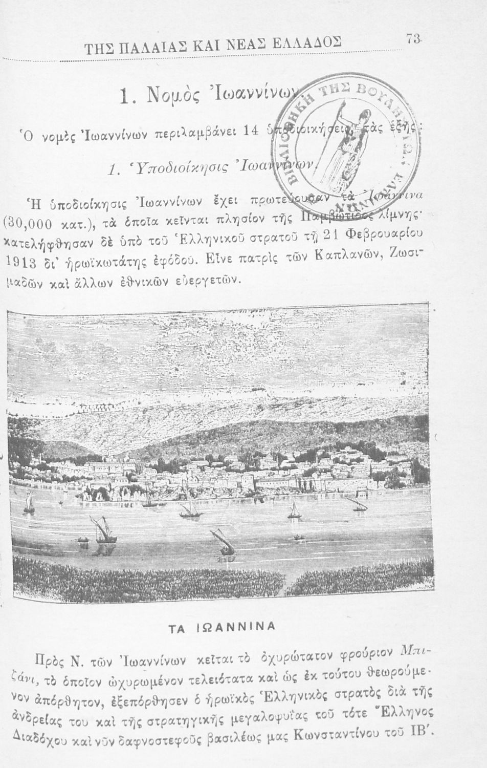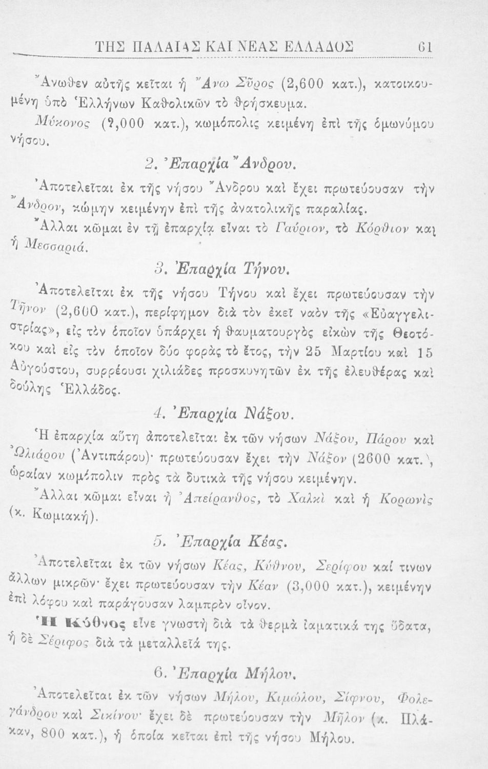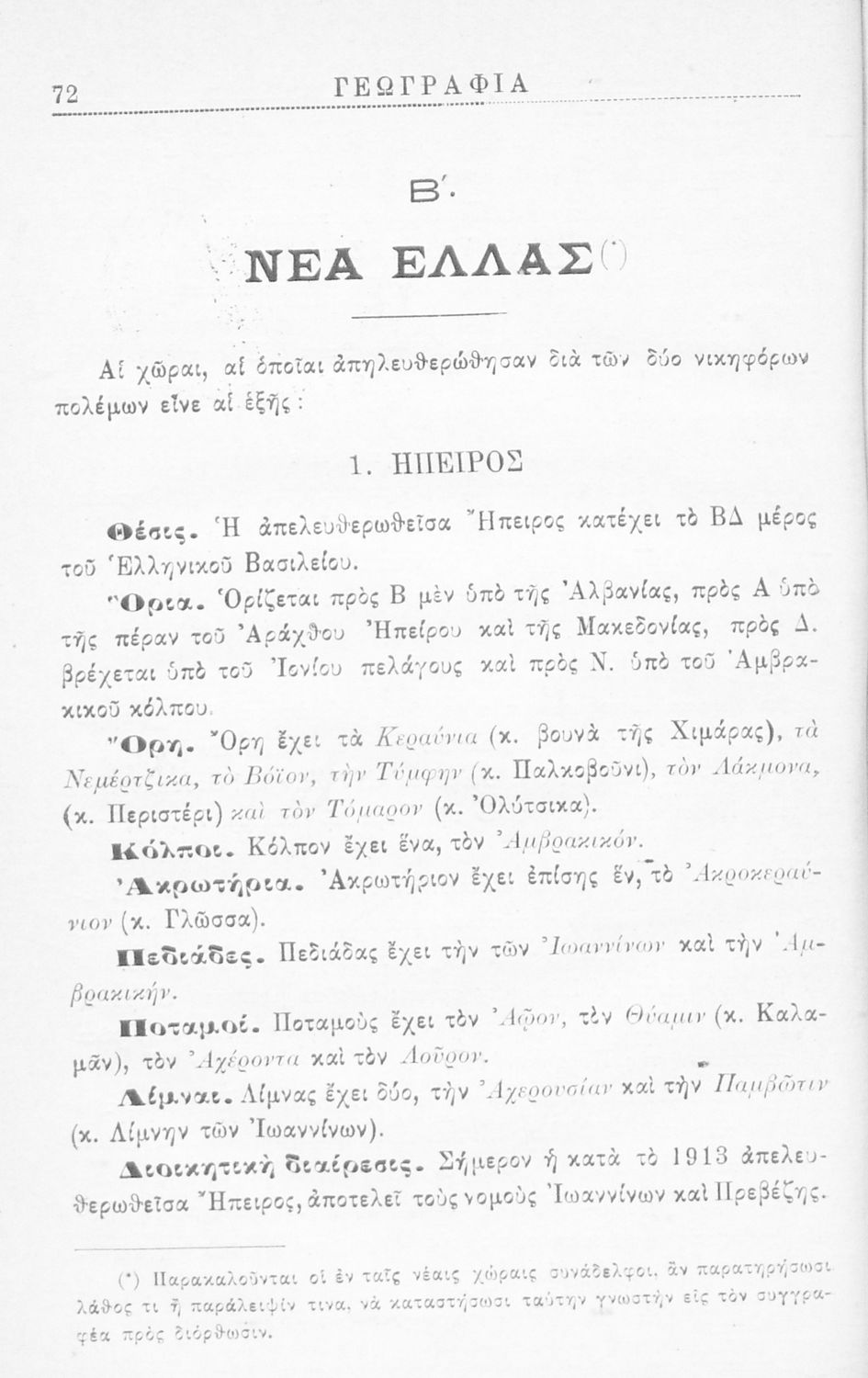 Σχολικό εγχειρίδιο Γεωγραφίας Δημοτικού που παρουσιάζει την φυσική, οικονομική και πολιτική γεωγραφία της Παλαιάς και Νέας Ελλάδας. Περιέχει και εκτενή αναφορά στις "αλύτρωτες ελληνικές χώρες και νησιά" στις οποίες περιλαμβάνει την Σερβική και Βουλγαρική Μακεδονία, τη Θράκη, τα Δωδεκάνησα και την Κύπρο.