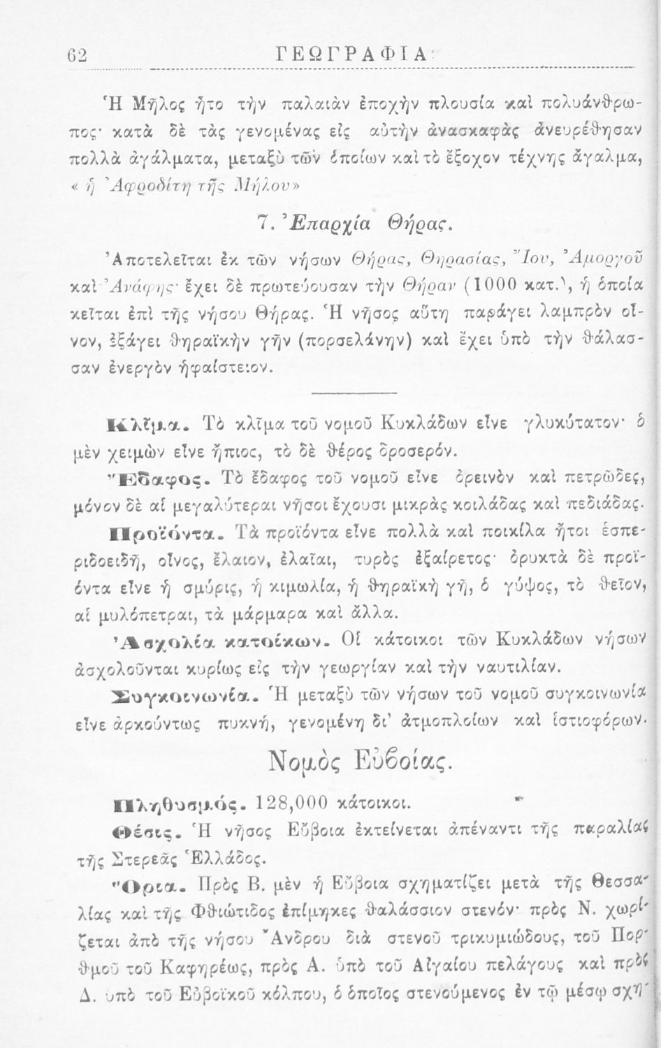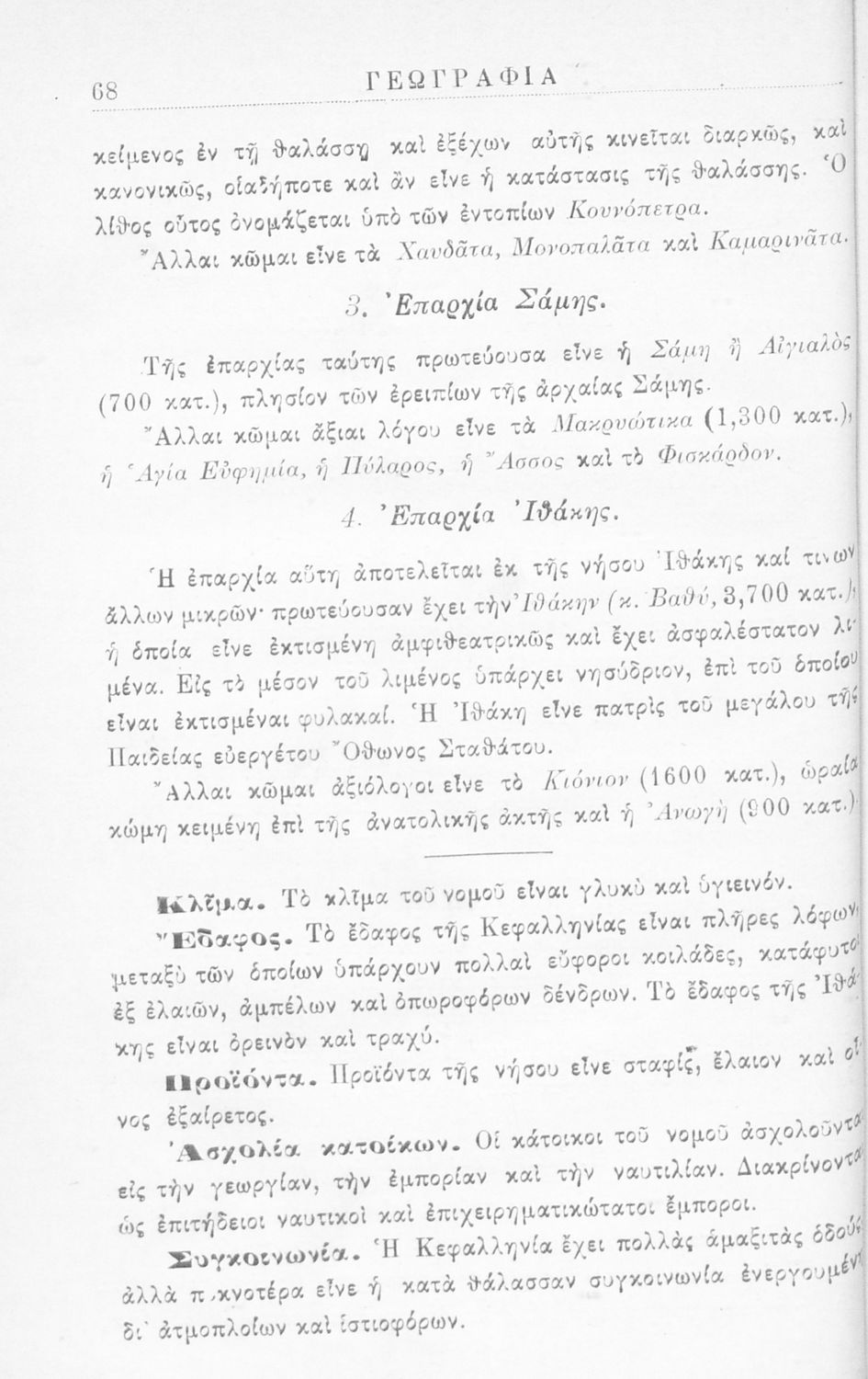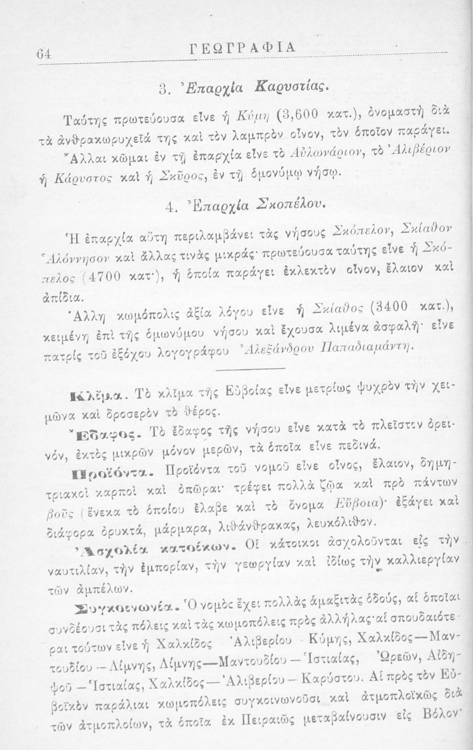 Σχολικό εγχειρίδιο Γεωγραφίας για τις Γ΄, Δ΄, Ε΄, ΣΤ΄ Δημοτικού που περιλαμβάνει εισαγωγή στην πατριδογνωσία και παρουσιάζει την φυσική και πολιτική γεωγραφία της Παλαιάς και Νέας Ελλάδας.
