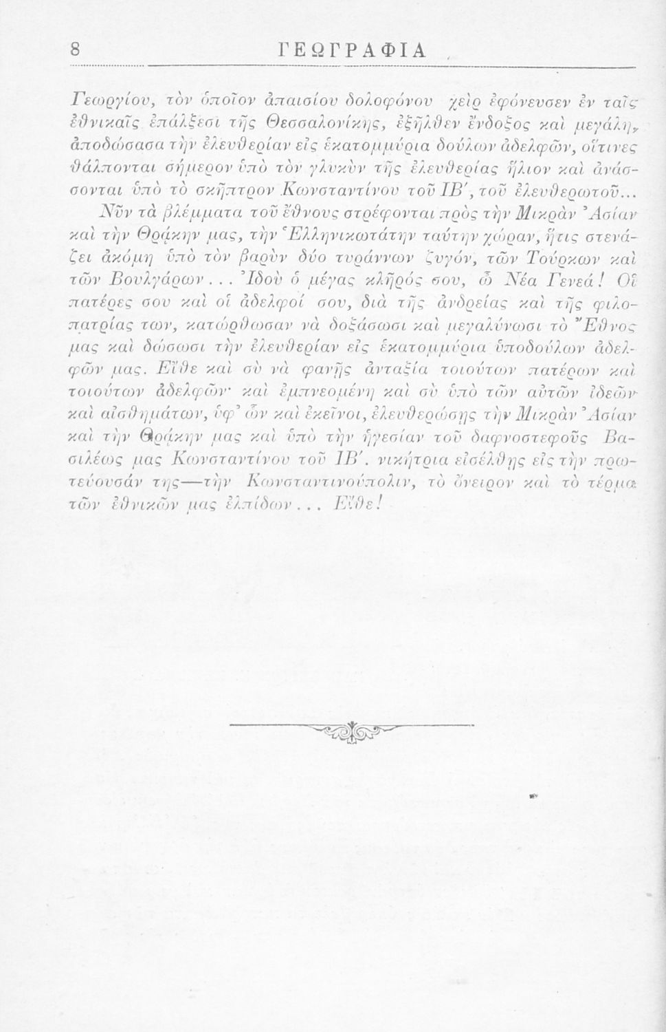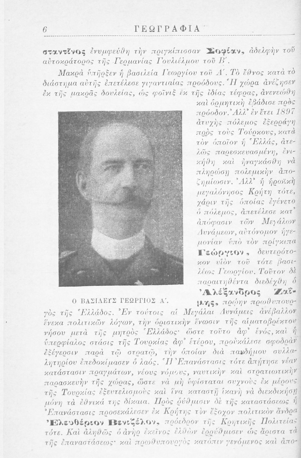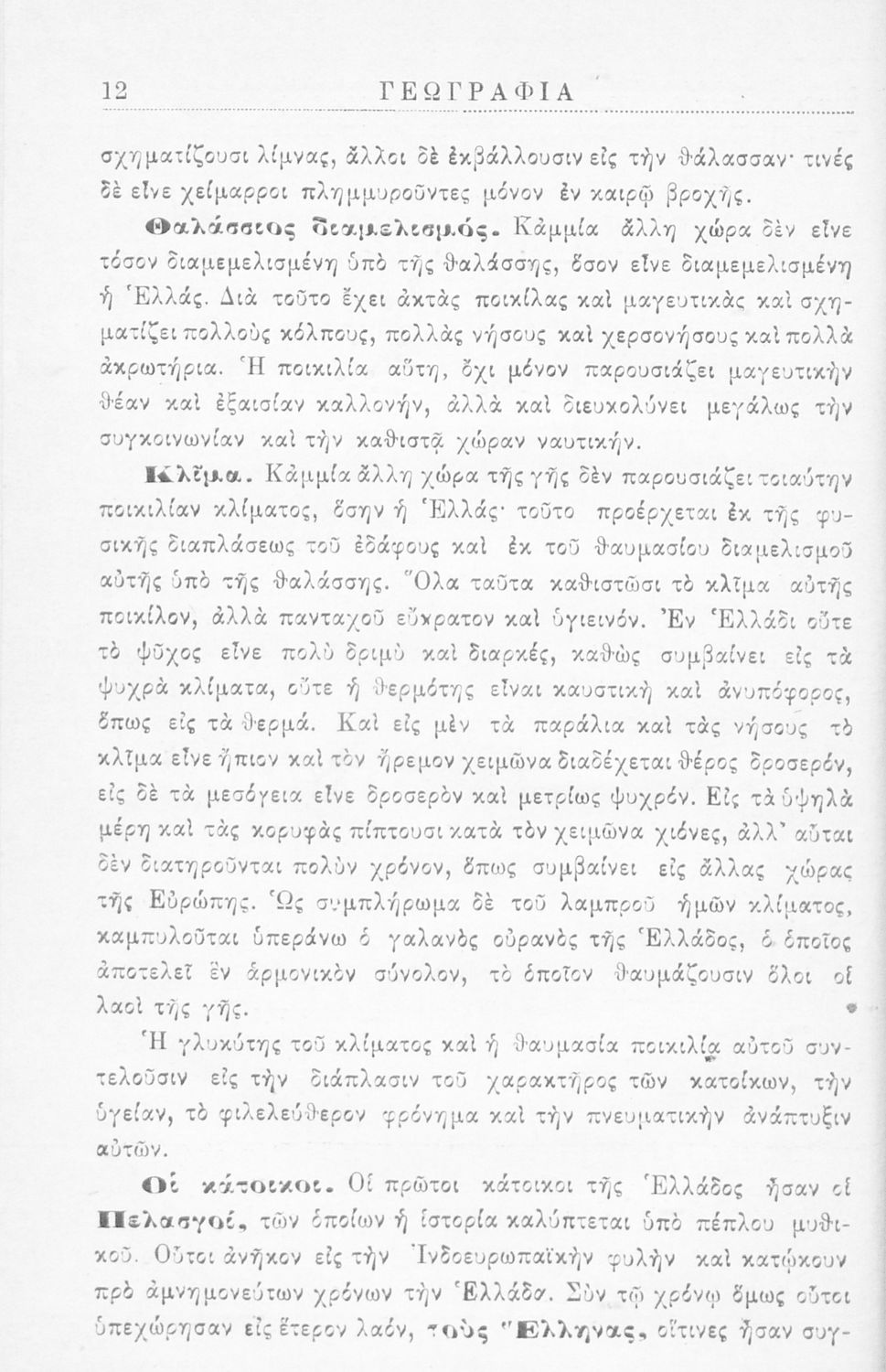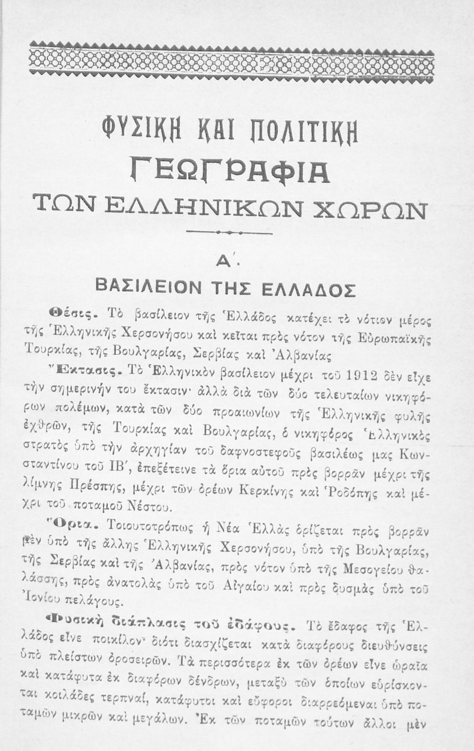 Σχολικό εγχειρίδιο Γεωγραφίας Δημοτικού που παρουσιάζει την φυσική, οικονομική και πολιτική γεωγραφία της Παλαιάς και Νέας Ελλάδας. Περιέχει και εκτενή αναφορά στις "αλύτρωτες ελληνικές χώρες και νησιά" στις οποίες περιλαμβάνει την Σερβική και Βουλγαρική Μακεδονία, τη Θράκη, τα Δωδεκάνησα και την Κύπρο.