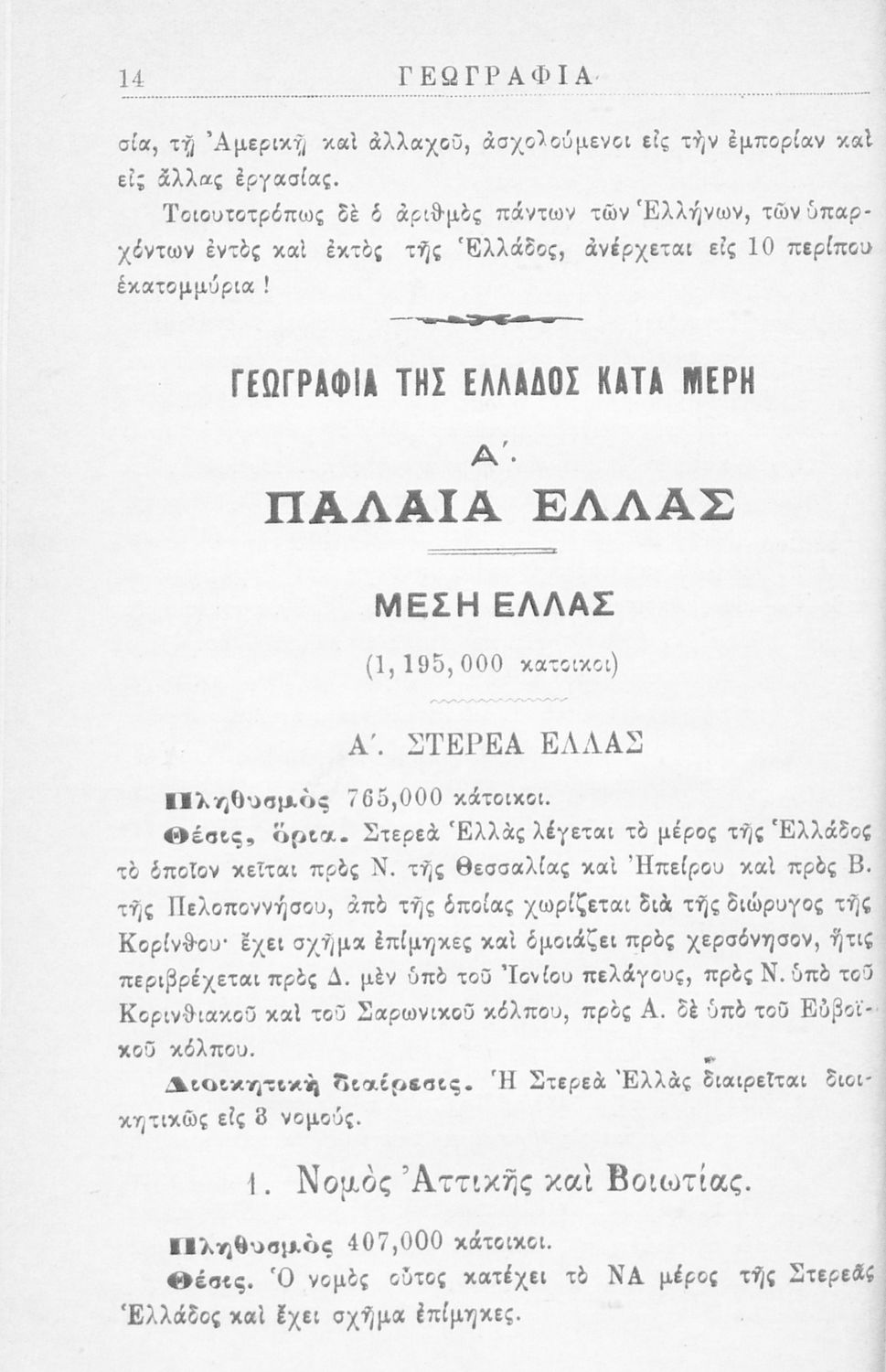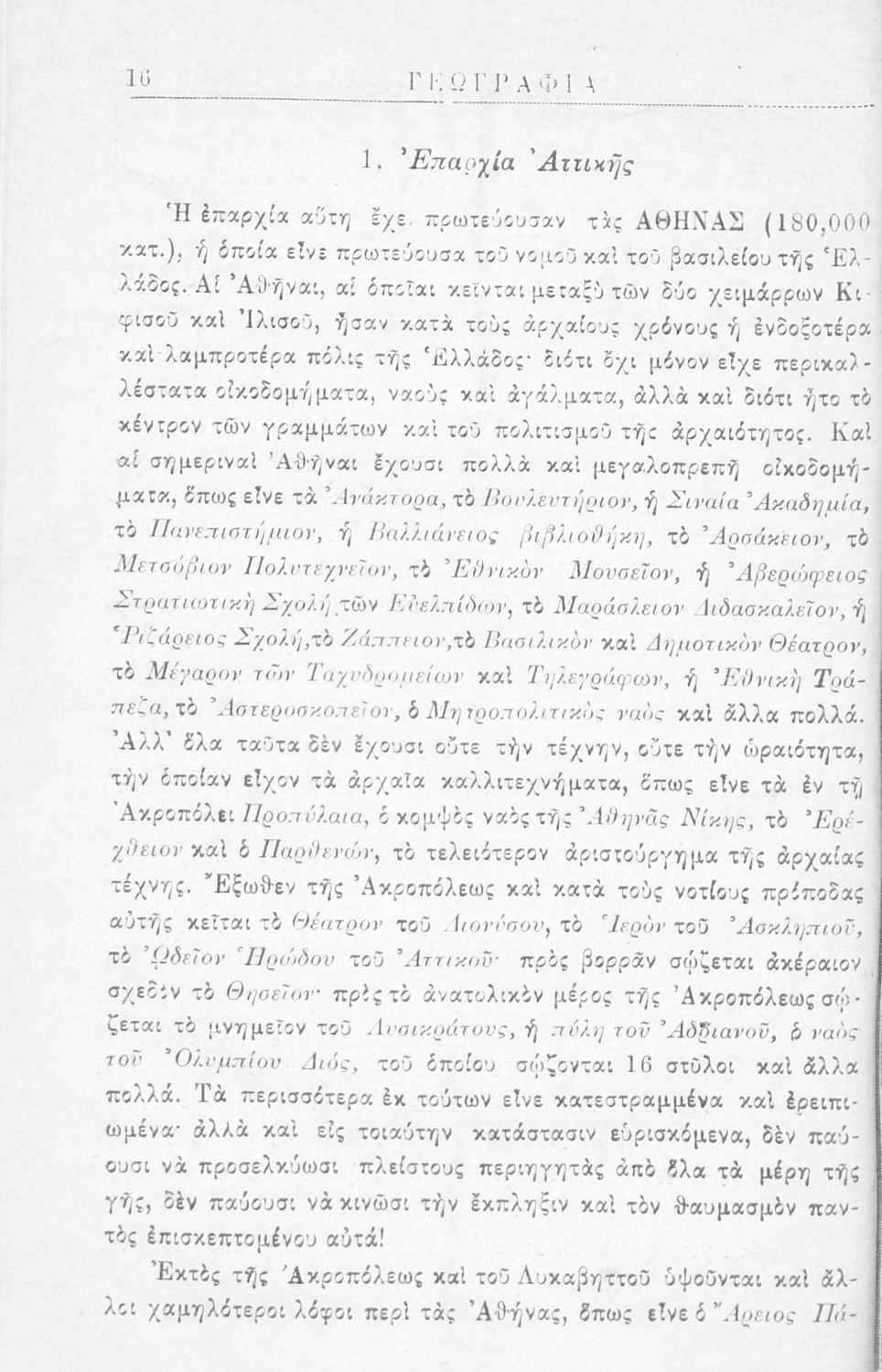 Σχολικό εγχειρίδιο Γεωγραφίας για την Γ' Δημοτικού. Είναι σύμφωνο με το αναλυτικό πρόγραμμα του 1913. Περιλαμβάνει στοιχεία πατριδογνωσίας, γεωγραφικούς ορισμούς και στοιχεία της Αττικής και των επαρχιών της.