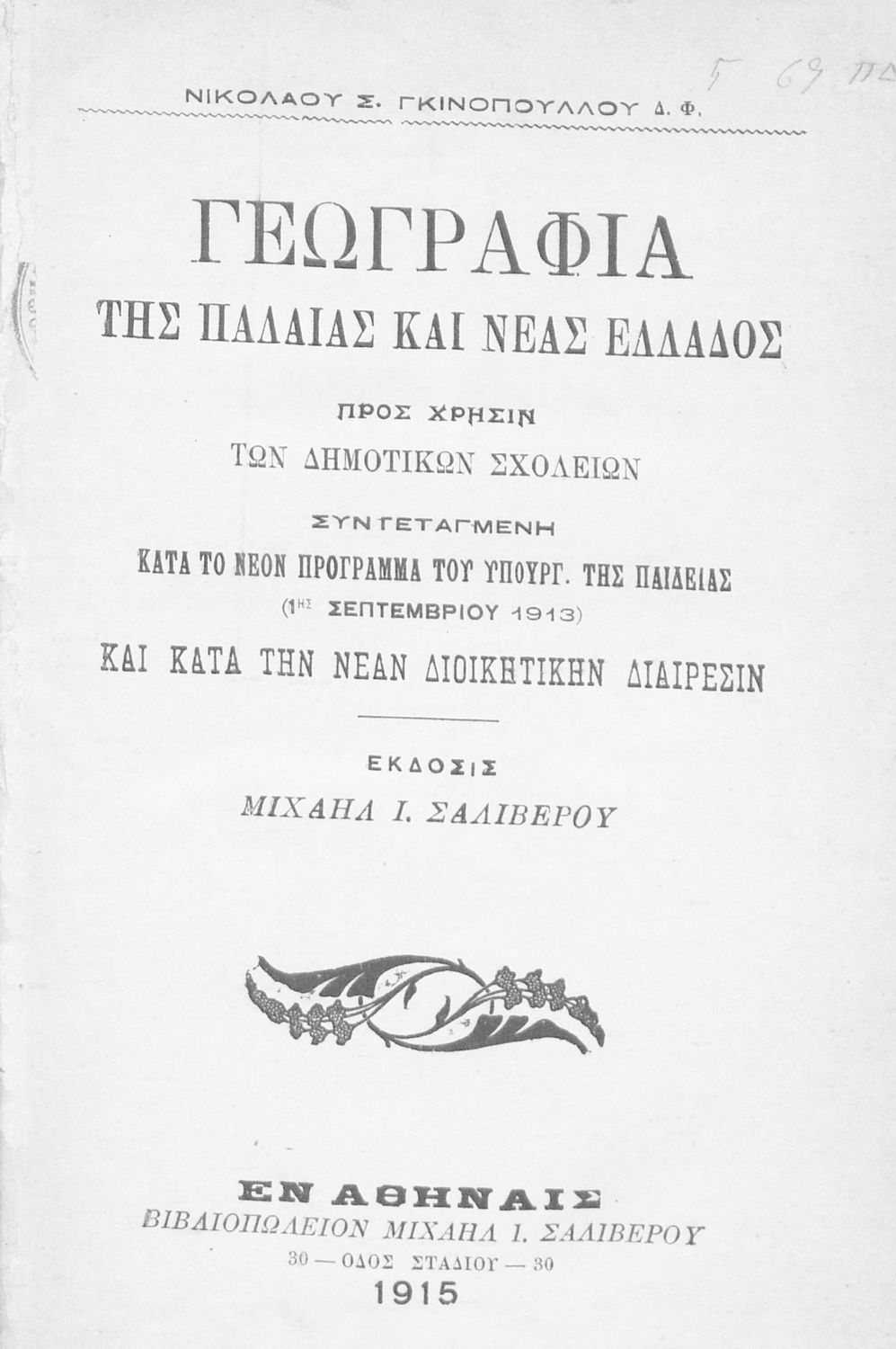 Τίτλος: Γεωγραφία της Παλαιάς και Νέας Ελλάδος προς χρήσιν των Δημοτικών Σχολείων