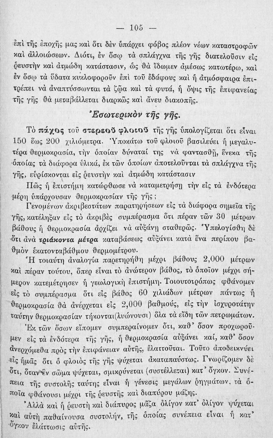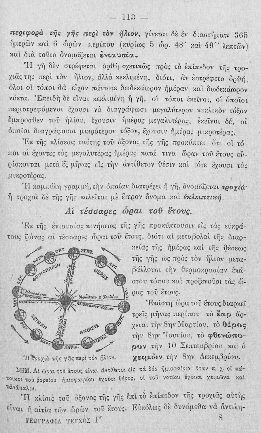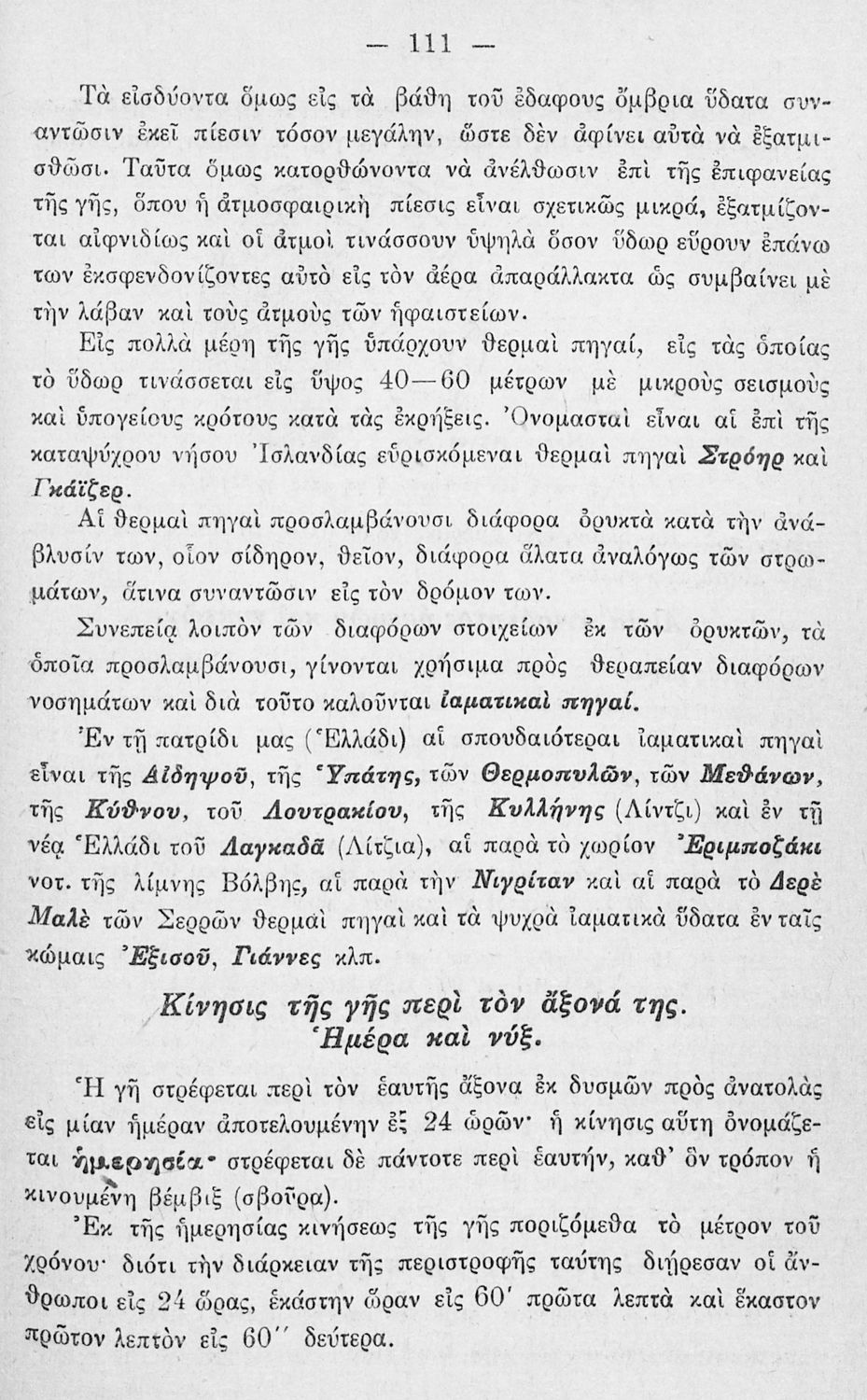 Σχολικό εγχειρίδιο Γεωγραφίας για τις Ε΄ και ΣΤ΄ Δημοτικού που περιλαμβάνει στοιχεία μαθηματικής και φυσικής γεωγραφίας, γεωλογίας και κοσμογραφίας, και εξετάζει την Ελλάδα και ενδεικτικές χώρες από τις πέντε ηπείρους. Περιέχει και αναφορά στις "αλύτρωτες ελληνικές χώρες" στις οποίες περιλαμβάνει την Σερβική και Βουλγαρική Μακεδονία, τη Βόρεια Ήπειρο, τη Θράκη, τη Μικρά Ασία, τη Ρόδο και την Κύπρο.