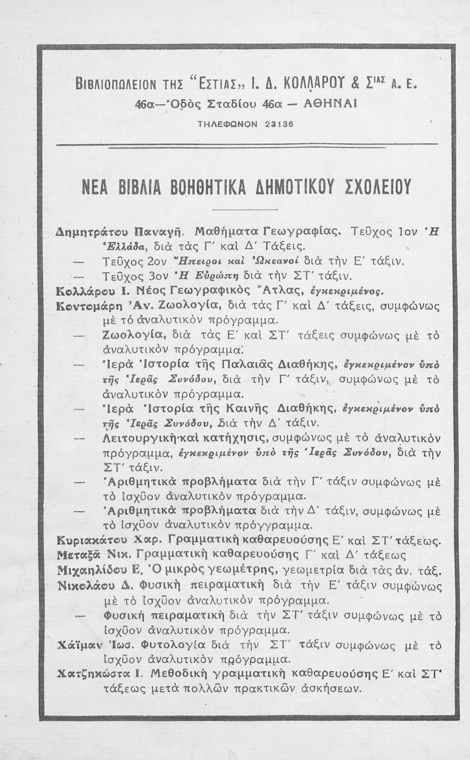 Εκδότης: Ιωάννης Δ. Κολλάρος, Βιβλιοπωλείο της "Εστίας"
