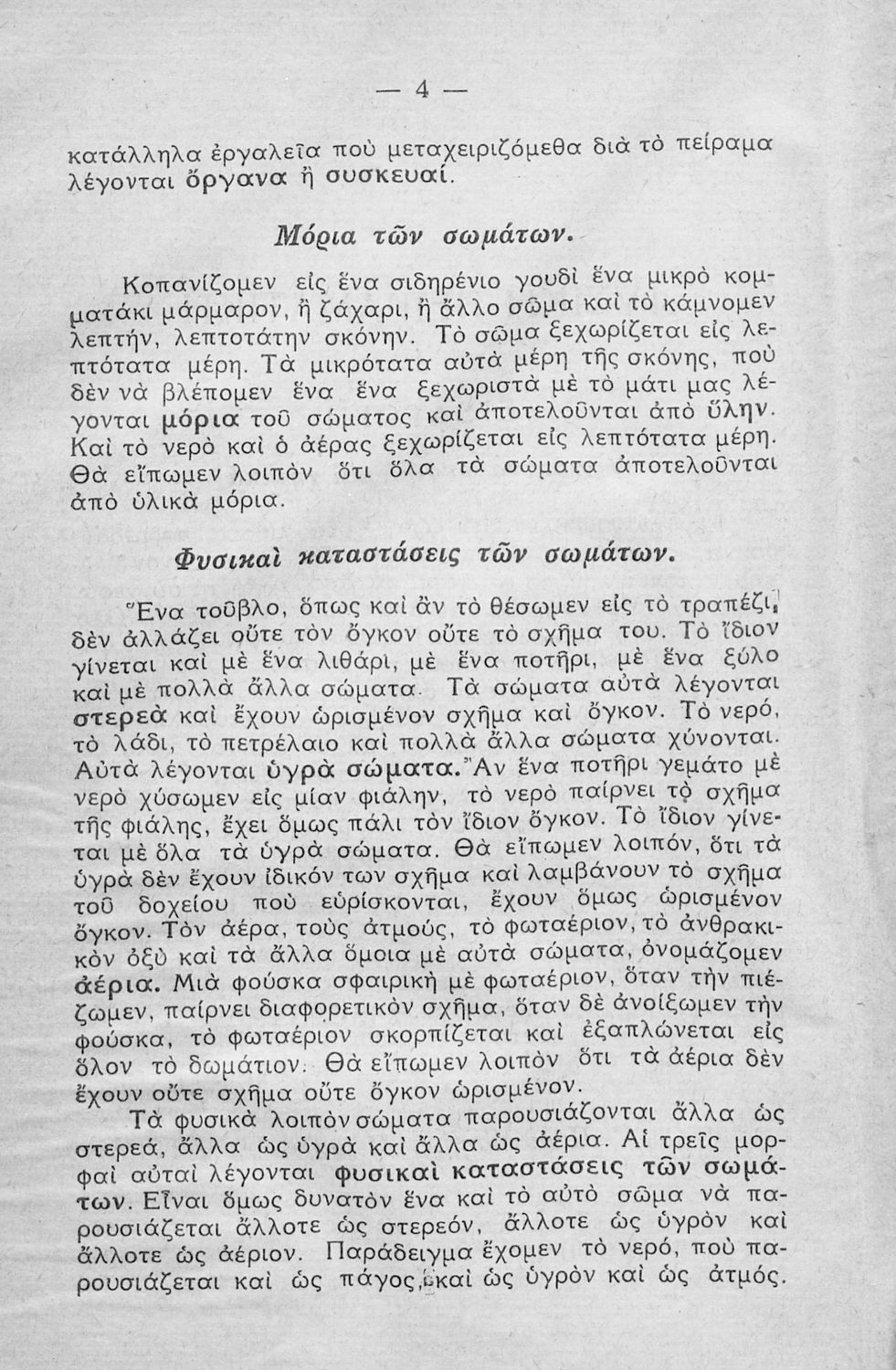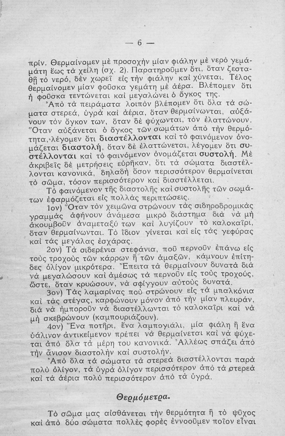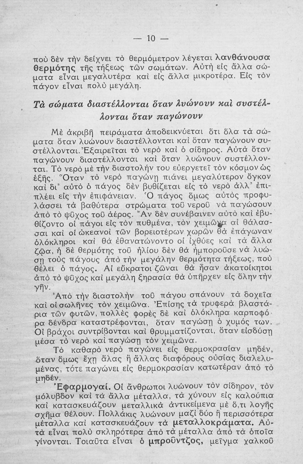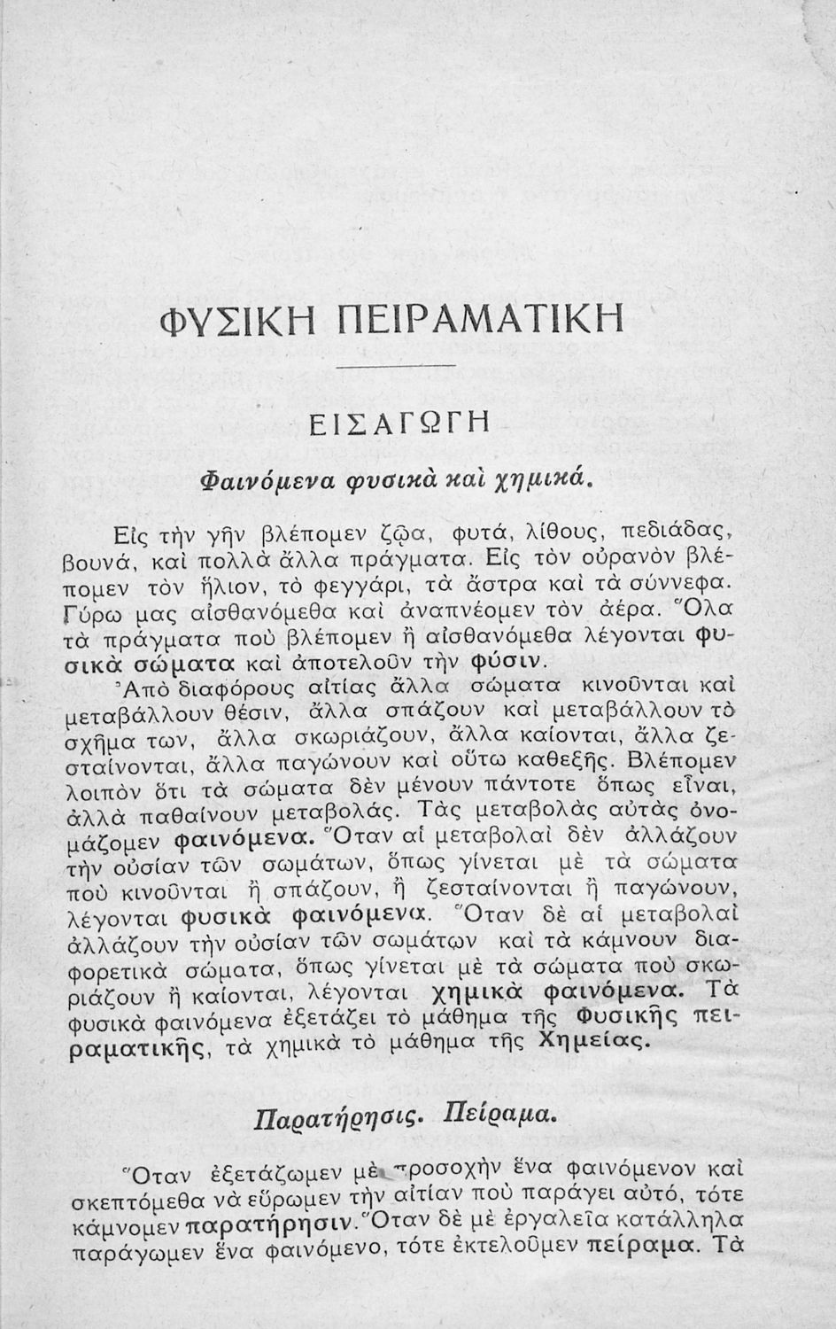 Βαθμίδα εκπαίδευσης: Πρωτοβάθμια Τάξη: Ε' Δημοτικού Μάθημα: Φυσική Γλώσσα: Καθαρεύουσα Παρουσίαση περιεχομένου: Σχολικό εγχειρίδιο για την Ε΄ Γυμνασίου για το μάθημα της Φυσικής. Το εγχειρίδιο περιλαμβάνει τις βασικές έννοιες της φυσικής και των φυσικών και χημικών φαινομένων, της θερμότητας, της εξαέρωσης, της αιολικής ενέργειας, της βαρύτητας, της πίεσης, της πυκνότητας, της αρχής του Αρχιμήδη κ.α. |
