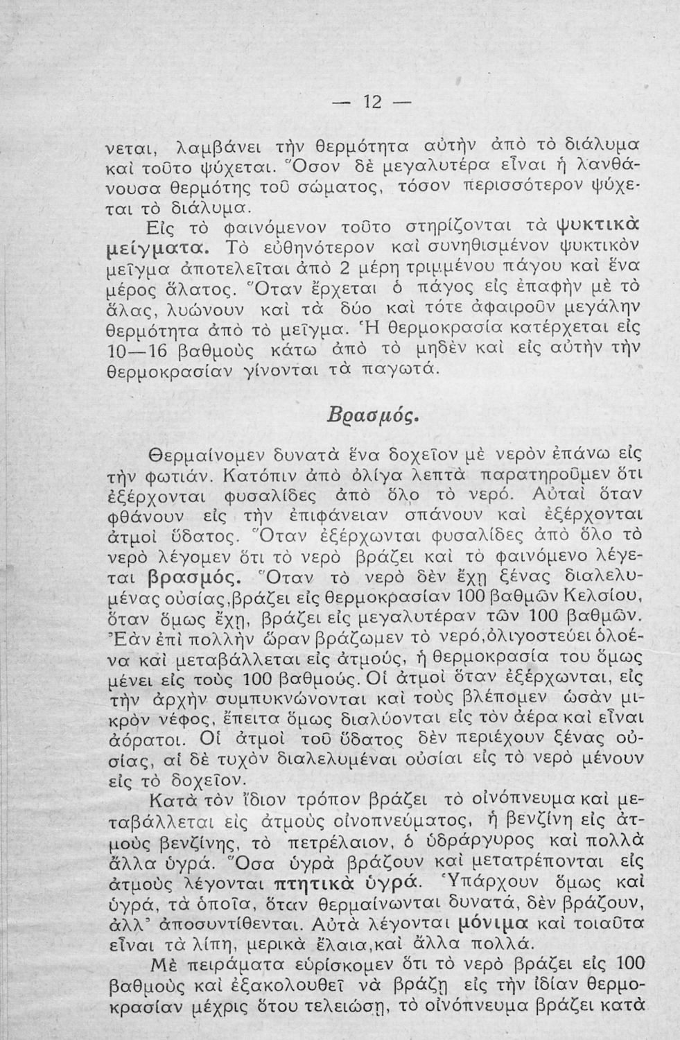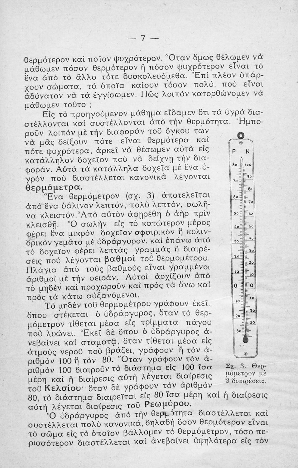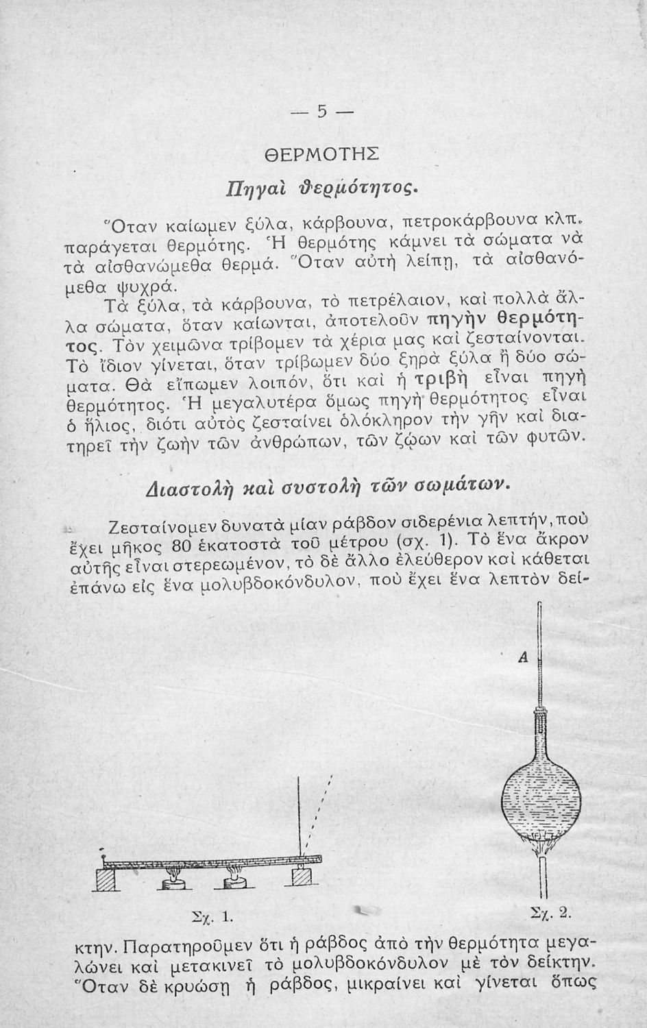 Βαθμίδα εκπαίδευσης: Πρωτοβάθμια Τάξη: Ε' Δημοτικού Μάθημα: Φυσική Γλώσσα: Καθαρεύουσα Παρουσίαση περιεχομένου: Σχολικό εγχειρίδιο για την Ε΄ Γυμνασίου για το μάθημα της Φυσικής. Το εγχειρίδιο περιλαμβάνει τις βασικές έννοιες της φυσικής και των φυσικών και χημικών φαινομένων, της θερμότητας, της εξαέρωσης, της αιολικής ενέργειας, της βαρύτητας, της πίεσης, της πυκνότητας, της αρχής του Αρχιμήδη κ.α. |