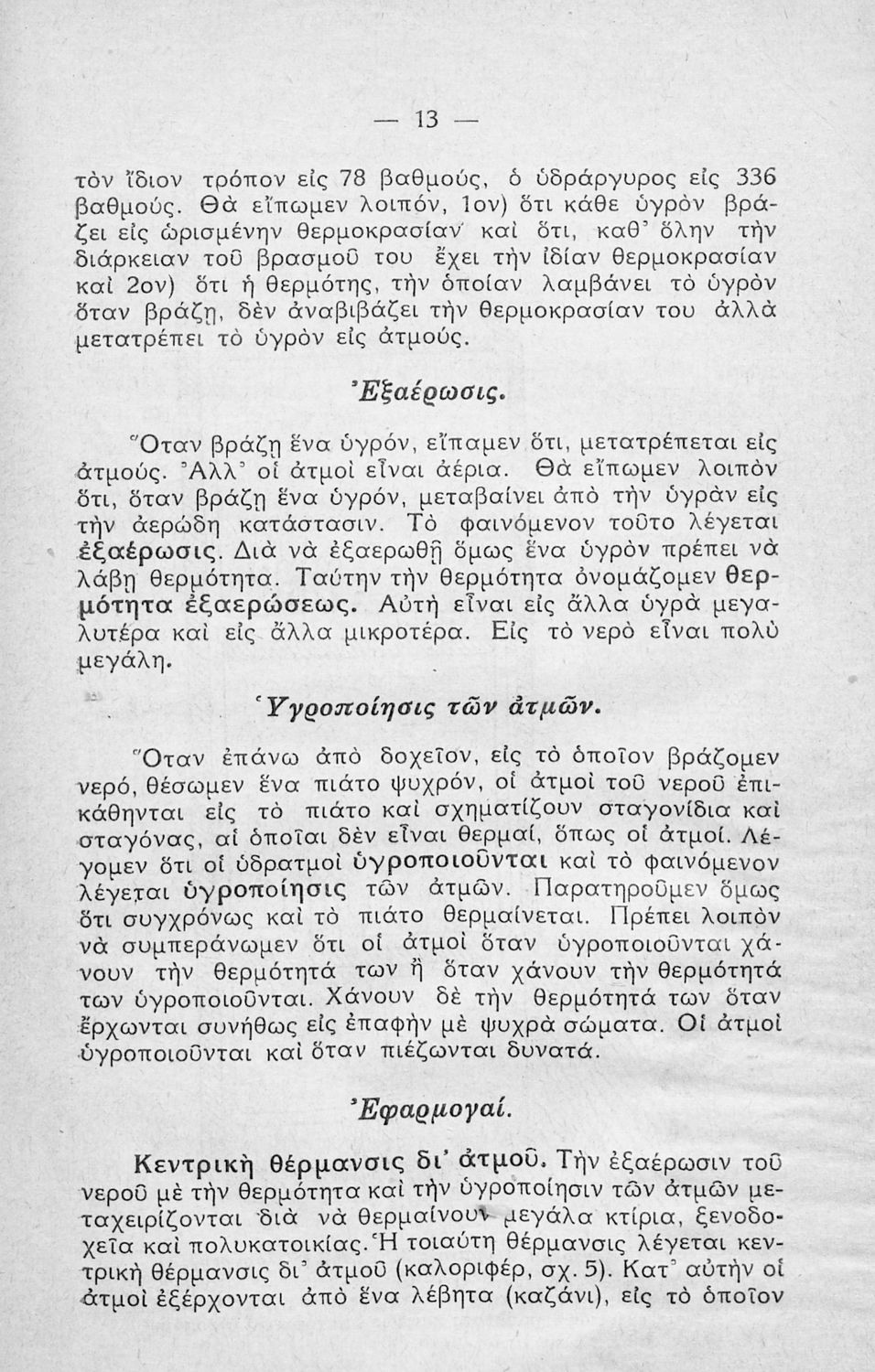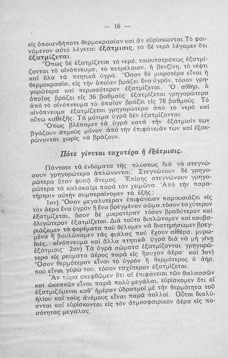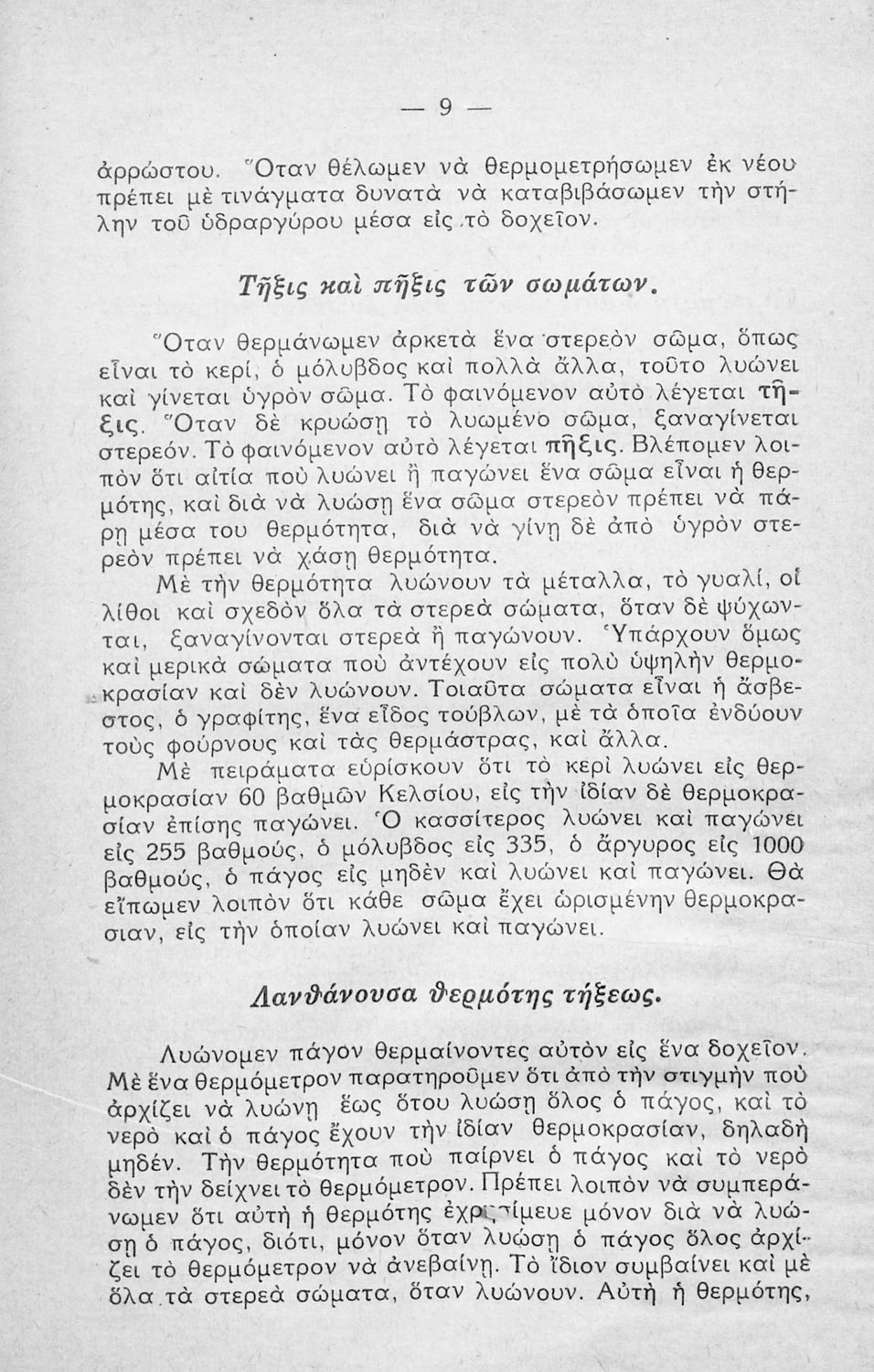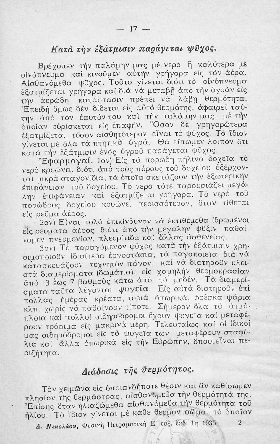 Βαθμίδα εκπαίδευσης: Πρωτοβάθμια Τάξη: Ε' Δημοτικού Μάθημα: Φυσική Γλώσσα: Καθαρεύουσα Παρουσίαση περιεχομένου: Σχολικό εγχειρίδιο για την Ε΄ Γυμνασίου για το μάθημα της Φυσικής. Το εγχειρίδιο περιλαμβάνει τις βασικές έννοιες της φυσικής και των φυσικών και χημικών φαινομένων, της θερμότητας, της εξαέρωσης, της αιολικής ενέργειας, της βαρύτητας, της πίεσης, της πυκνότητας, της αρχής του Αρχιμήδη κ.α. |