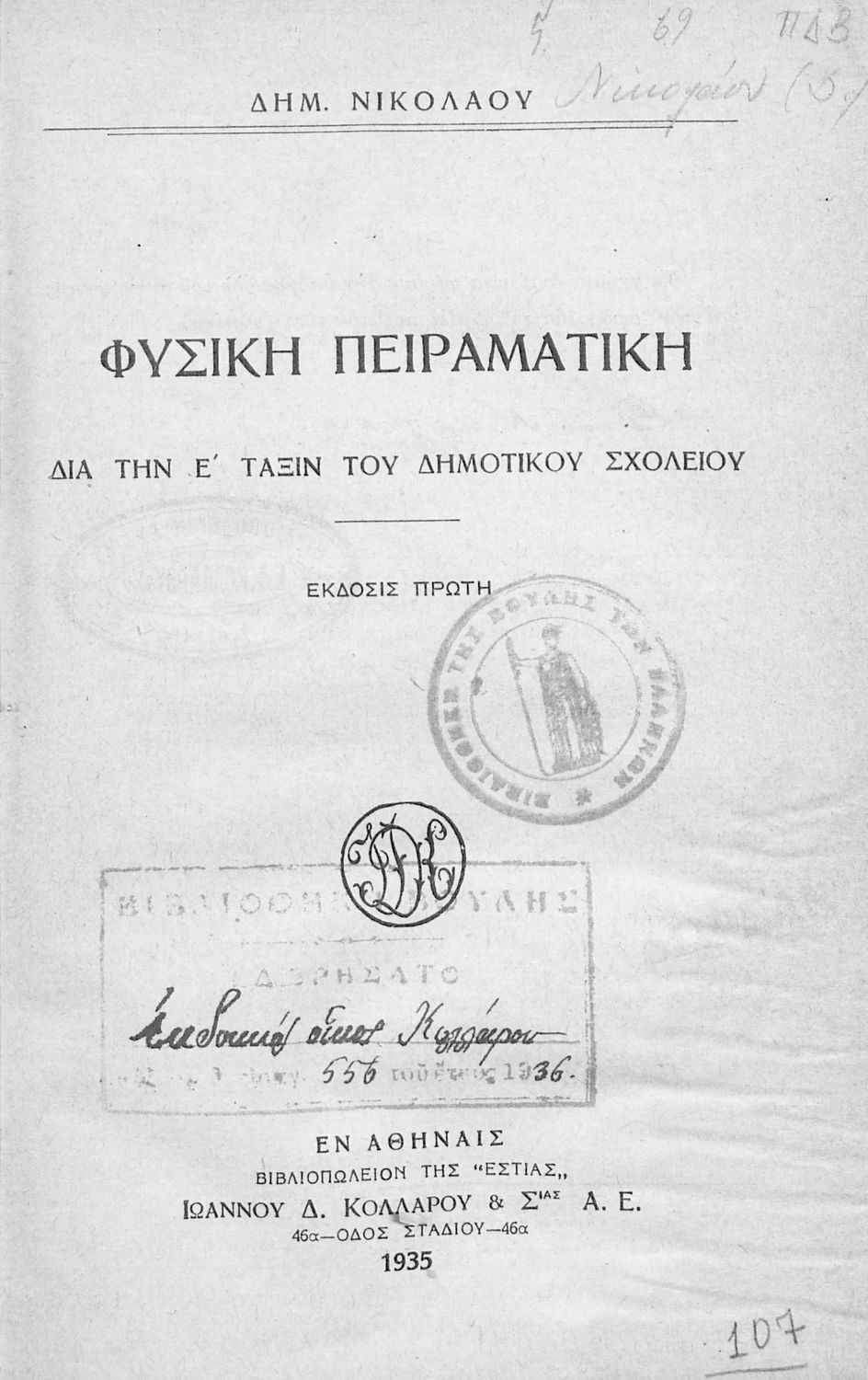 Κωδικός αναγνώρισης: 03-20560553 Τίτλος: Φυσική πειραματική δια την Ε΄ τάξιν του Δημοτικού Σχολείου Συγγραφέας: Δημ. Νικολάου Μέγεθος και υπόστρωμα: Σχολικό εγχειρίδιο, 21εκ., σκληρό εξώφυλλο, 82 σελίδες. Σχεδιαγράμματα (ασπρόμαυρα). |