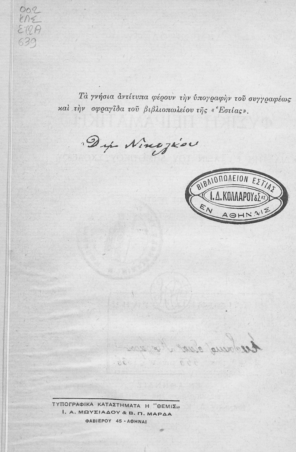 Εκδότης: Ιωάννης Δ. Κολλάρος, Βιβλιοπωλείο της "Εστίας" Έτος έκδοσης: 1935 Τόπος έκδοσης: Αθήνα Έκδοση: 1η |