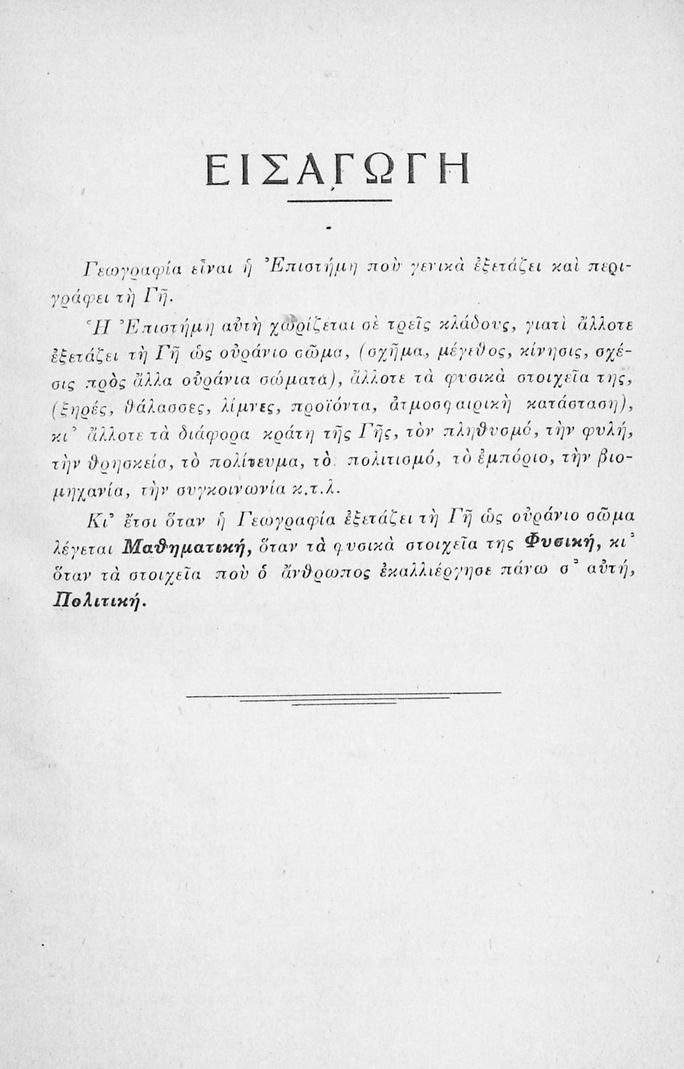 Σχολικό εγχειρίδιο Γεωγραφίας για τους μαθητές της Γ΄ τάξης των Ελληνικών Σχολείων και των Παρθεναγωγείων που περιέχει εισαγωγή στη μαθηματική, φυσική, φυσιογραφική και ανθρωπολογική γεωγραφία και παρουσιάζει ...
