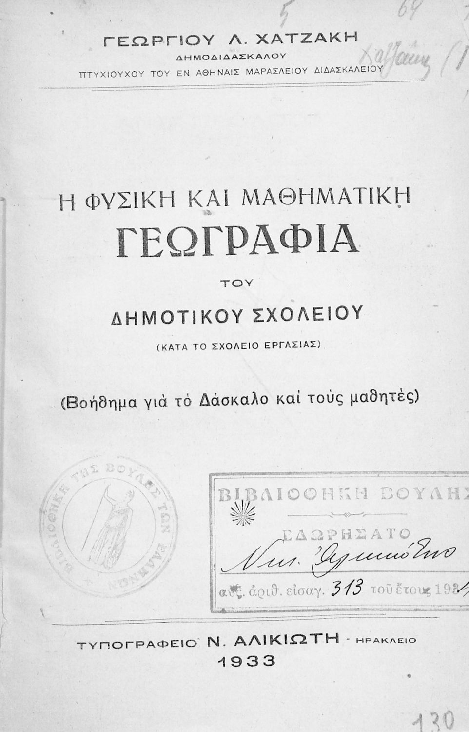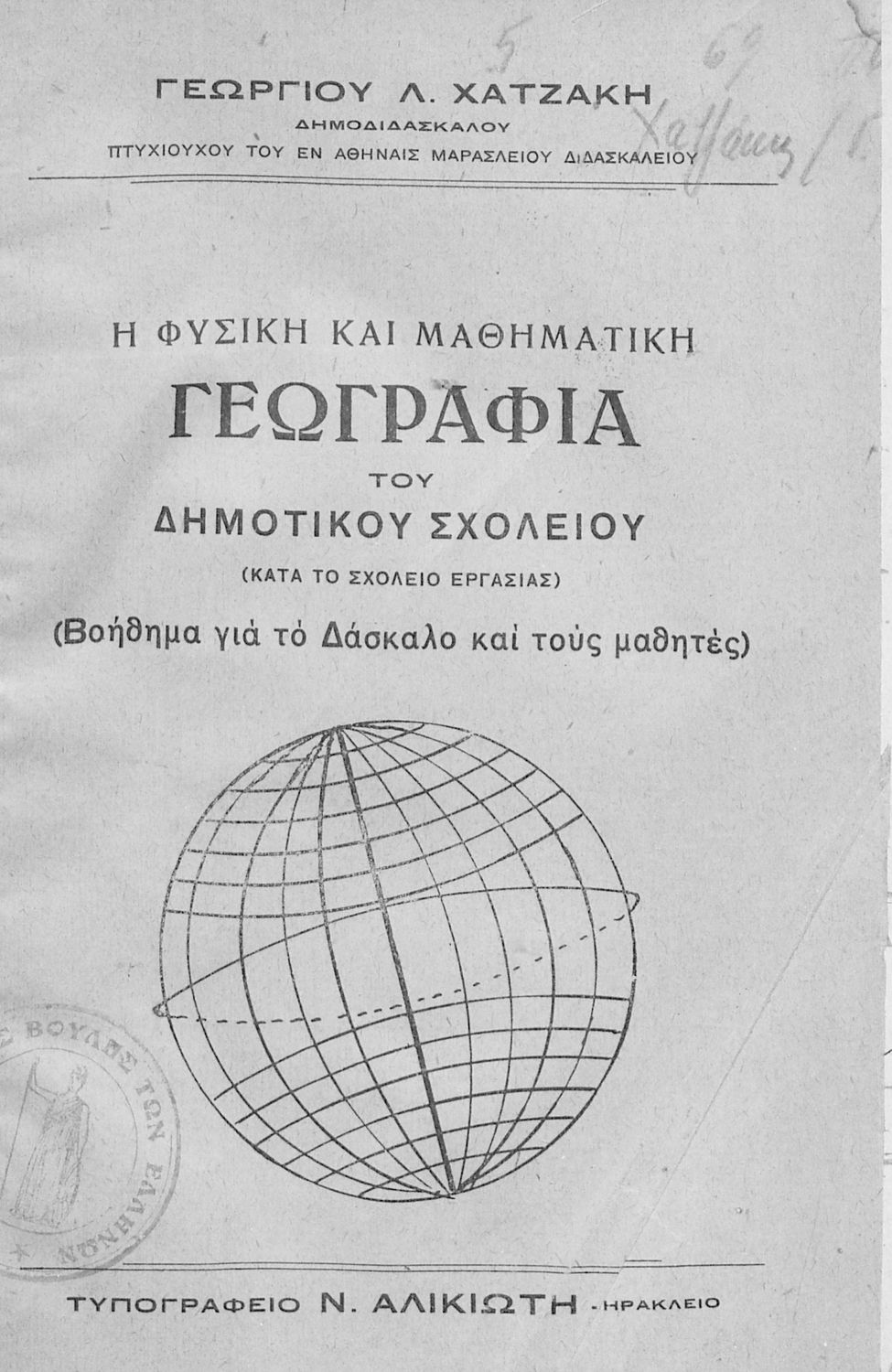 Τίτλος: Η Φυσική και Μαθηματική Γεωγραφία του Δημοτικού Σχολείου (κατά το σχολείο εργασίας) (βοήθημα για το Δάσκαλο και τους μαθητές)