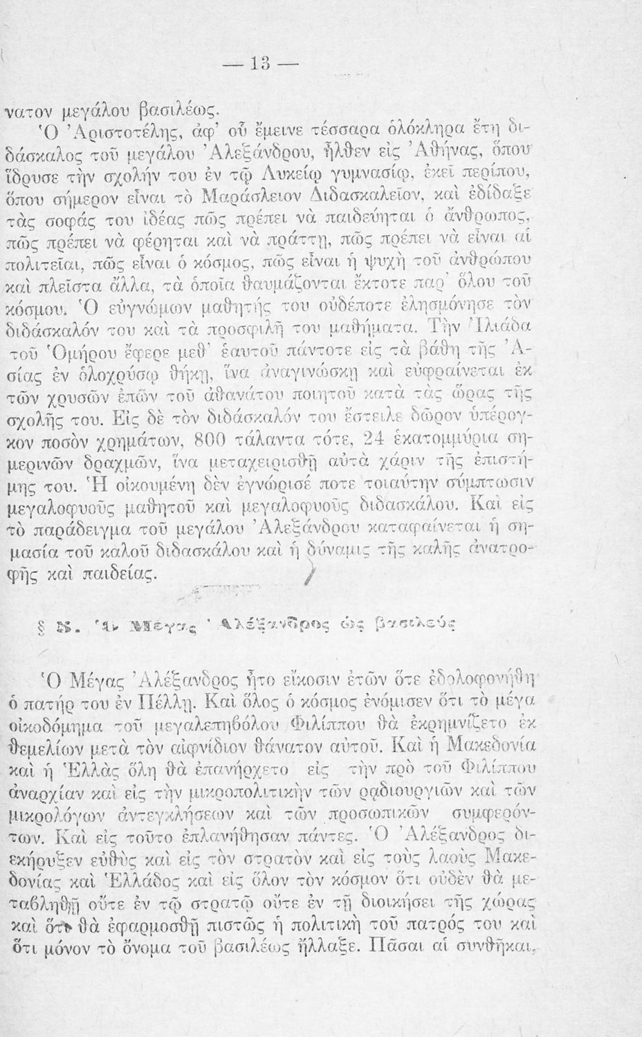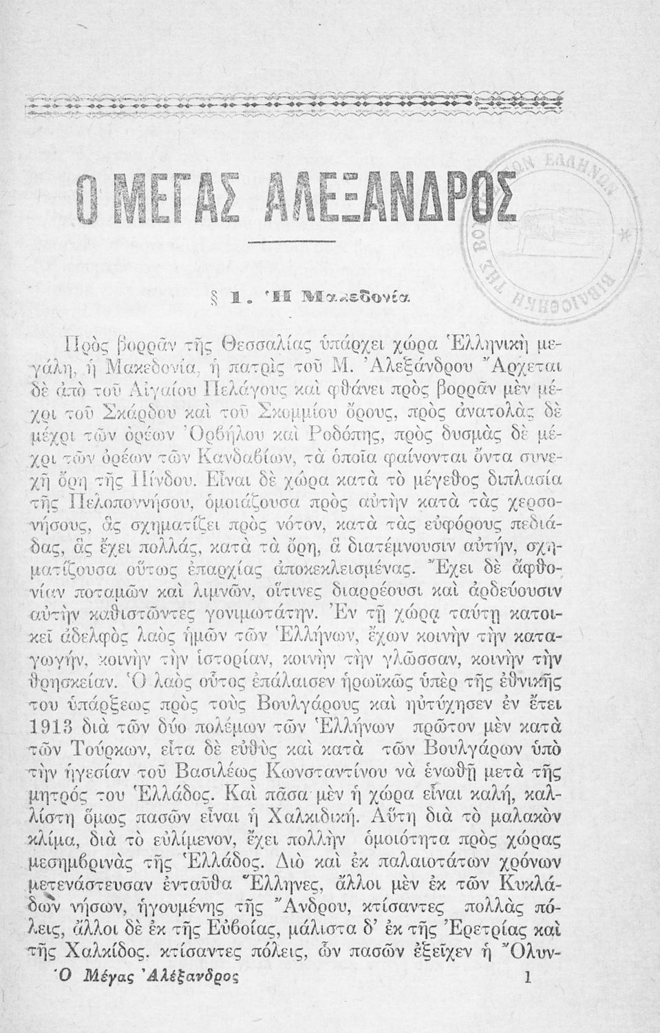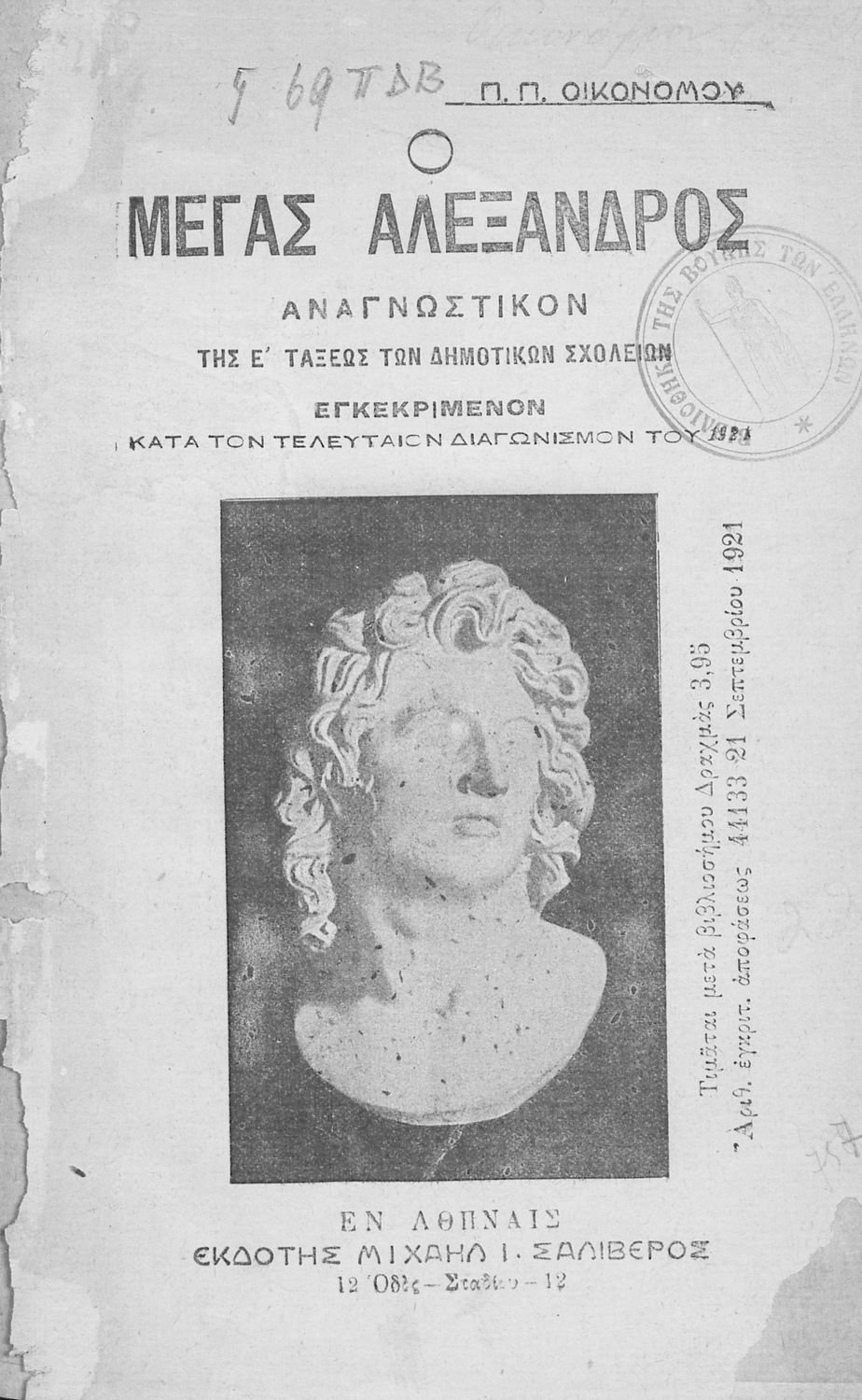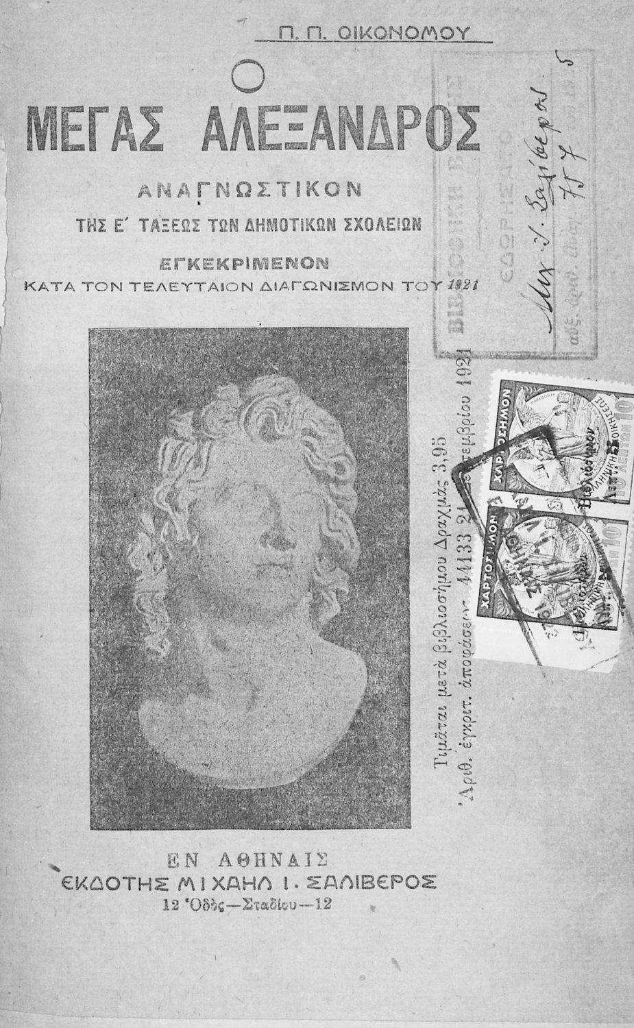 Βαθμίδα εκπαίδευσης: Πρωτοβάθμια Τάξη: Ε' Δημοτικού Μάθημα: Νέα Ελληνικά Γλώσσα: Απλή καθαρεύουσα Παρουσίαση περιεχομένου: Το σύγγραμμα ήταν σχολικό εγχειρίδιο για το μάθημα της Γλώσσας στο Δημοτικό. Περιέχει το βίο και τα κατορθώματα του Μεγάλου Αλεξάνδρου. Καλλιεργεί την εθνική και ιστορική συνείδηση των μαθητών. |