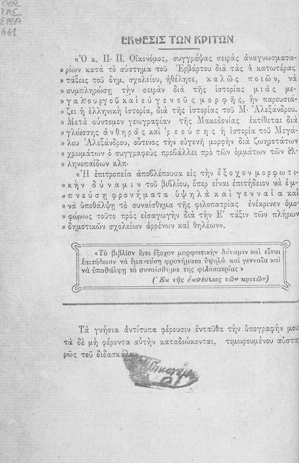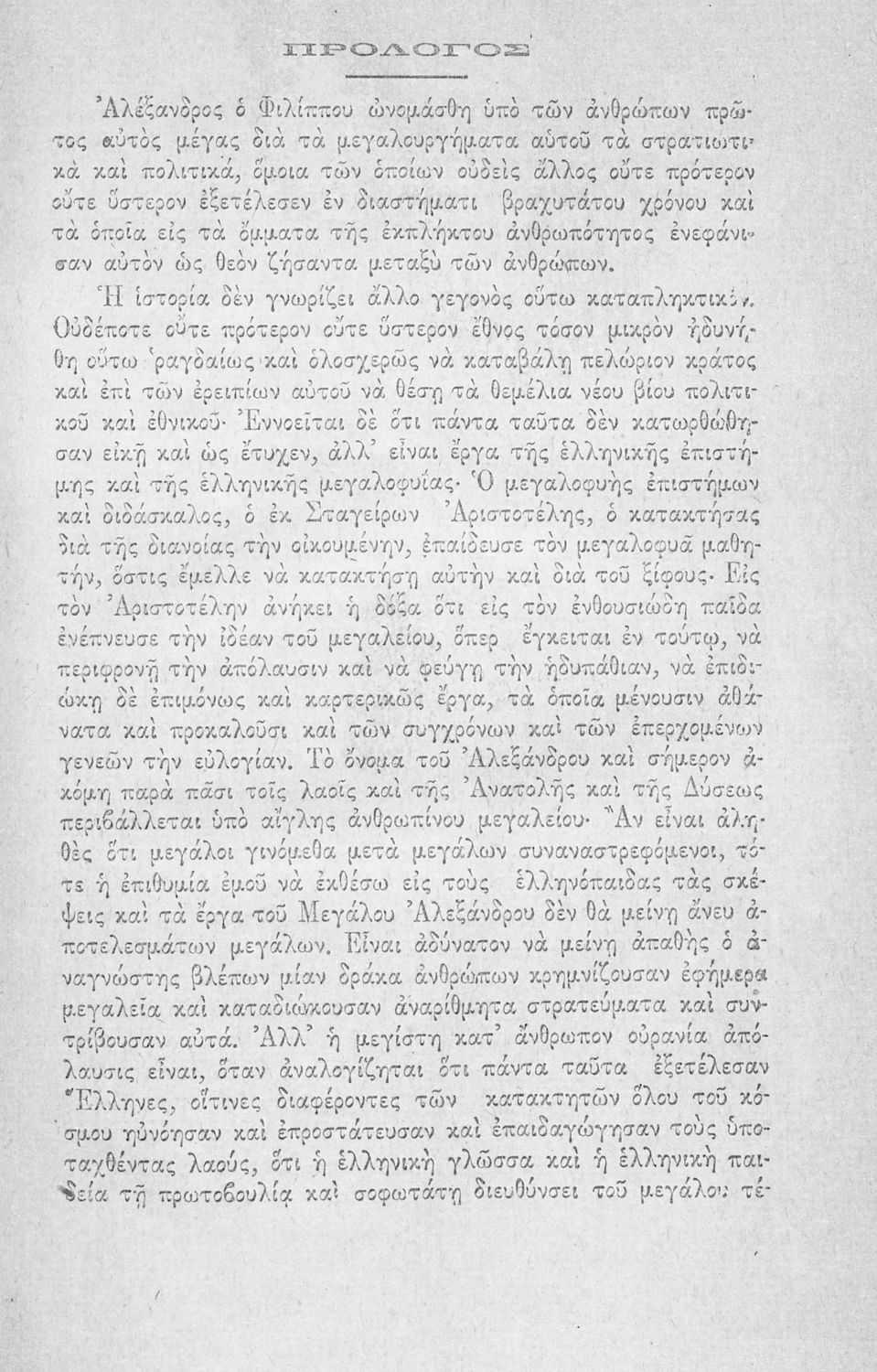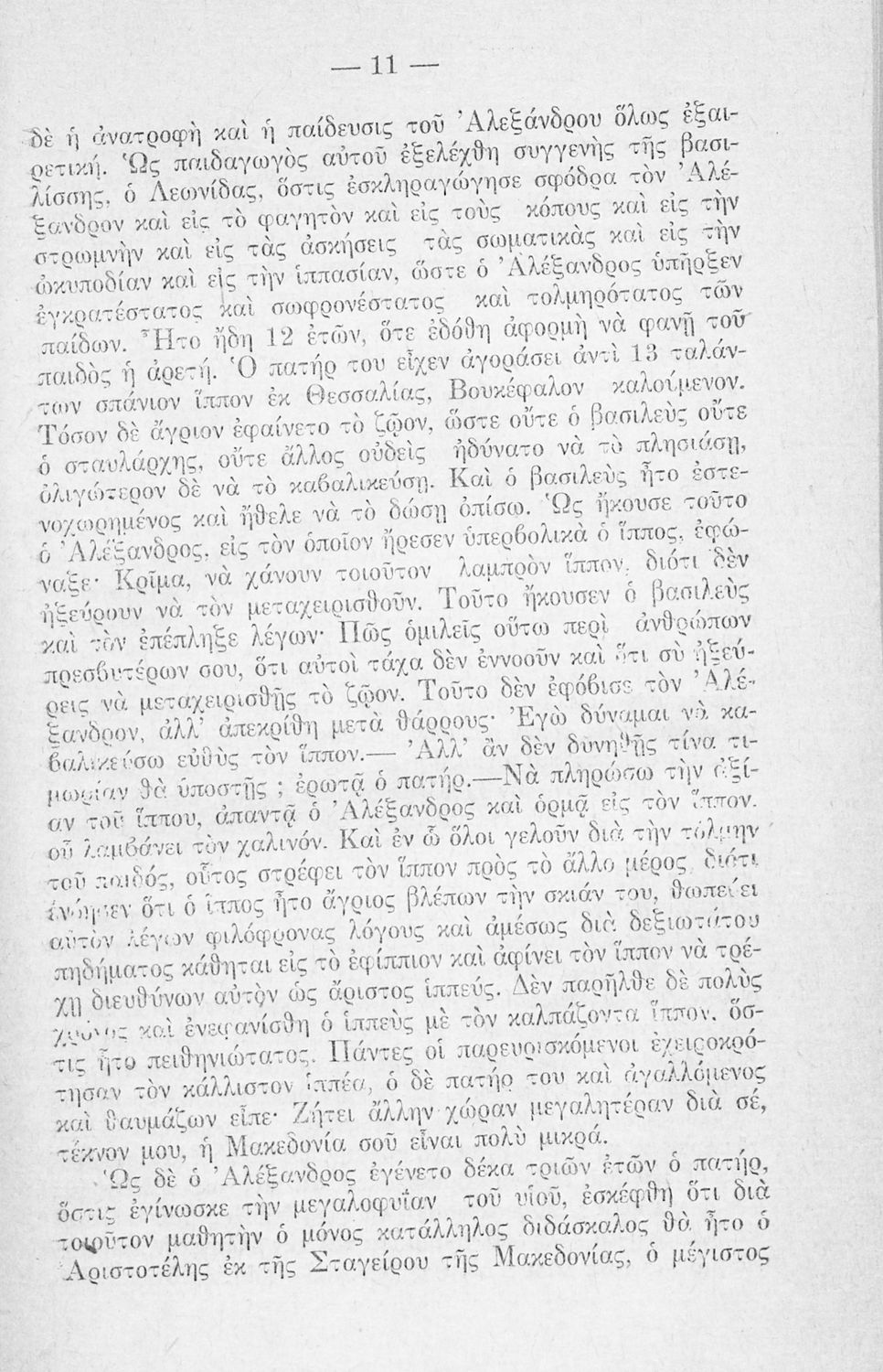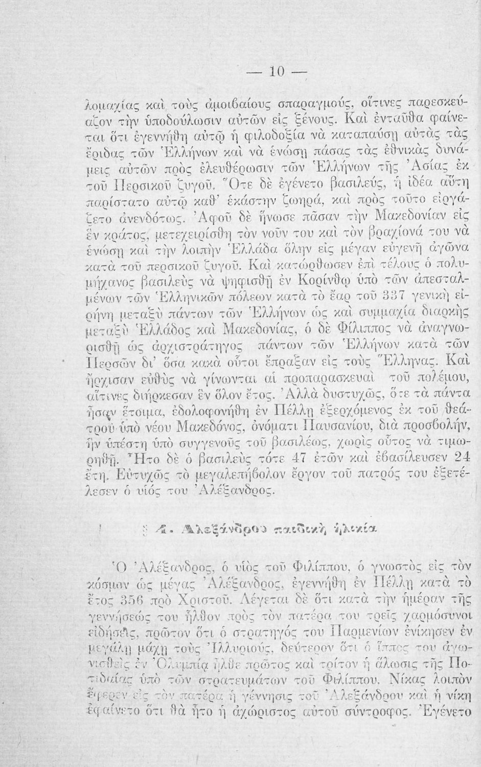 Βαθμίδα εκπαίδευσης: Πρωτοβάθμια Τάξη: Ε' Δημοτικού Μάθημα: Νέα Ελληνικά Γλώσσα: Απλή καθαρεύουσα Παρουσίαση περιεχομένου: Το σύγγραμμα ήταν σχολικό εγχειρίδιο για το μάθημα της Γλώσσας στο Δημοτικό. Περιέχει το βίο και τα κατορθώματα του Μεγάλου Αλεξάνδρου. Καλλιεργεί την εθνική και ιστορική συνείδηση των μαθητών. |