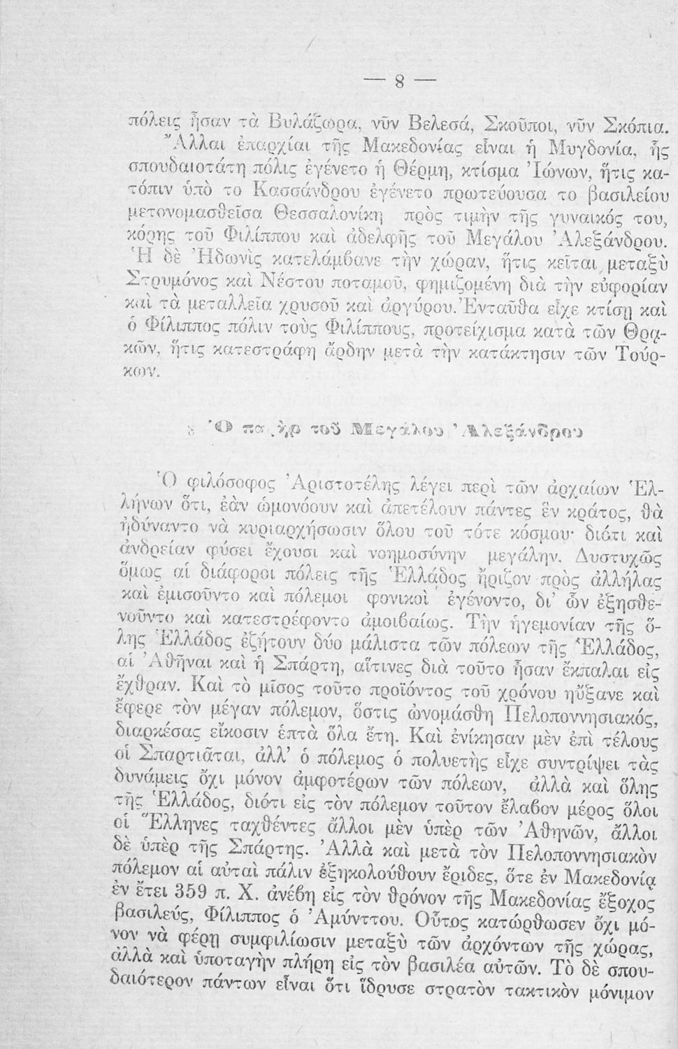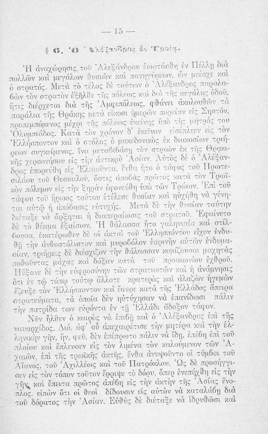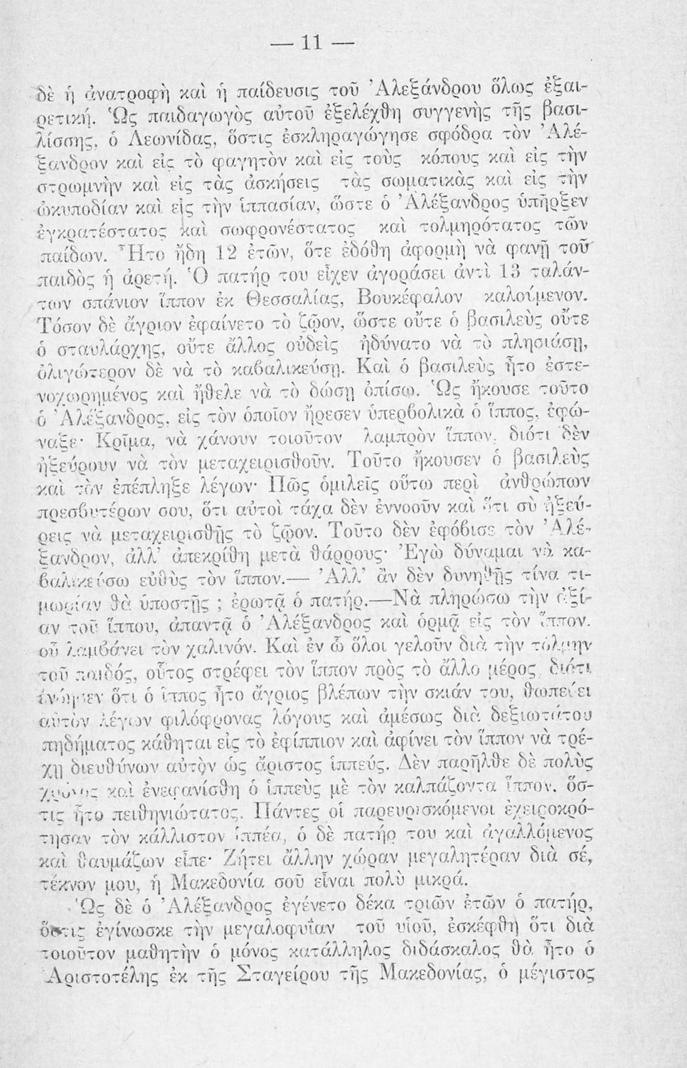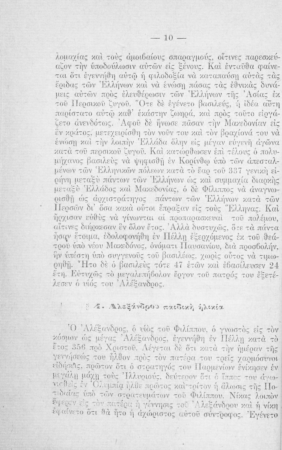 Βαθμίδα εκπαίδευσης: Πρωτοβάθμια Τάξη: Ε' Δημοτικού Μάθημα: Νέα Ελληνικά Γλώσσα: Απλή καθαρεύουσα Παρουσίαση περιεχομένου: Το σύγγραμμα ήταν σχολικό εγχειρίδιο για το μάθημα της Γλώσσας στο Δημοτικό. Περιέχει το βίο και τα κατορθώματα του Μεγάλου Αλεξάνδρου. Καλλιεργεί την εθνική και ιστορική συνείδηση των μαθητών. |
