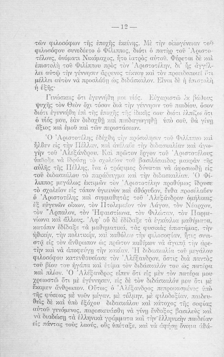 Το σύγγραμμα ήταν σχολικό εγχειρίδιο για το μάθημα της Γλώσσας στο Δημοτικό. Περιέχει το βίο και τα κατορθώματα του Μεγάλου Αλεξάνδρου. Καλλιεργεί την εθνική και ιστορική συνείδηση των μαθητών.