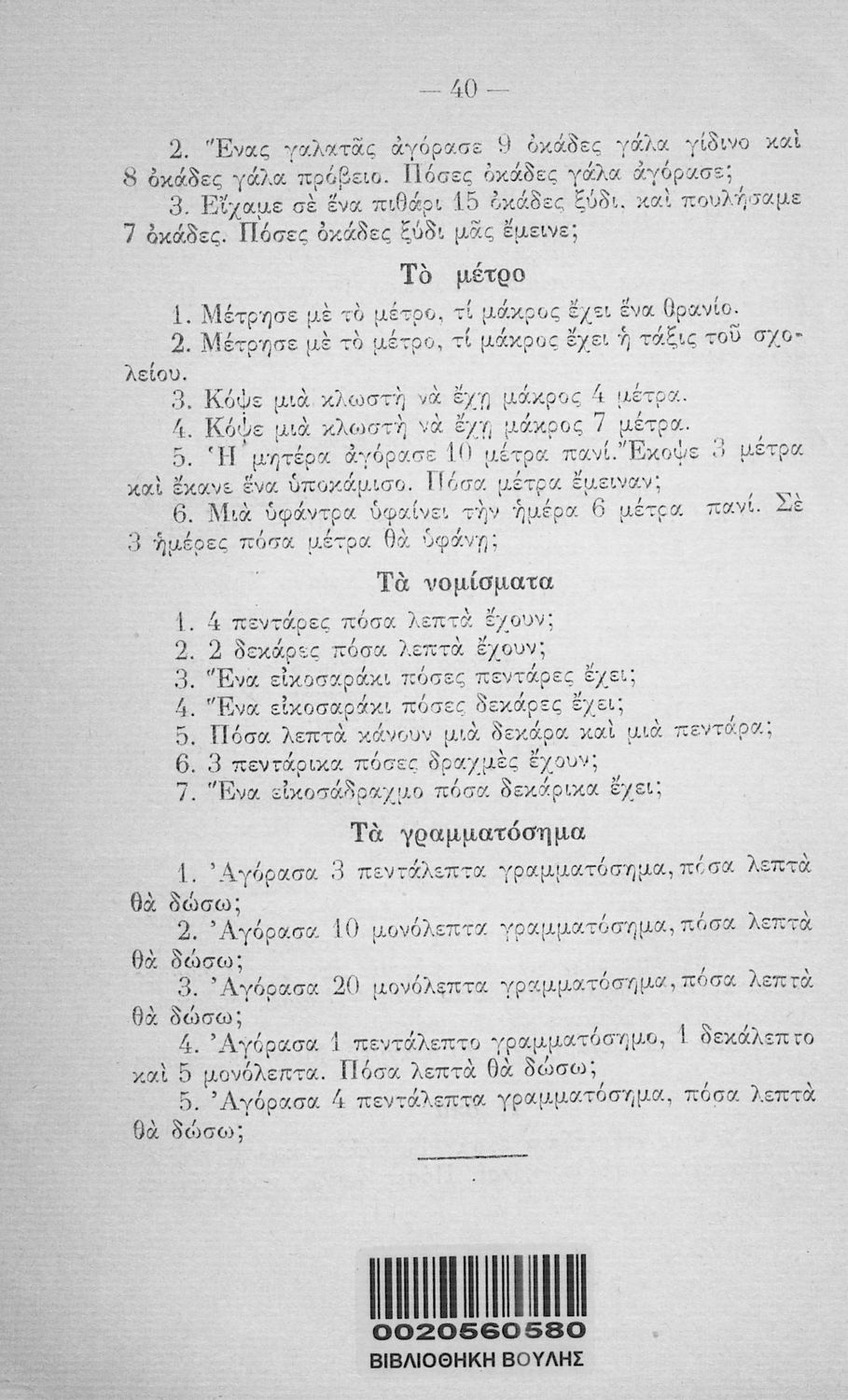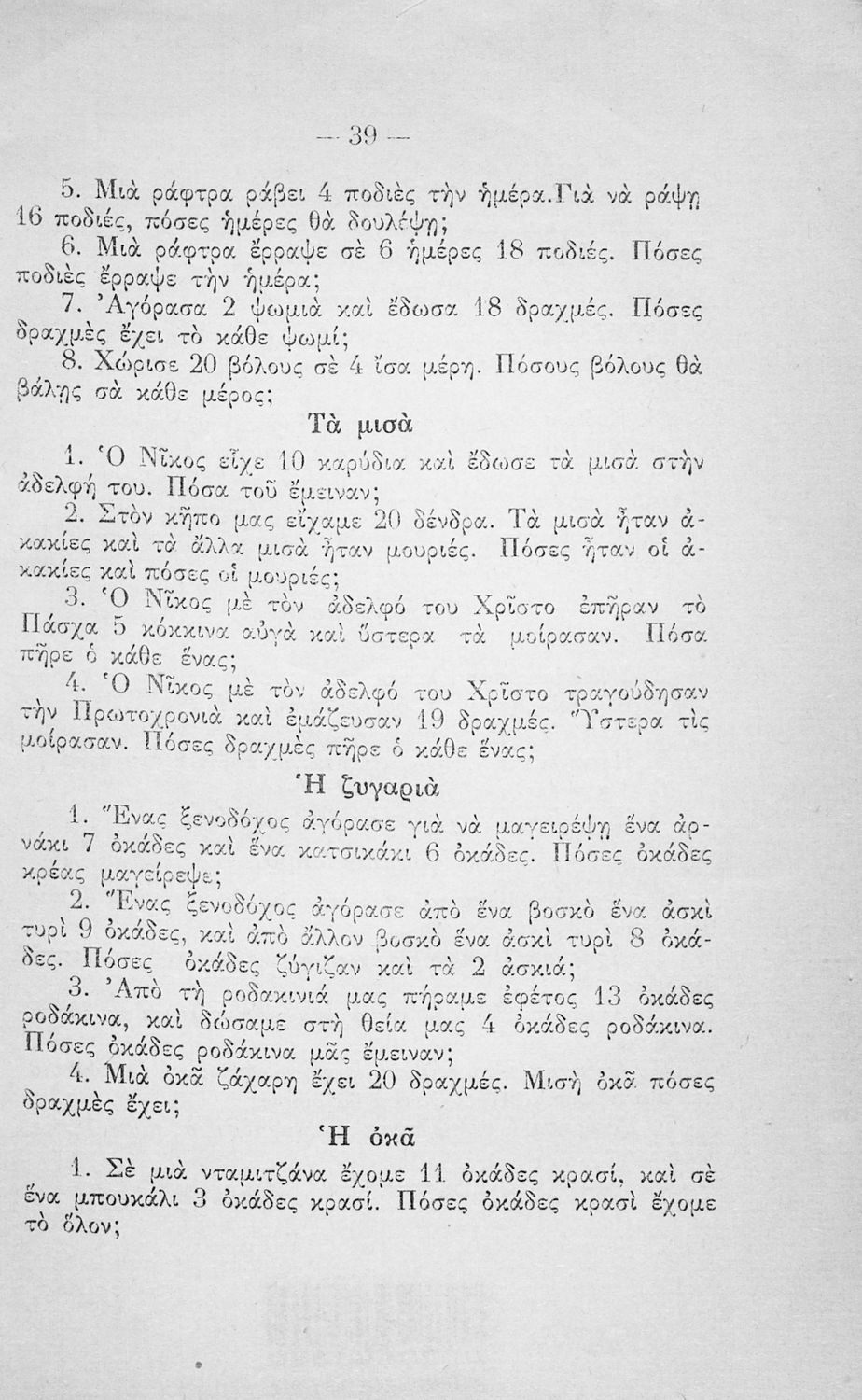 Παρουσίαση περιεχομένου: Το σύγγραμμα ήταν μαθητικό βοήθημα για το μαθήματα των Μαθηματικών στο Δημοτικό. Περιέχει ασκήσεις και θεωρία για τις 4 βασικές πράξεις. Επίσης, έχει προβλήματα με τις βασικές πράξεις. Διαθέτει σχήματα για την αισθητοποίηση των μαθηματικών εννοιών.