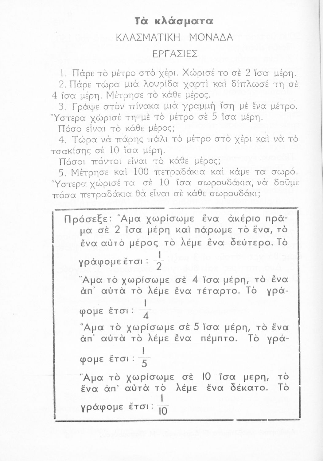 Σχολικό εγχειρίδιο Αριθμητικής Ε΄ Δημοτικού που αναφέρεται αποκλειστικά στα κλάσματα και περιέχει μόνο ασκήσεις.