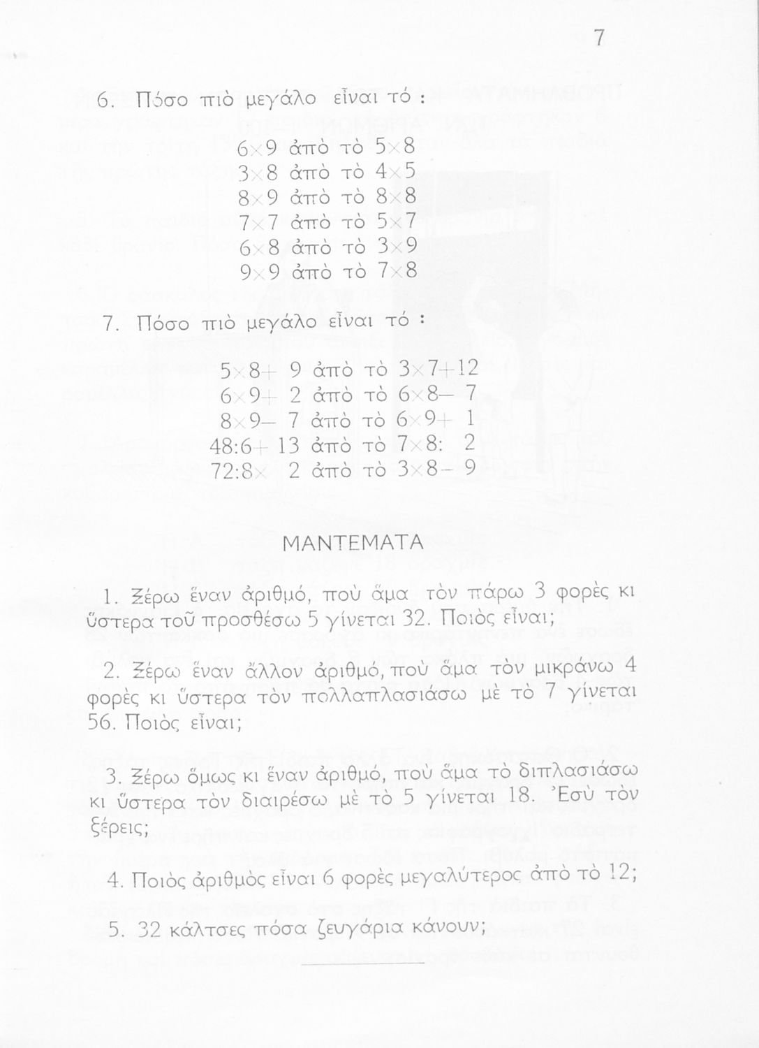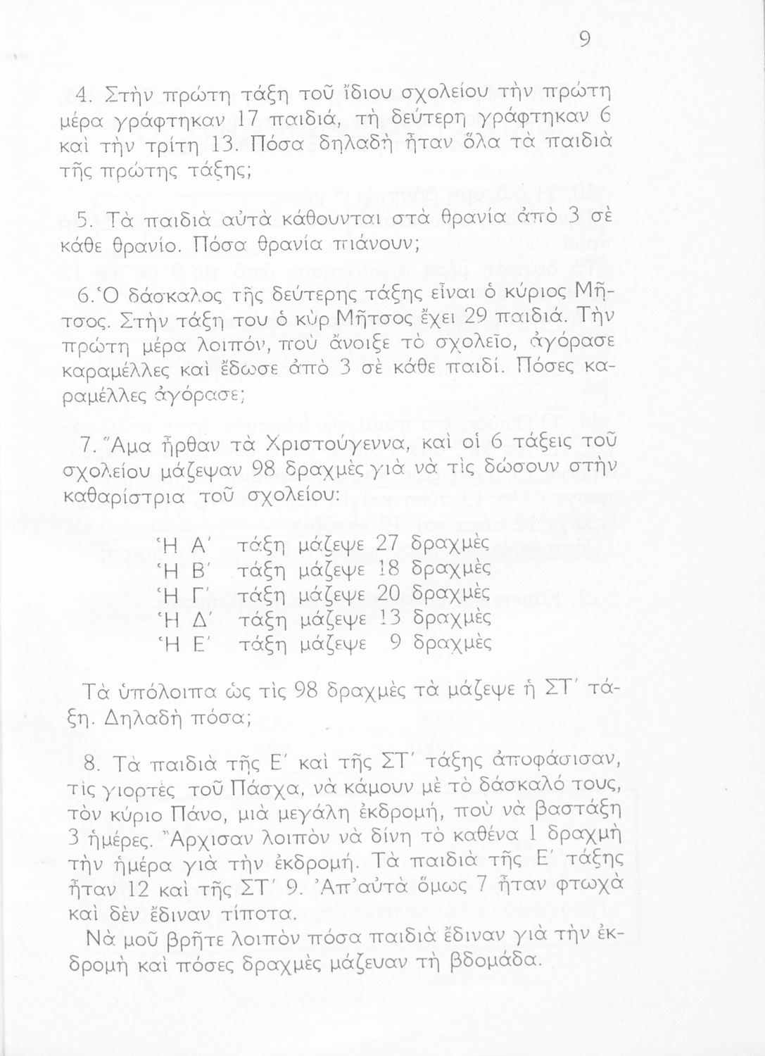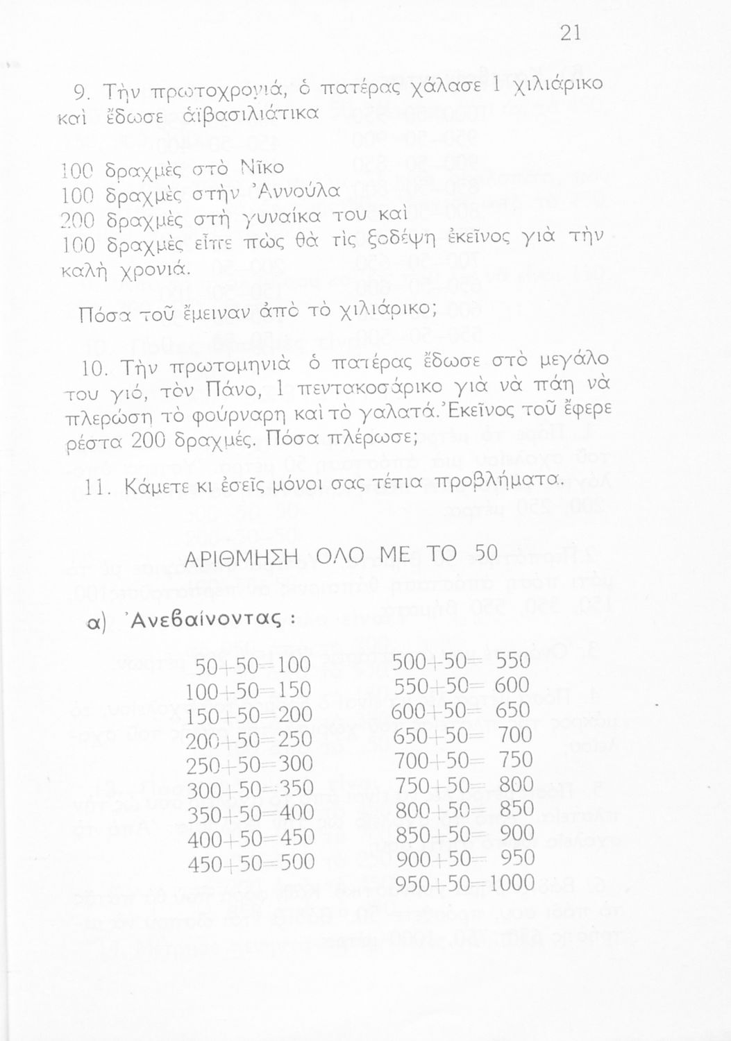 LDR 01193 2200205 4500 035 ## _a03-20560595 040 ## _aΒιβλιοθήκη της Βουλής των Ελλήνων 041 ## _ael 100 ## _aΜ. Παπαμαύρος 110 ## _a20560595 245 0# _aΑριθμητικά προβλήματα του Δημοτικού Σχολείου (νέο σύστημα) τάξη Γ΄ 250 ## _a1η Έκδοση 260 ## _aΑθήνα _bΔημητράκος _c1934 300 ## _a90 _bΕξώφυλλο (έγχρωμο), Σκίτσα (ασπρόμαυρα) _c19 520 ## _aΜαθητικό βοήθημα Μαθηματικών Γ΄ Δημοτικού που περιλαμβάνει τις 4 βασικές πράξεις της αριθμητικής, τους αριθμούς, τα κλάσματα, και τις υποδιαιρέσεις των νομισμάτων. 521 ## _aΓ' Δημοτικού 522 ## _aΕλλάδα 546 ## _aΔημοτική 563 ## _aΜαλακό Εξώφυλλο 650 #4 _aΑριθμητικά προβλήματα _aΑφαίρεση _aΔιαίρεση _aΚλάσματα _aΝομίσματα _aΠολλαπλασιασμός _aΠρόσθεση