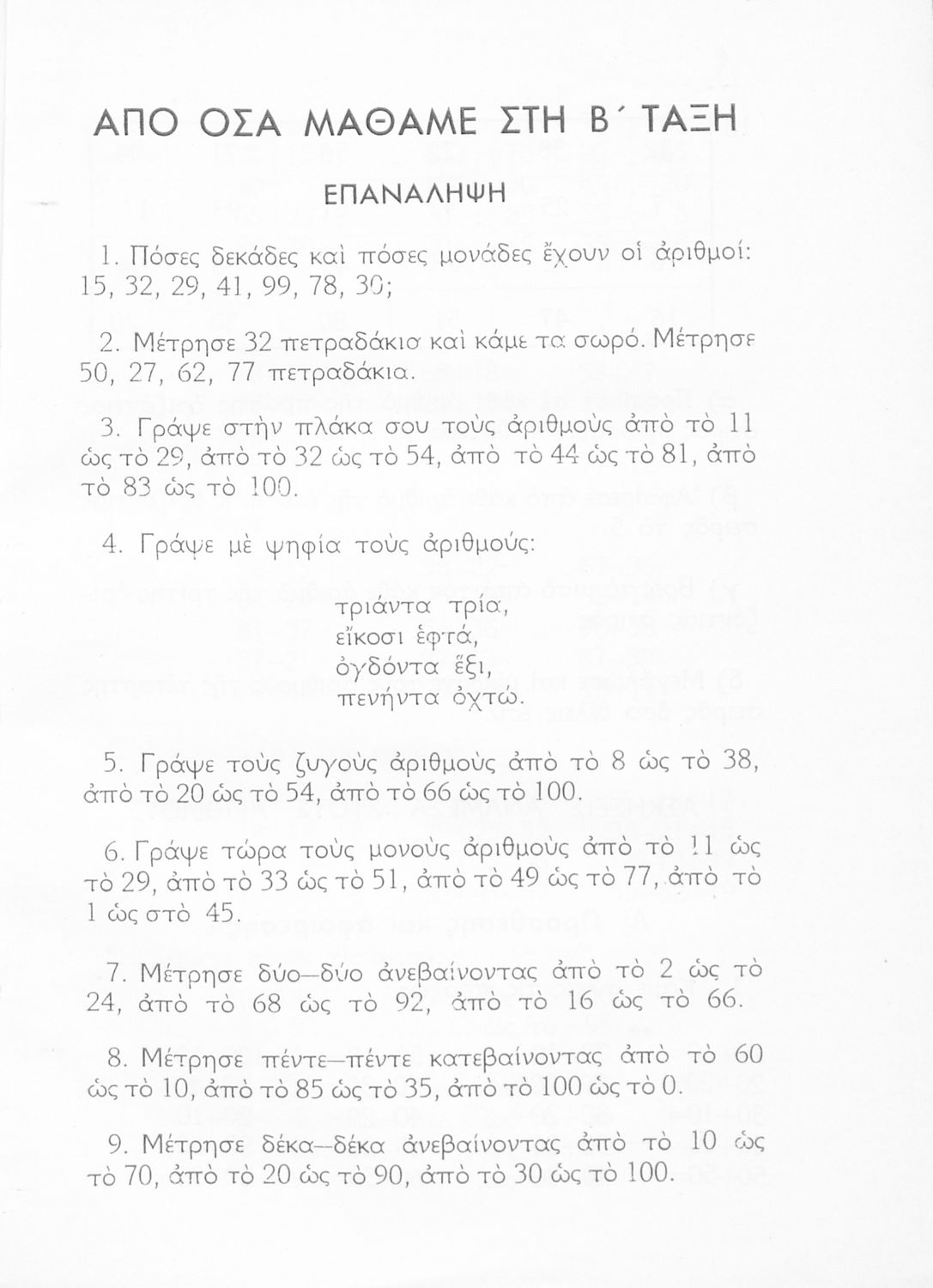 Βαθμίδα εκπαίδευσης: Πρωτοβάθμια Τάξη: Γ' Δημοτικού Μάθημα: Μαθηματικά Γλώσσα: Δημοτική Παρουσίαση περιεχομένου: Μαθητικό βοήθημα Μαθηματικών Γ΄ Δημοτικού που περιλαμβάνει τις 4 βασικές πράξεις της αριθμητικής, τους αριθμούς, τα κλάσματα, και τις υποδιαιρέσεις των νομισμάτων. |